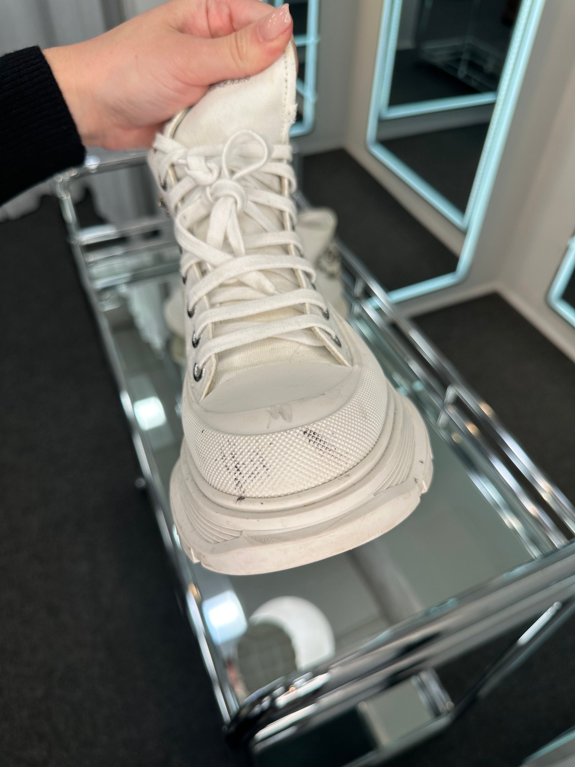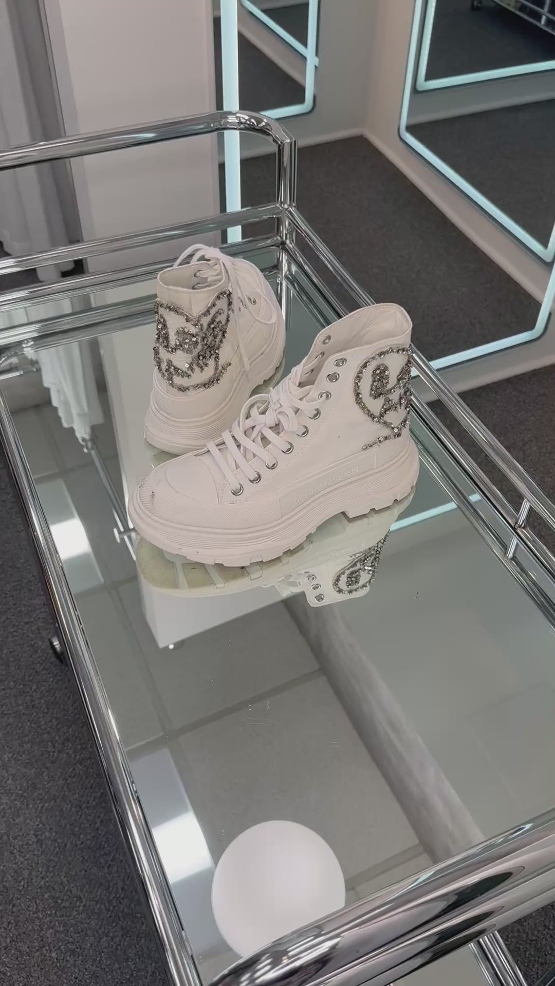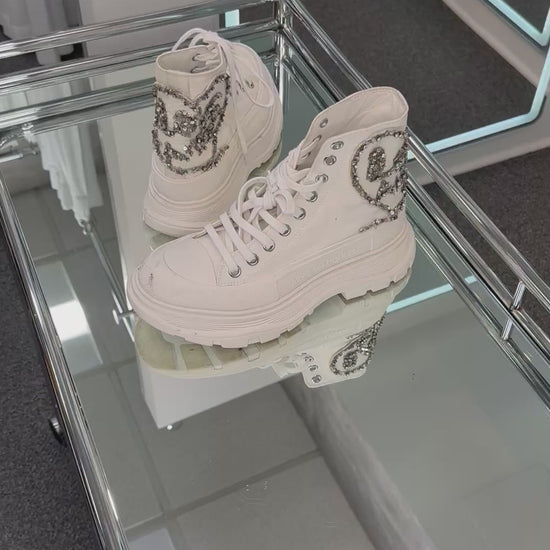 - White canvas, rubber platform and tread, lace-up, crystal embellished "love me", round toe