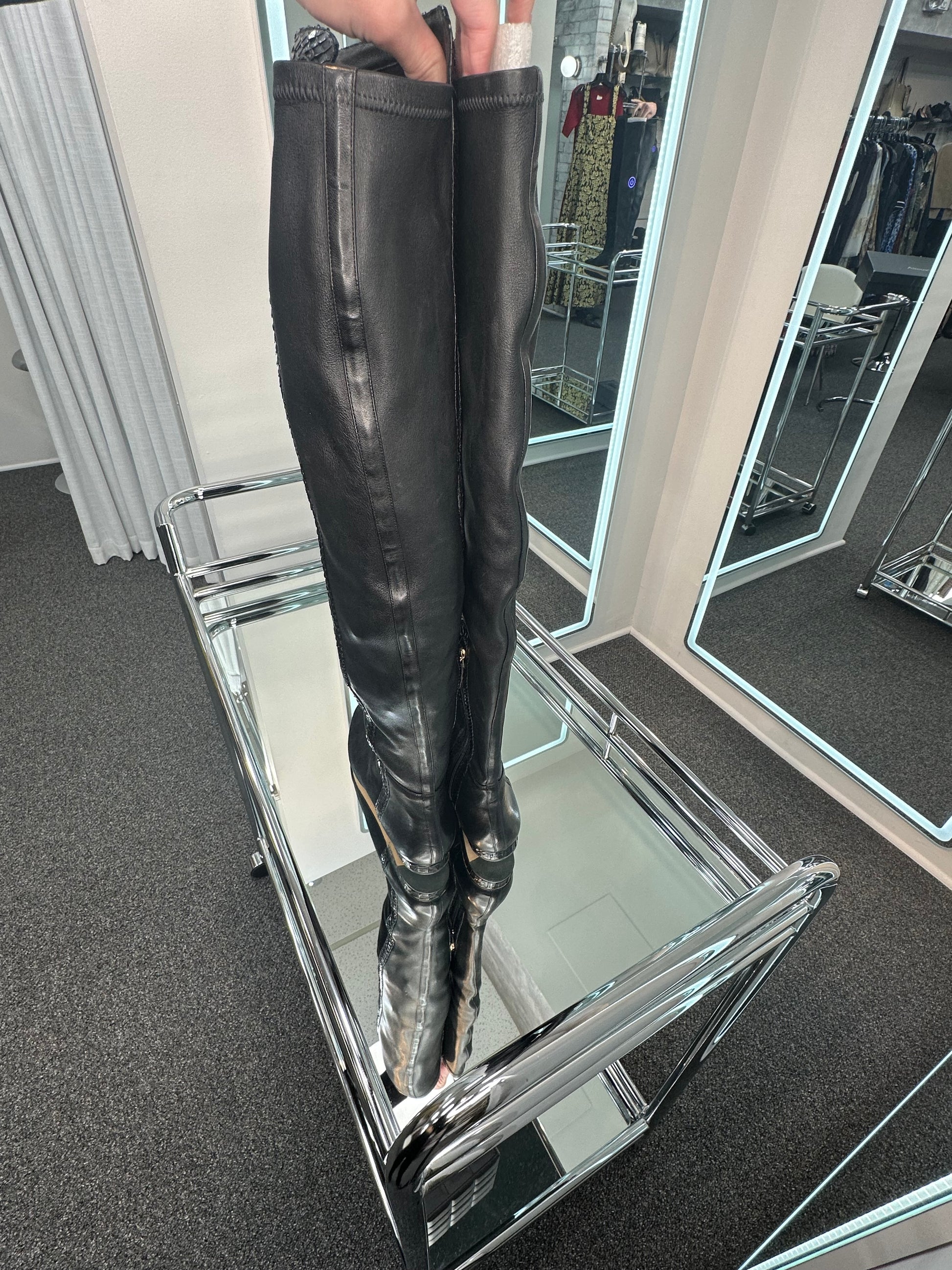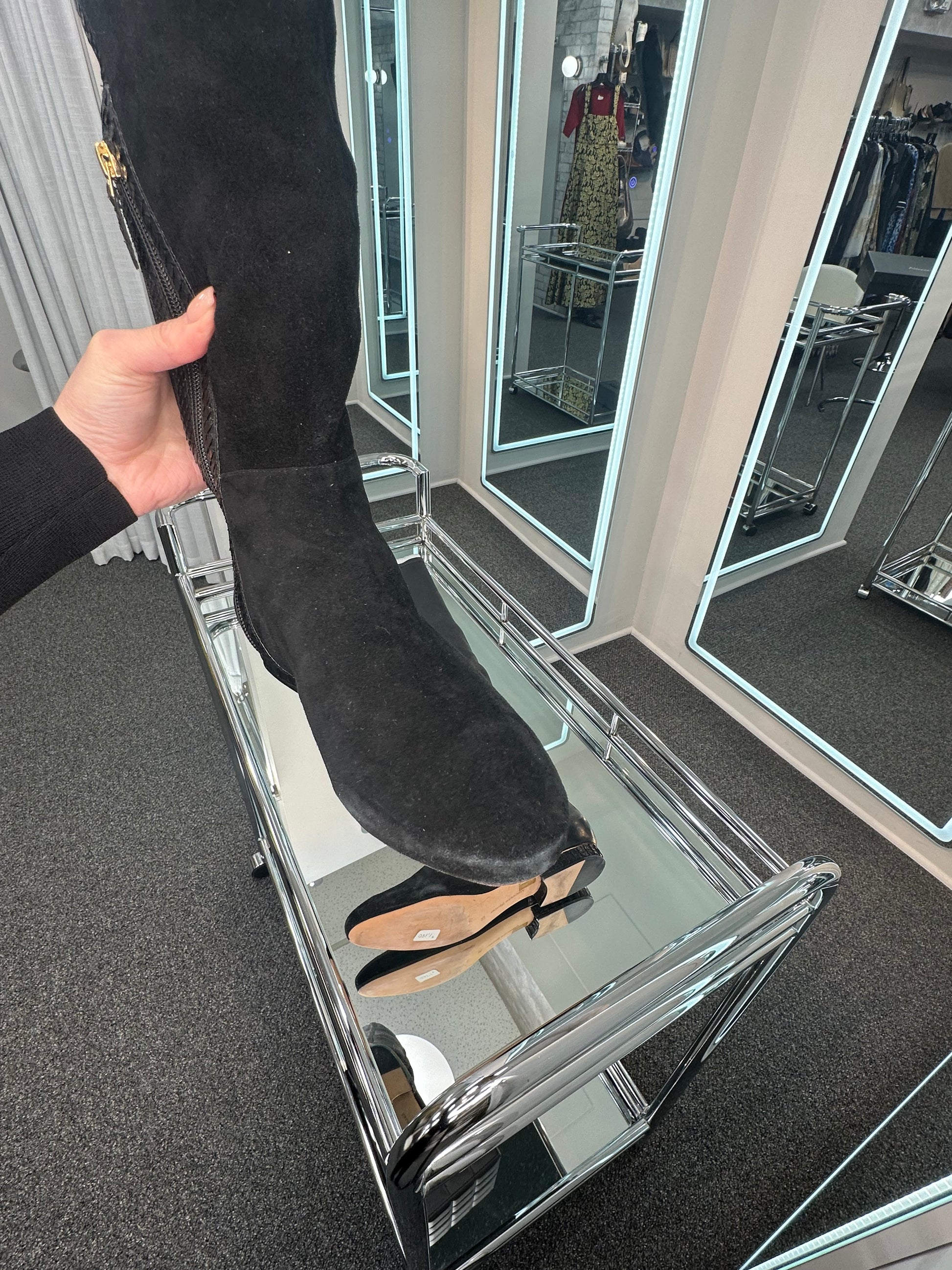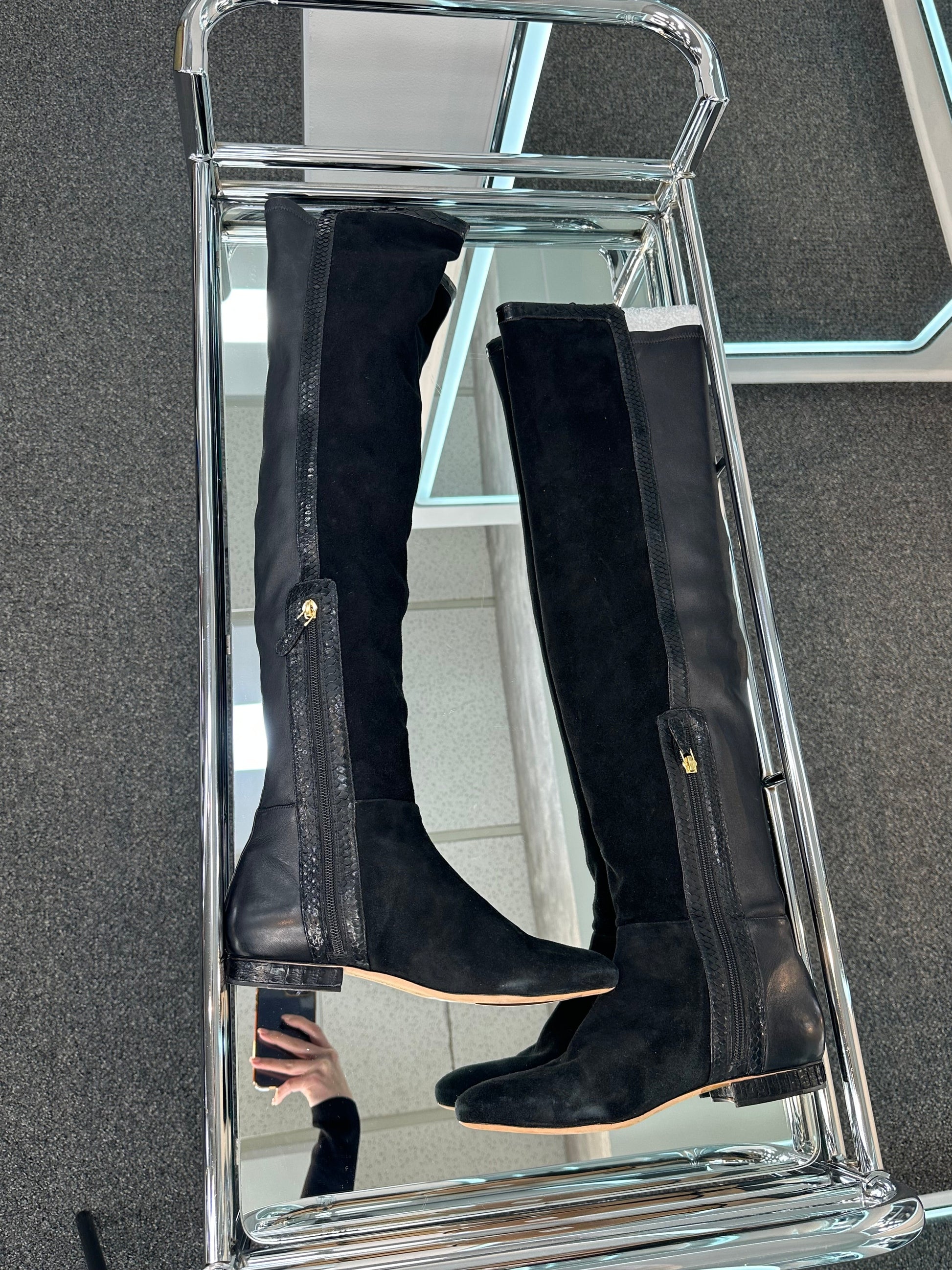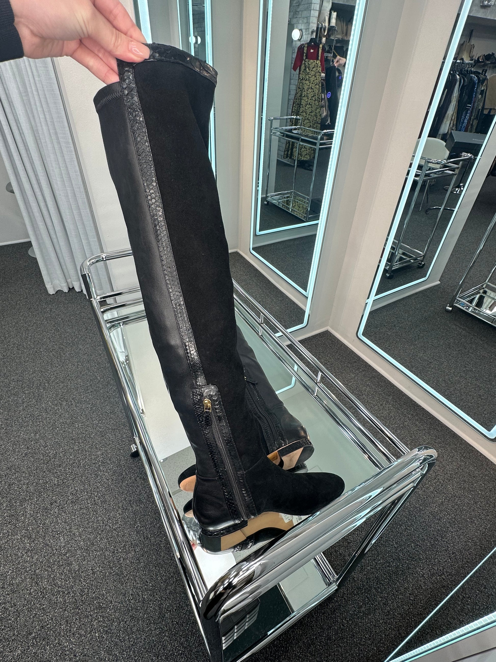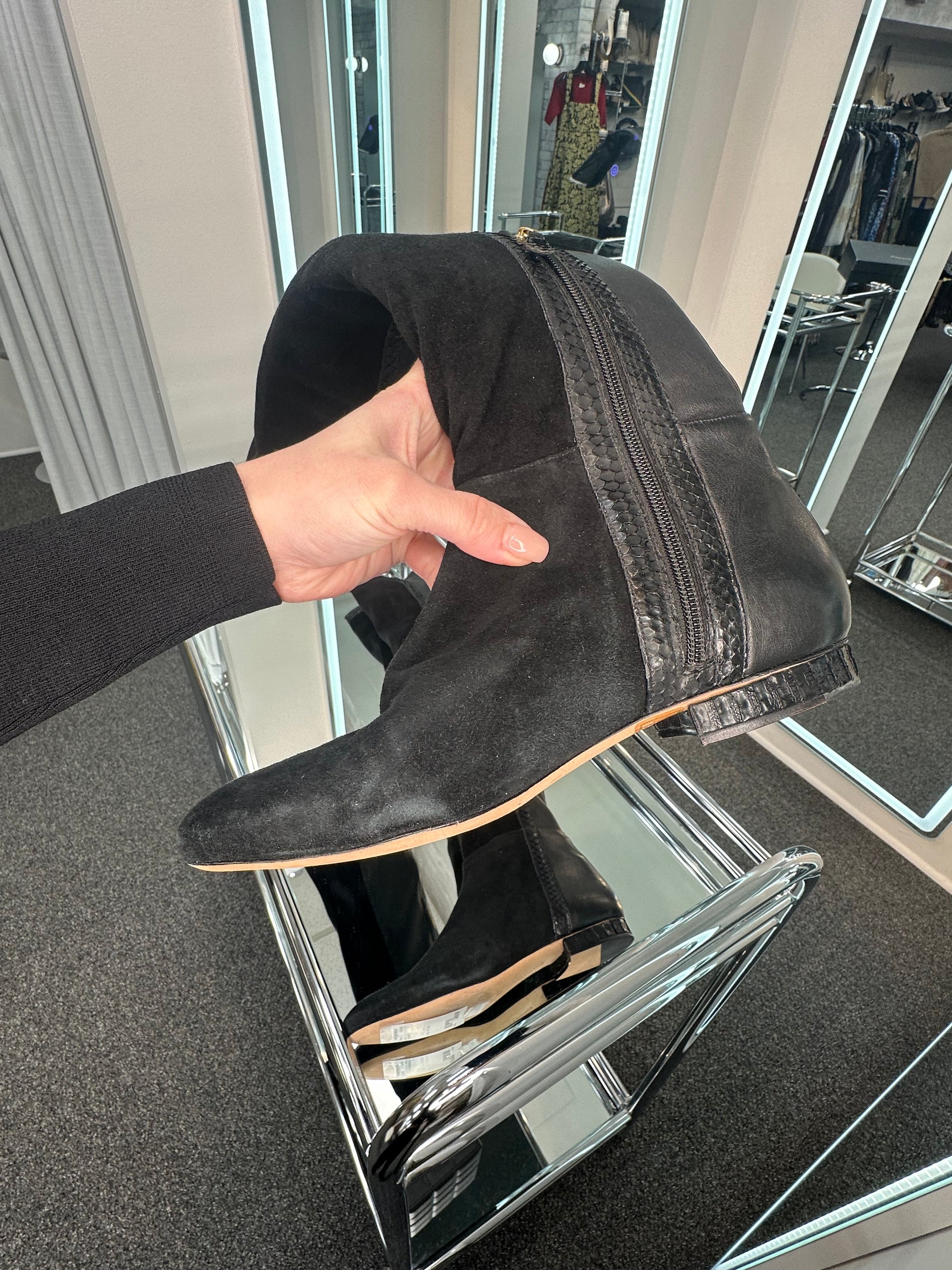 - Black leather and suede with snake skin detailing, interior zipper, small stacked heel, almond toe
