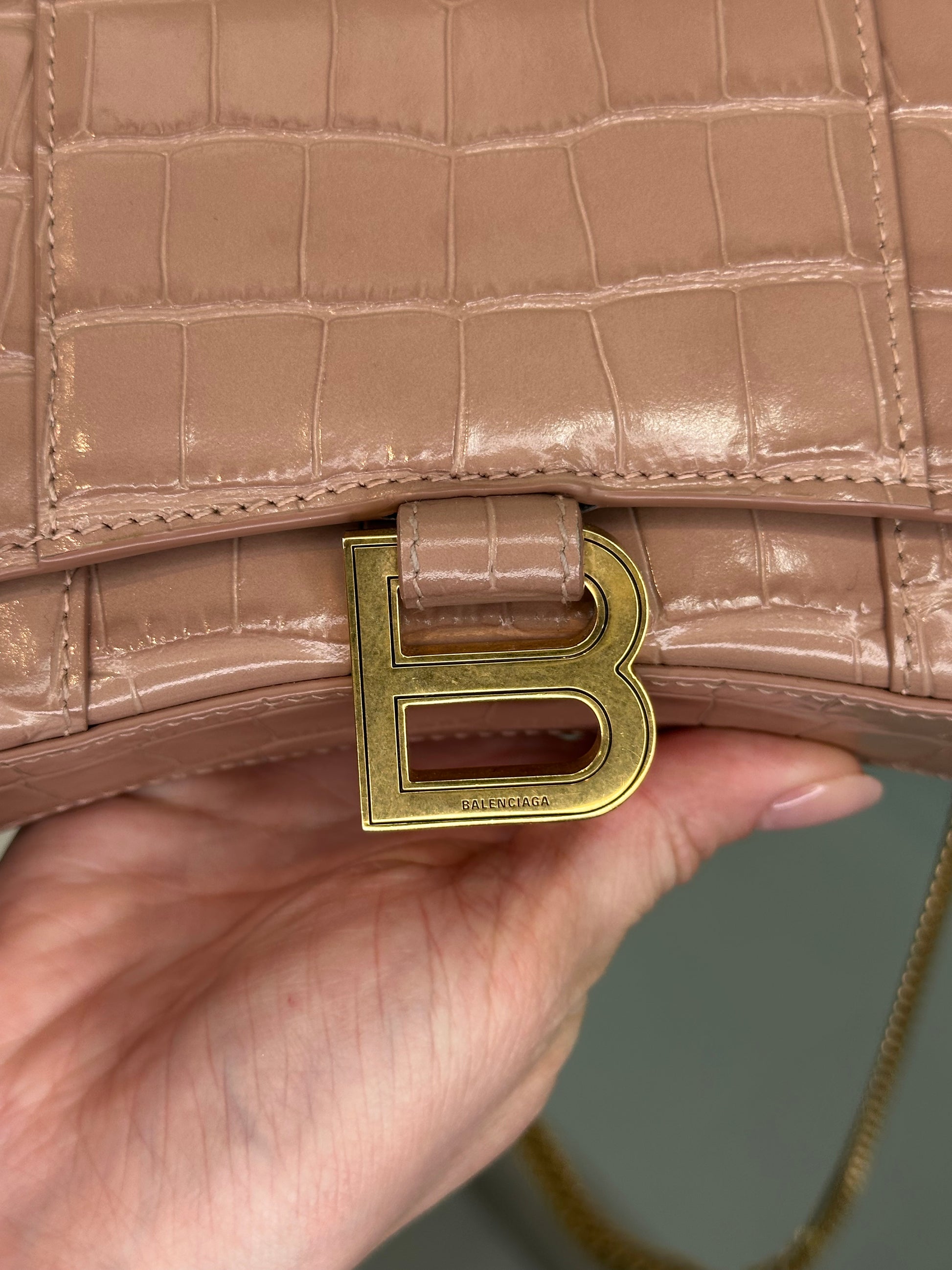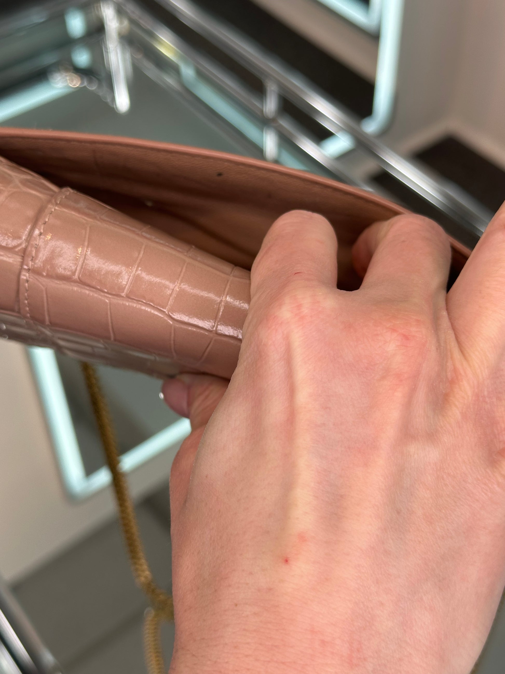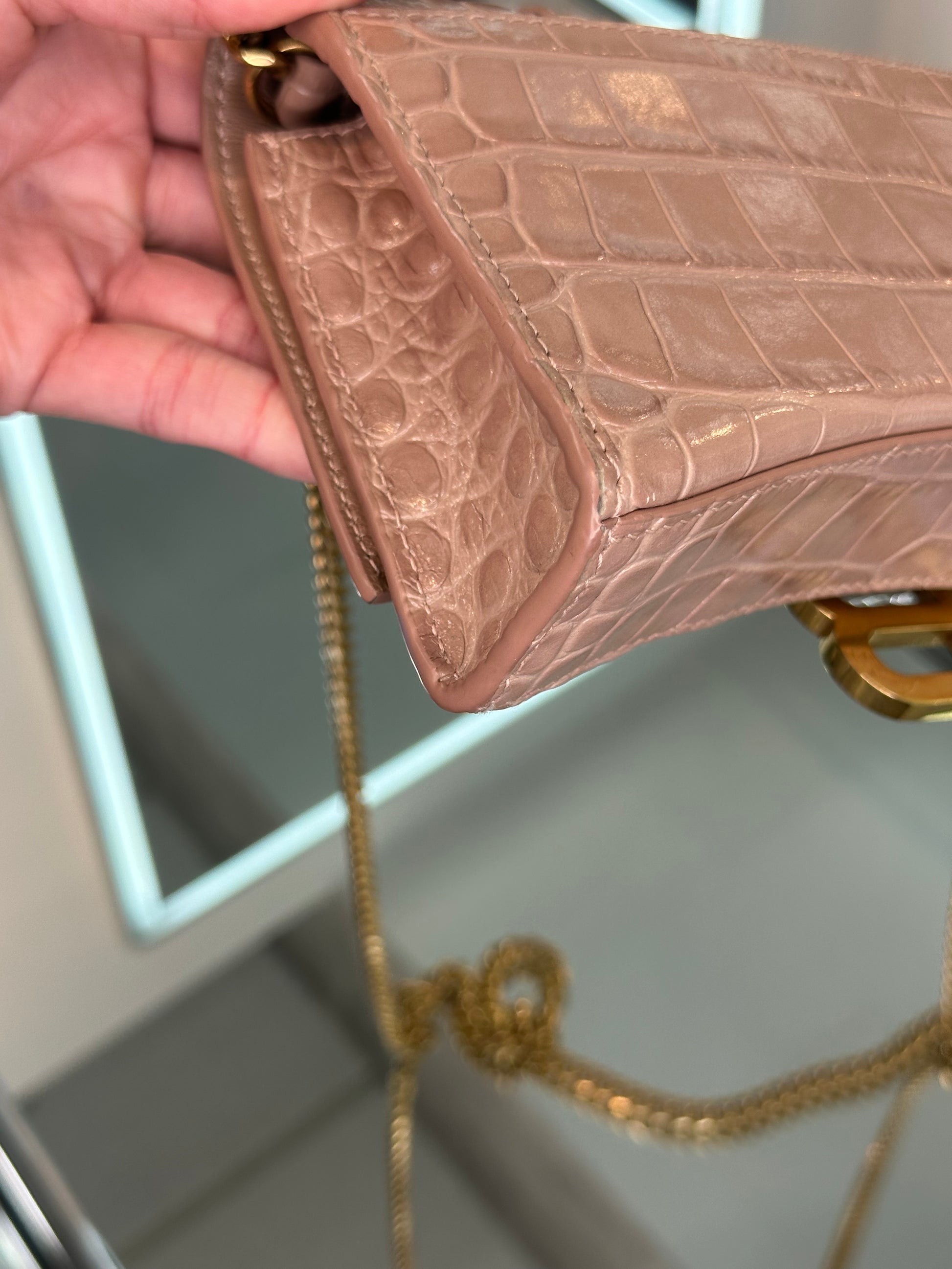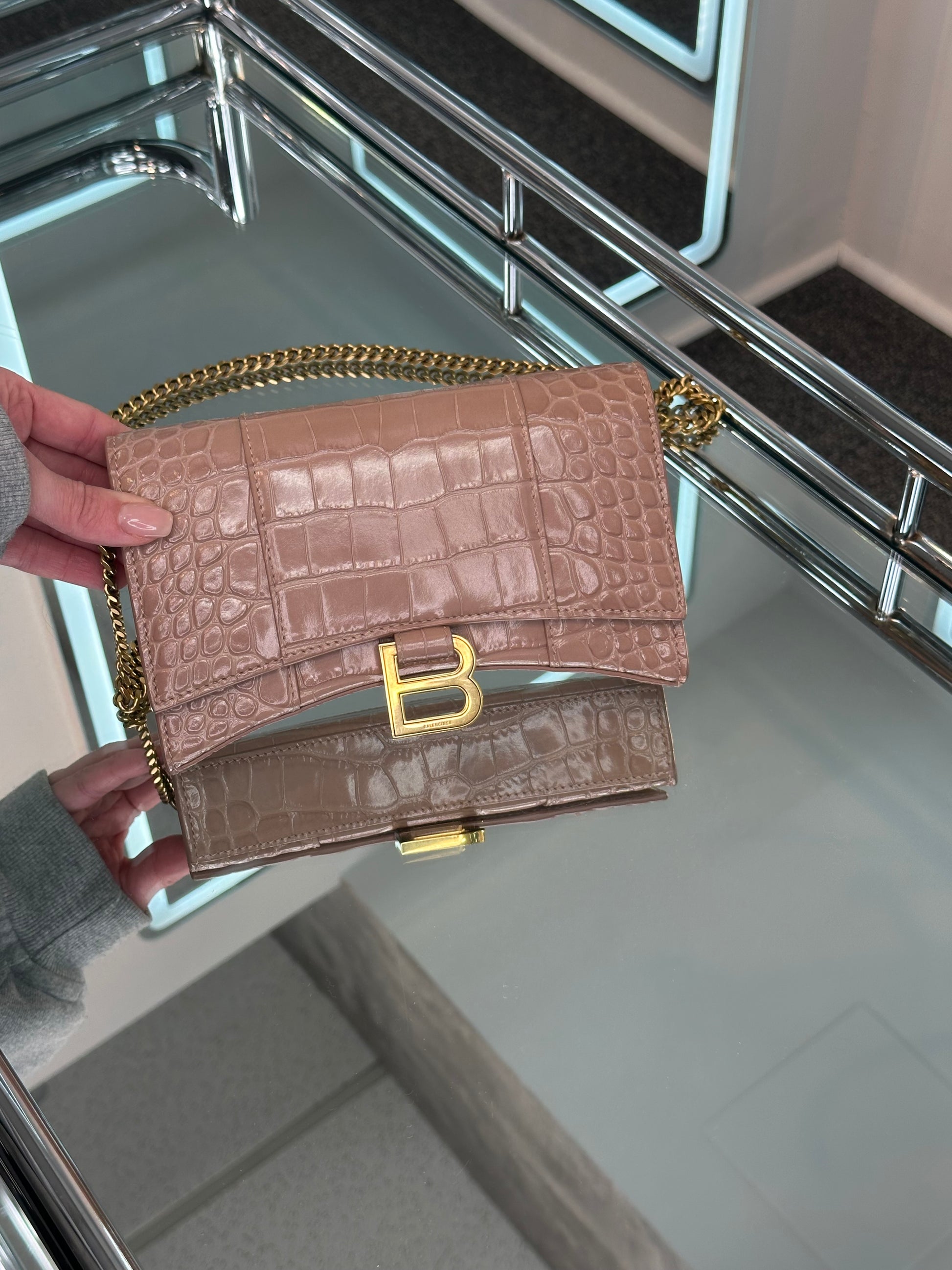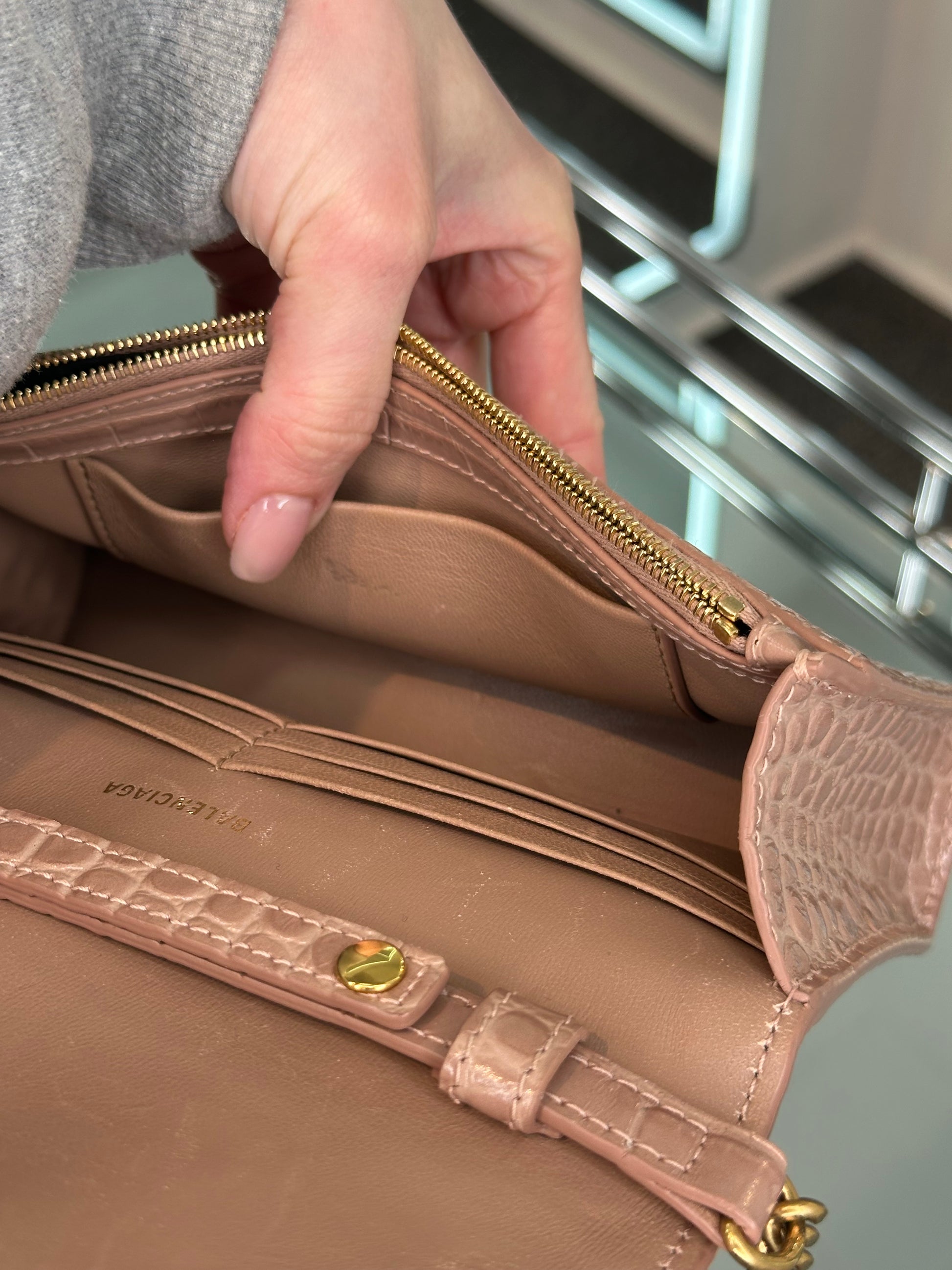 - Blush croc embossed leather, gold-tone hardware, removable crossbody strap, credit card slots, single small interior open pocket, single zip pocket, open single flap, single exterior open flap in the back, leather lining