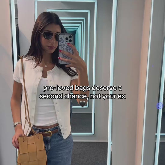- Woven brown calf leather, single shoulder strap, unlined, drawstring closure