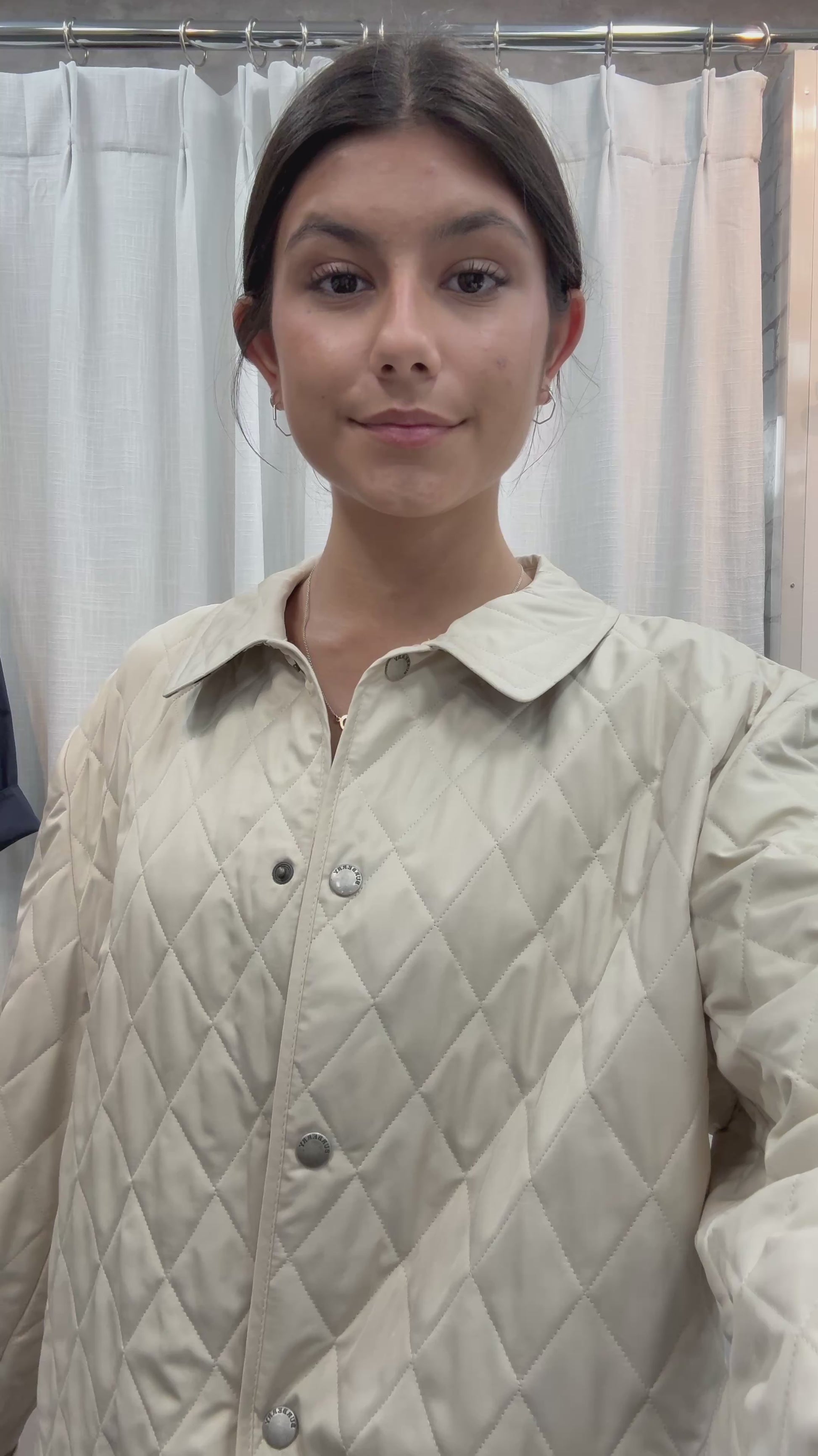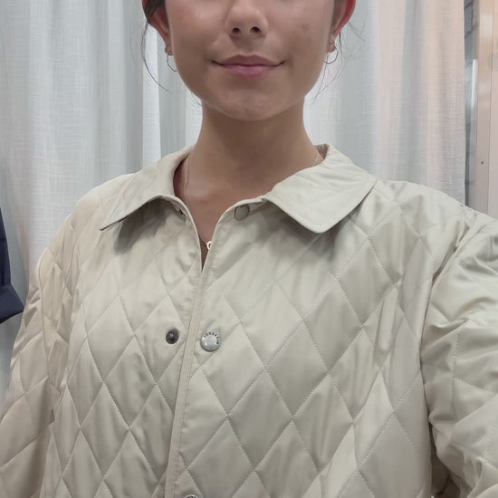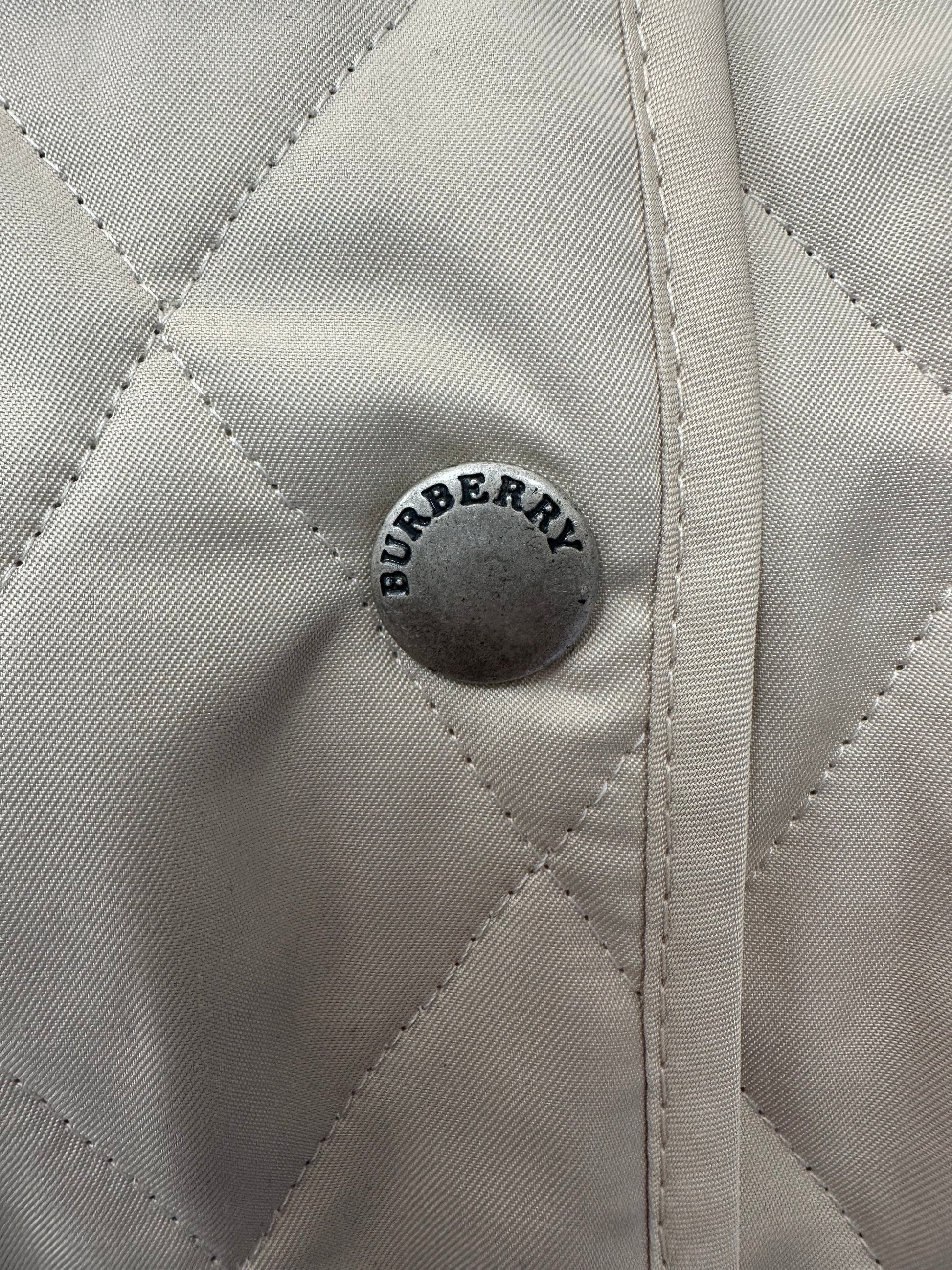 - Beige quilted, pointed collar, snap closure, Burberry signature plaid interior, quilted stitch pattern exterior, patch pockets