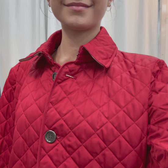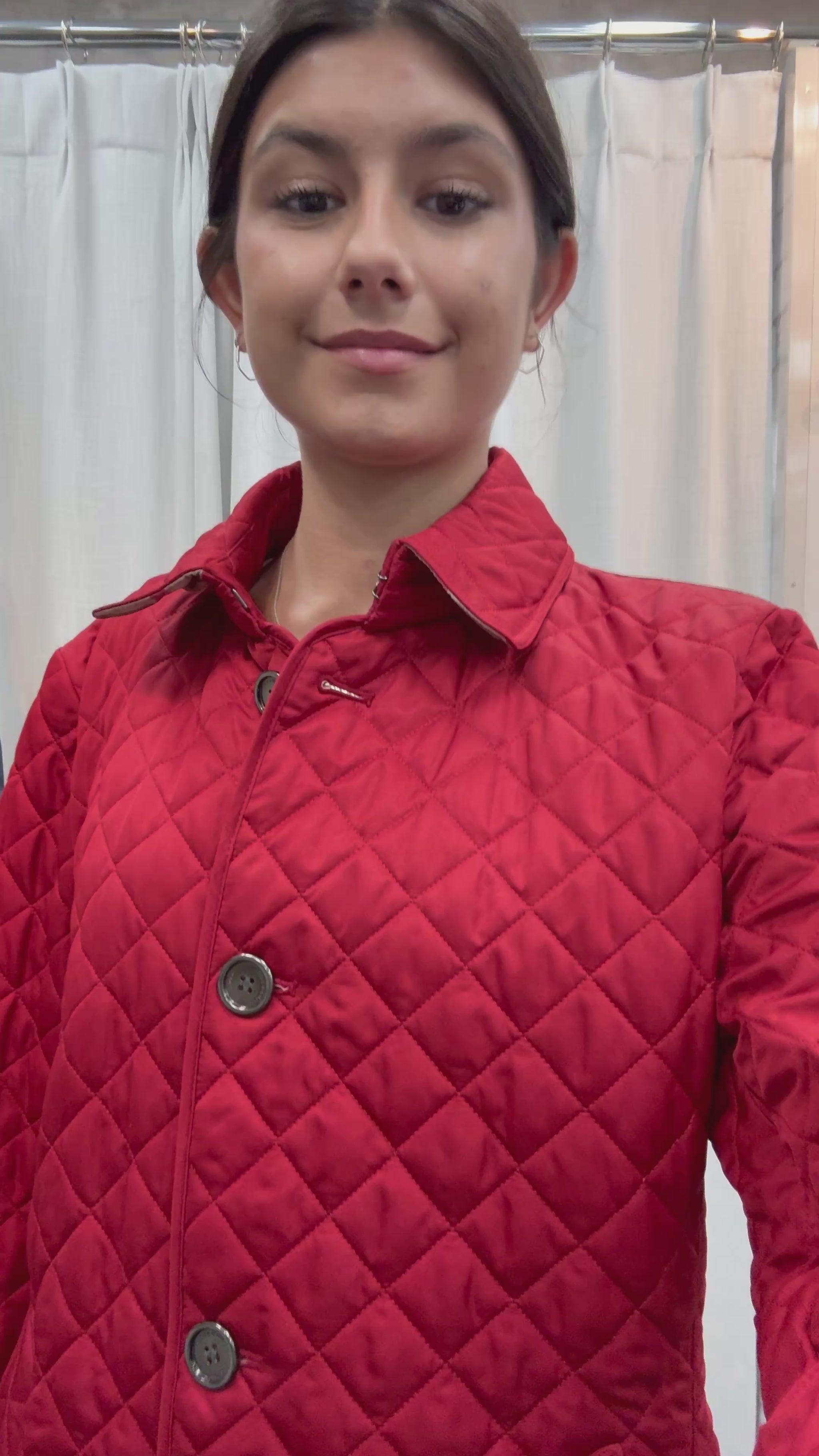- Red quilted, nova check pattern detail, pointed collar, button closure, front pockets