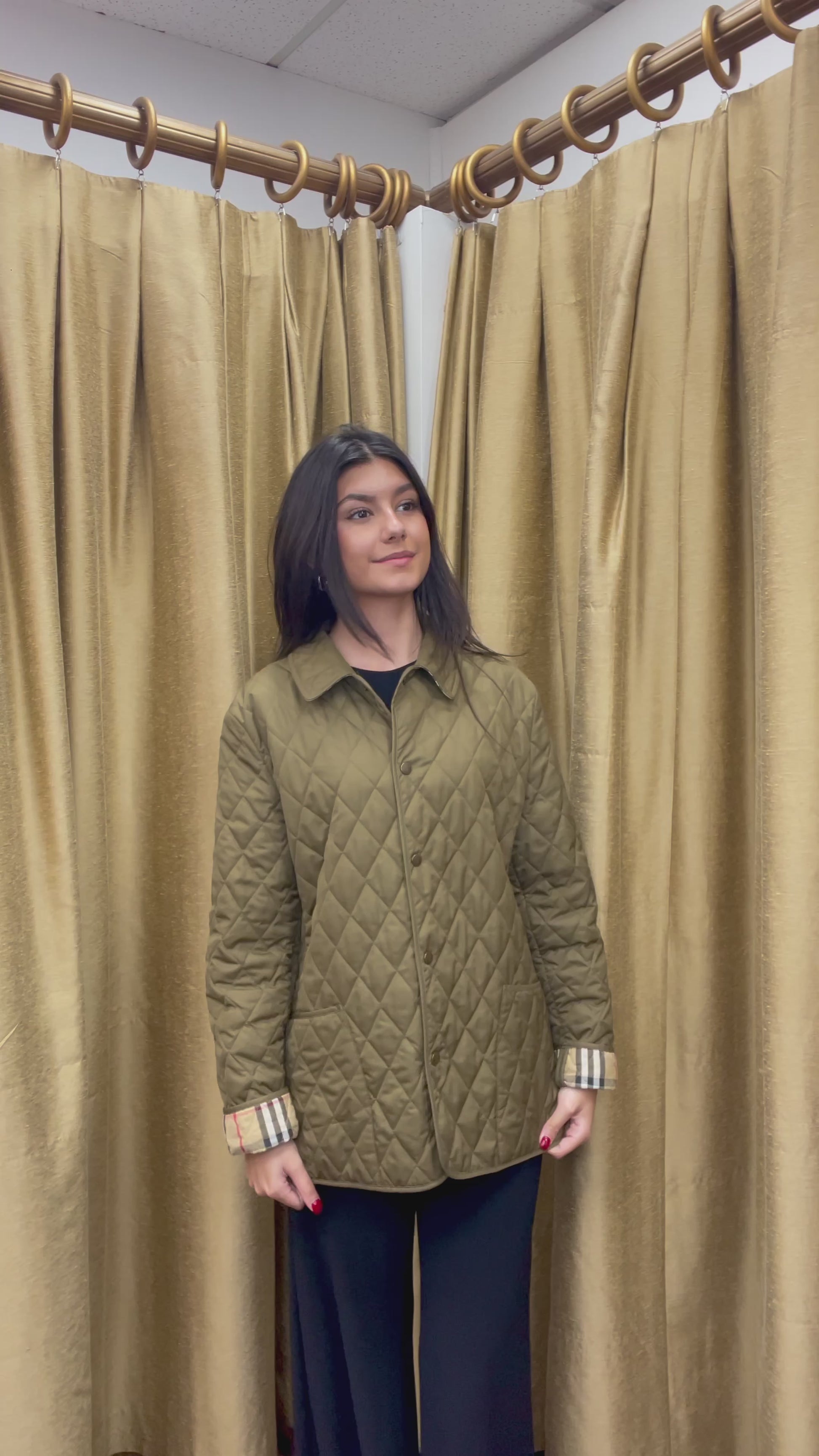 - Quilted stitching, pockets on front, snap closure, Burberry signature lining