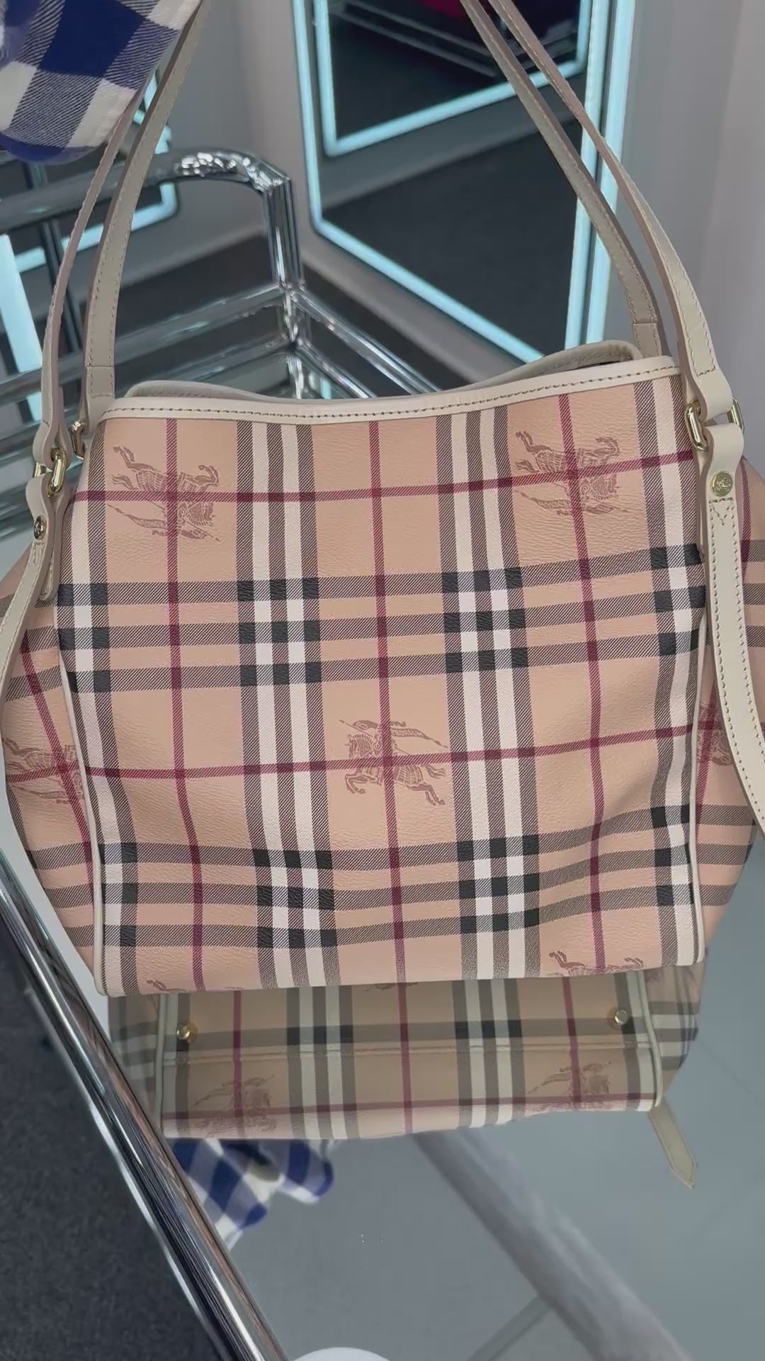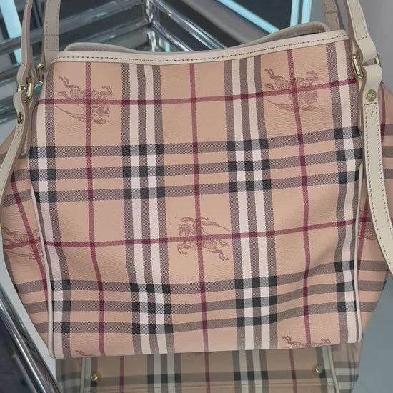 - Coated canvas in the signature Burberry plaid pattern, cream leather trim, gold-tone hardware, dual flat handles, protective feet at base, magnetic snap closure, detachable interior pouch