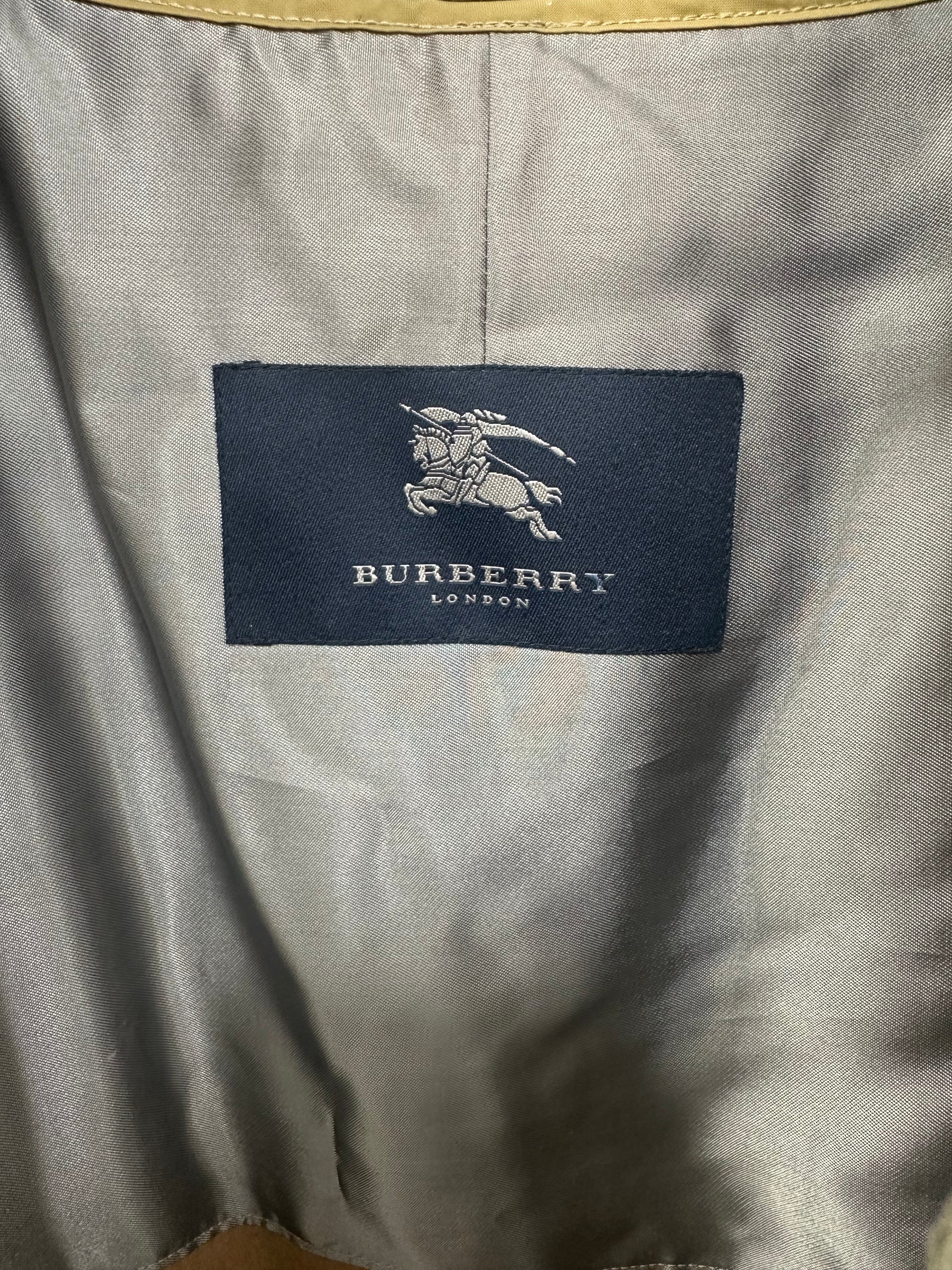 - Olive with grey undertones, detachable wool lining, classic Burberry plaid lining, button closure, pointed collar