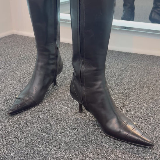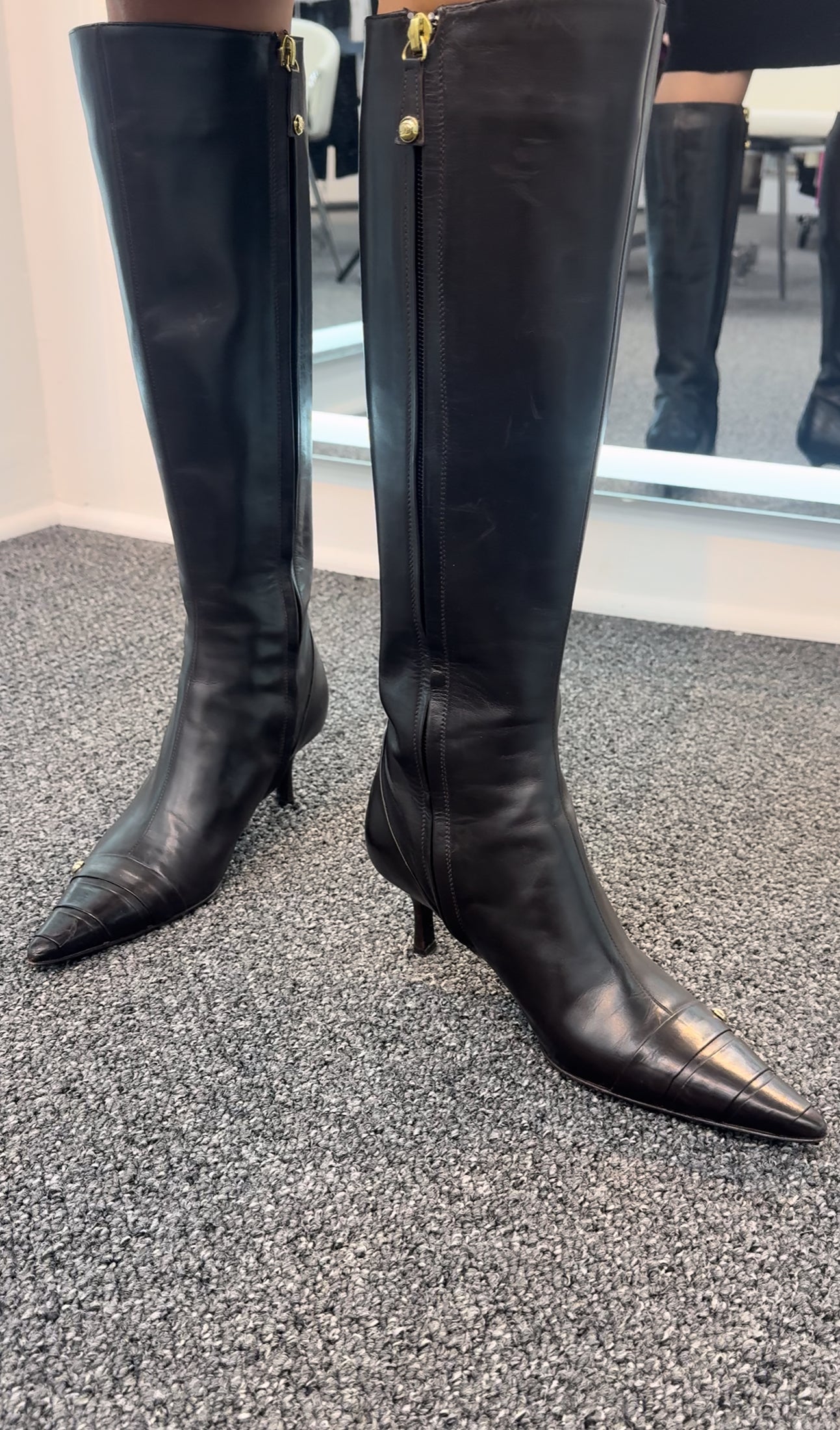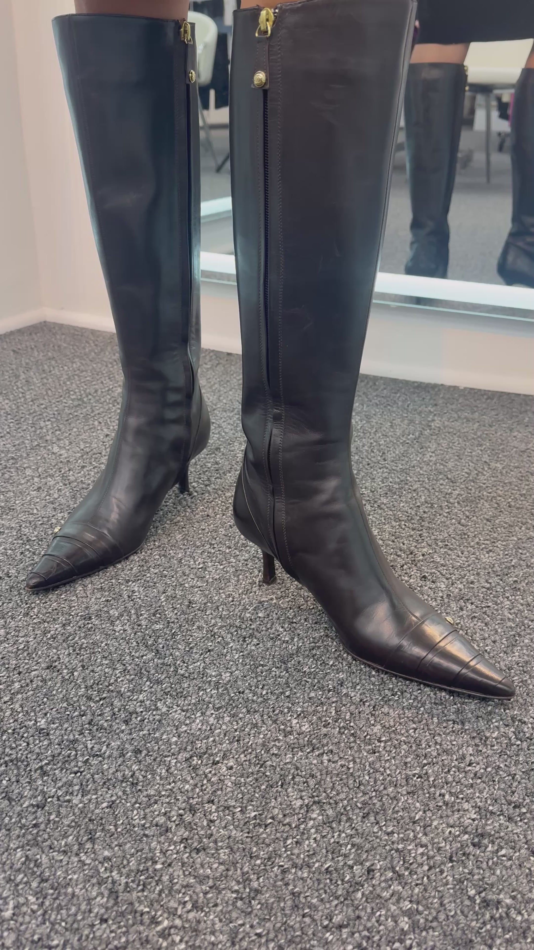 - Brown leather, pointed toe, interior zip, kitten heel, gold-tone hardware, engraved logo stud on exterior toe and matching toggle