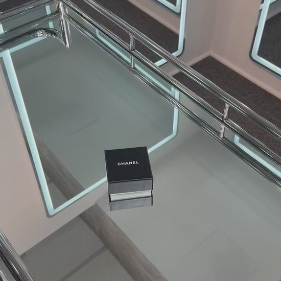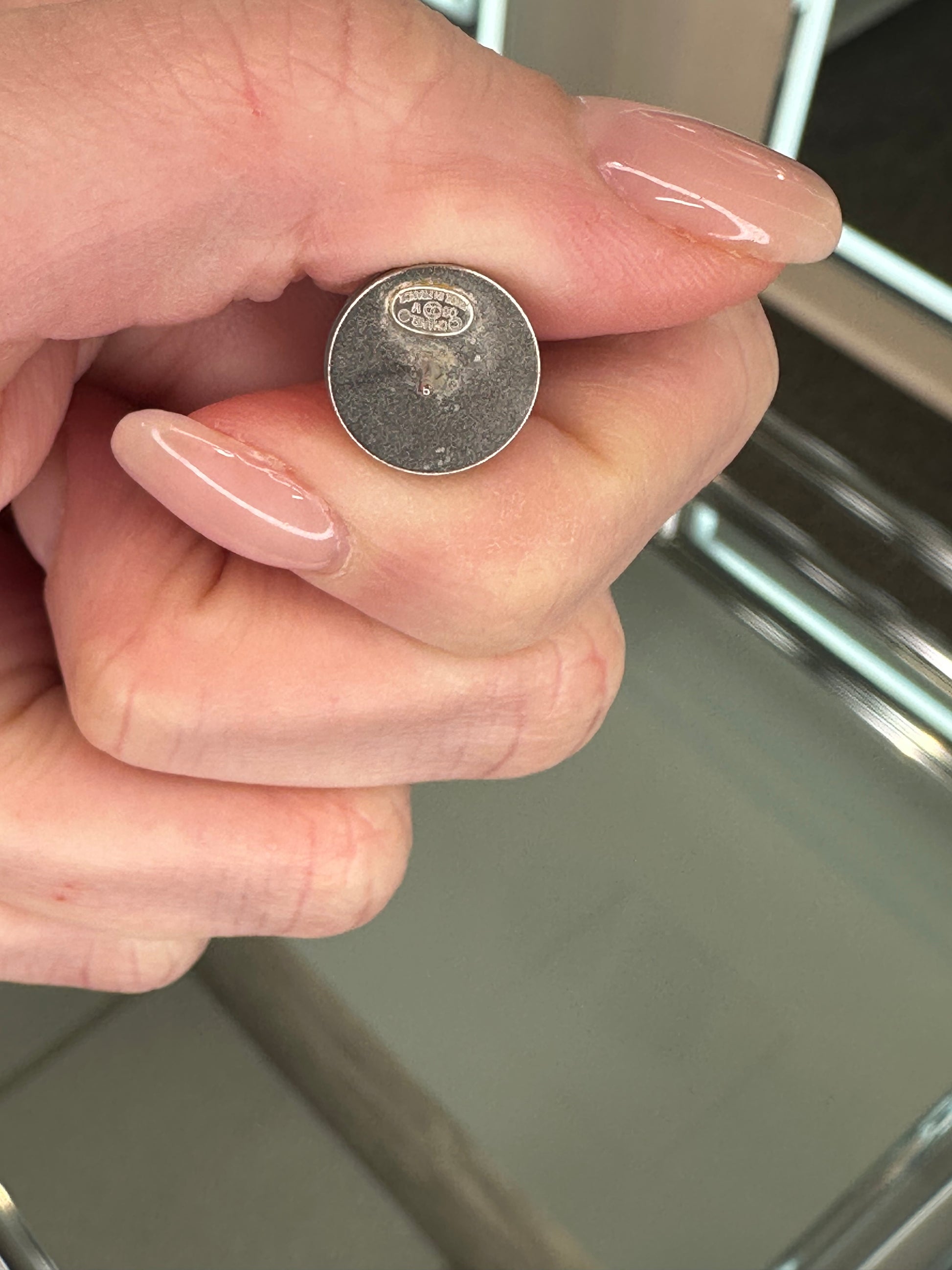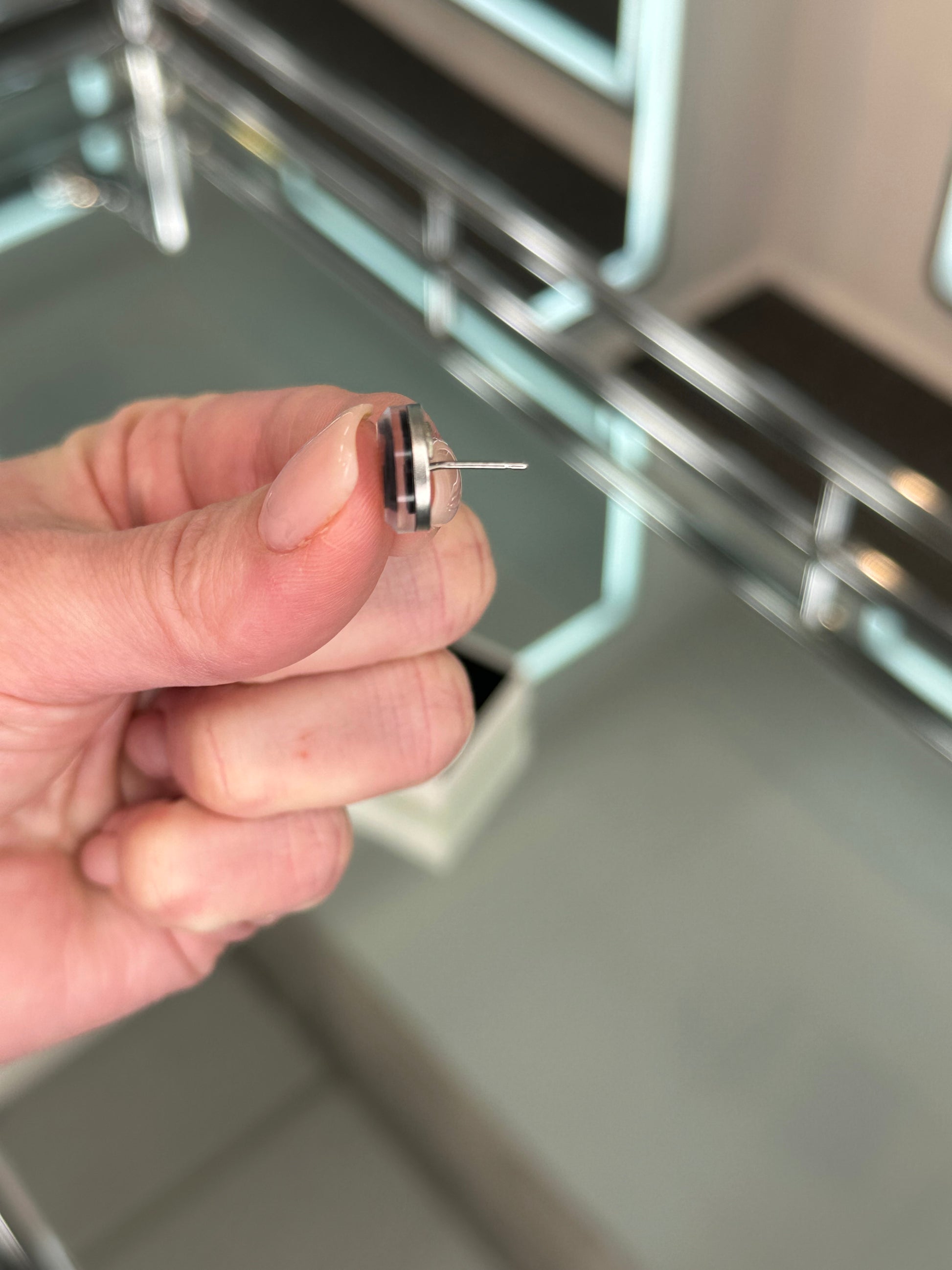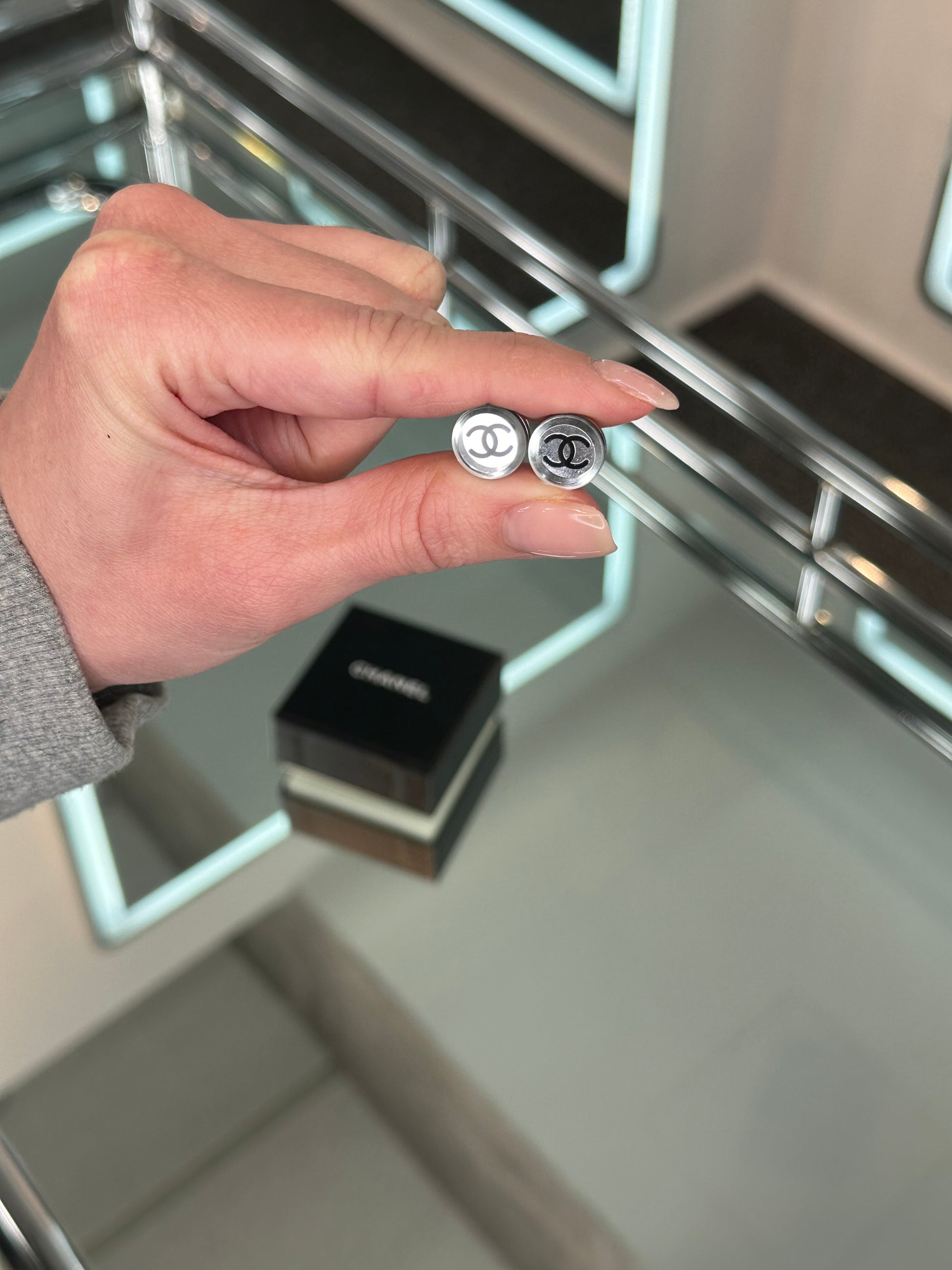 - Mirrored stud earrings with a black Chanel logo at the center
