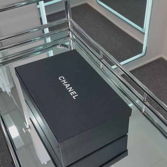 - Crinkled glazed black leather, black enamel and gold-tone lucky charm hardware, gold-tone metal logo on stacked heel, round toe