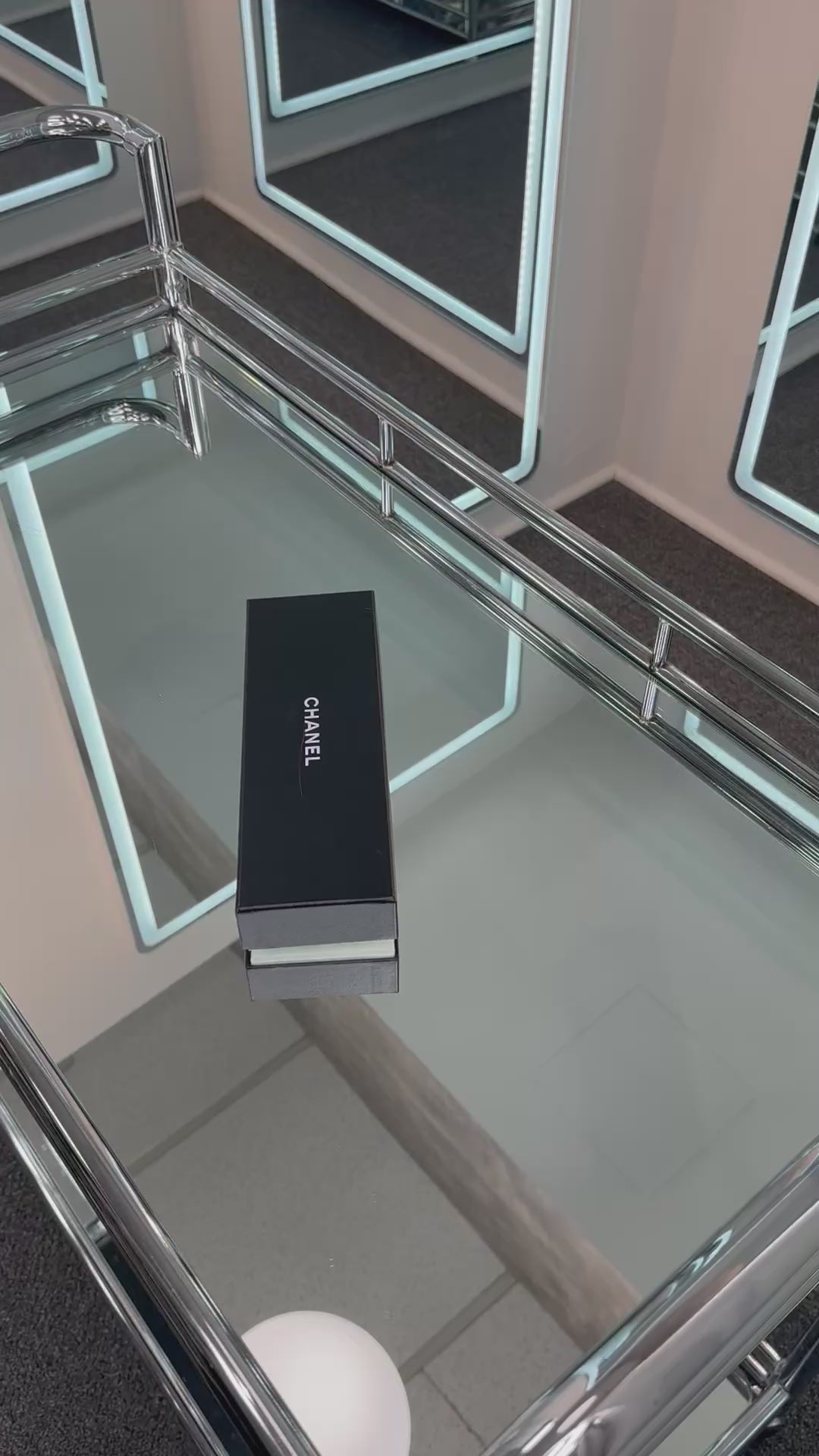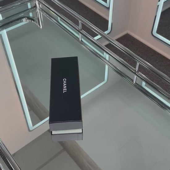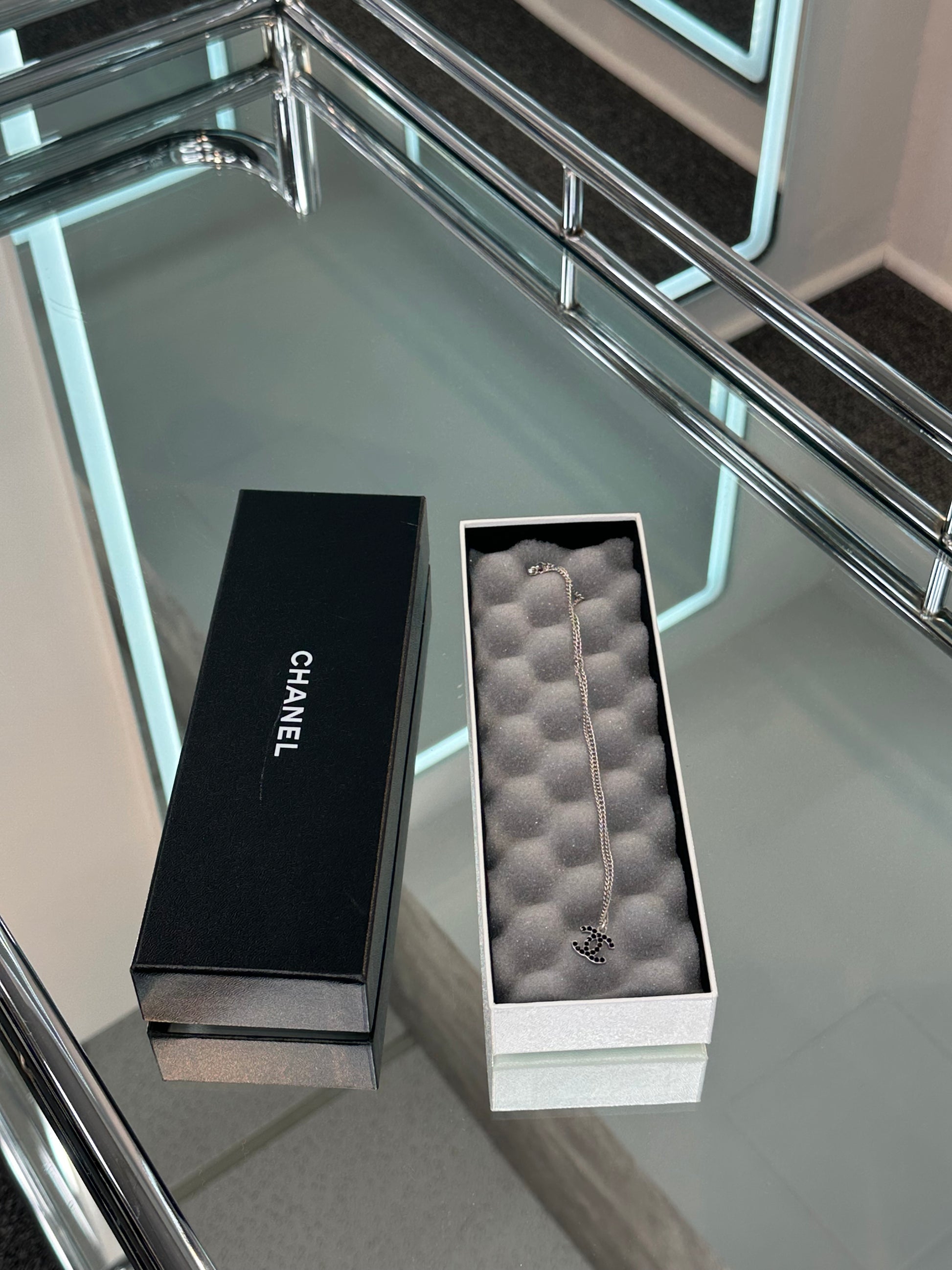 - Double sided black crystal Chanel logo pendant, brushed silver-tone metal, lobster clasp