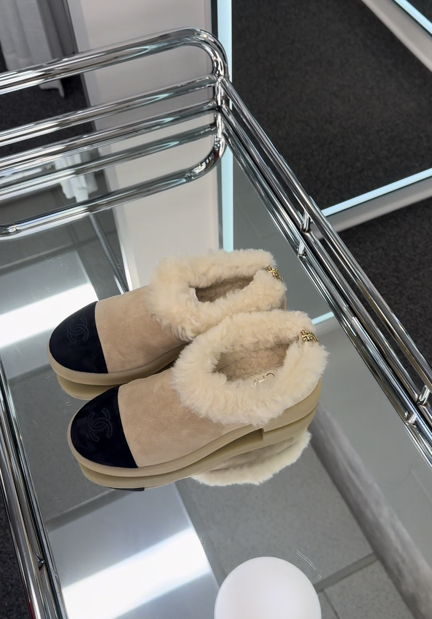 - Suede calfskin and shearling, beige with a black cap toe, beige rubber platform and heel, gold-tone logo and zipper