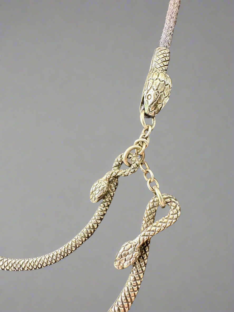 - Silver-tone hardware, double snakes attached by snake heads, on a brown braided rope