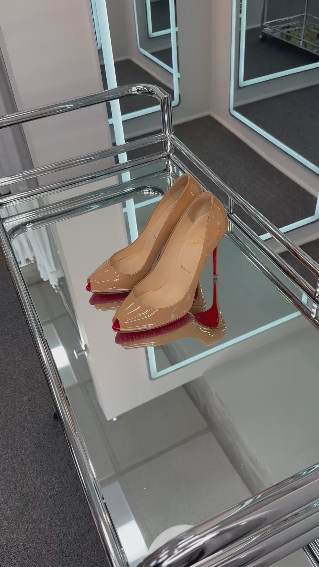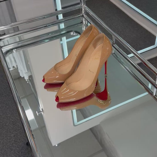- Nude patent, stiletto heel, micro peep-toe with red patent