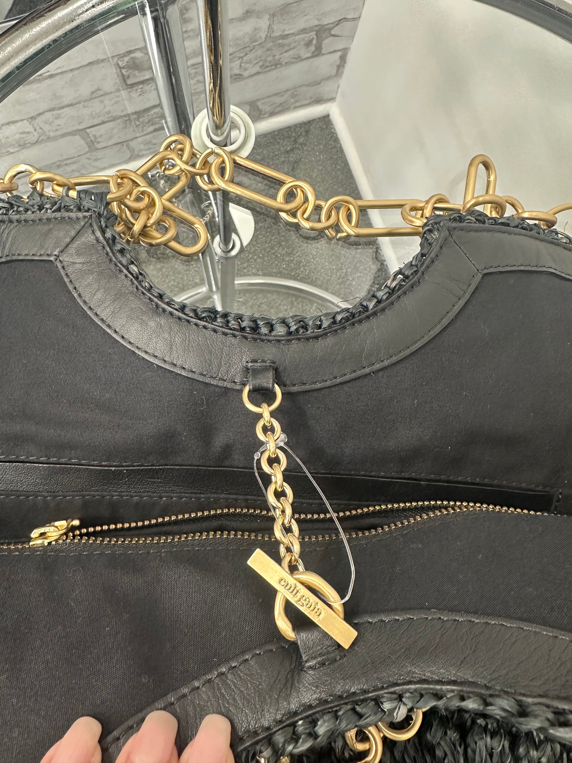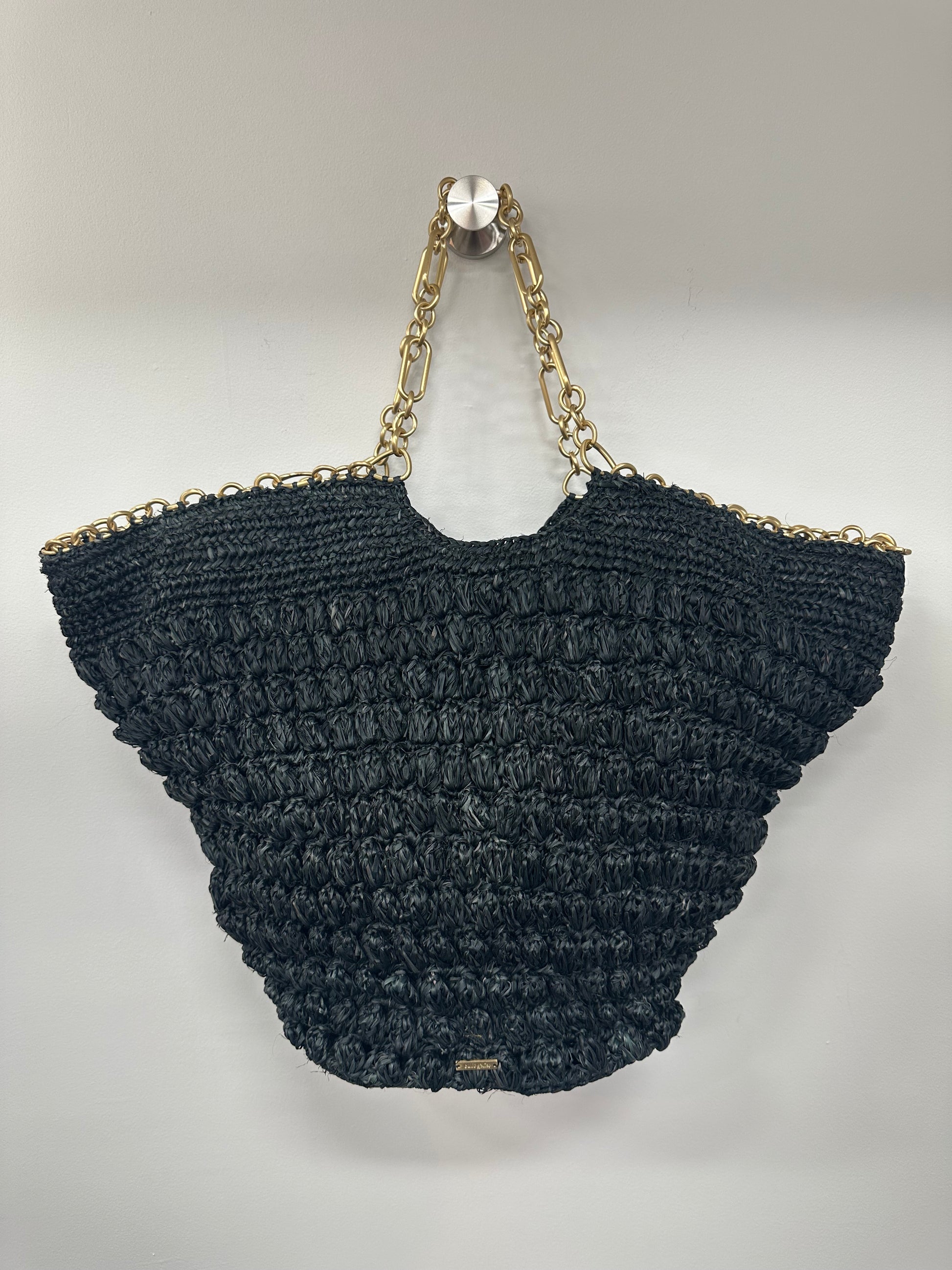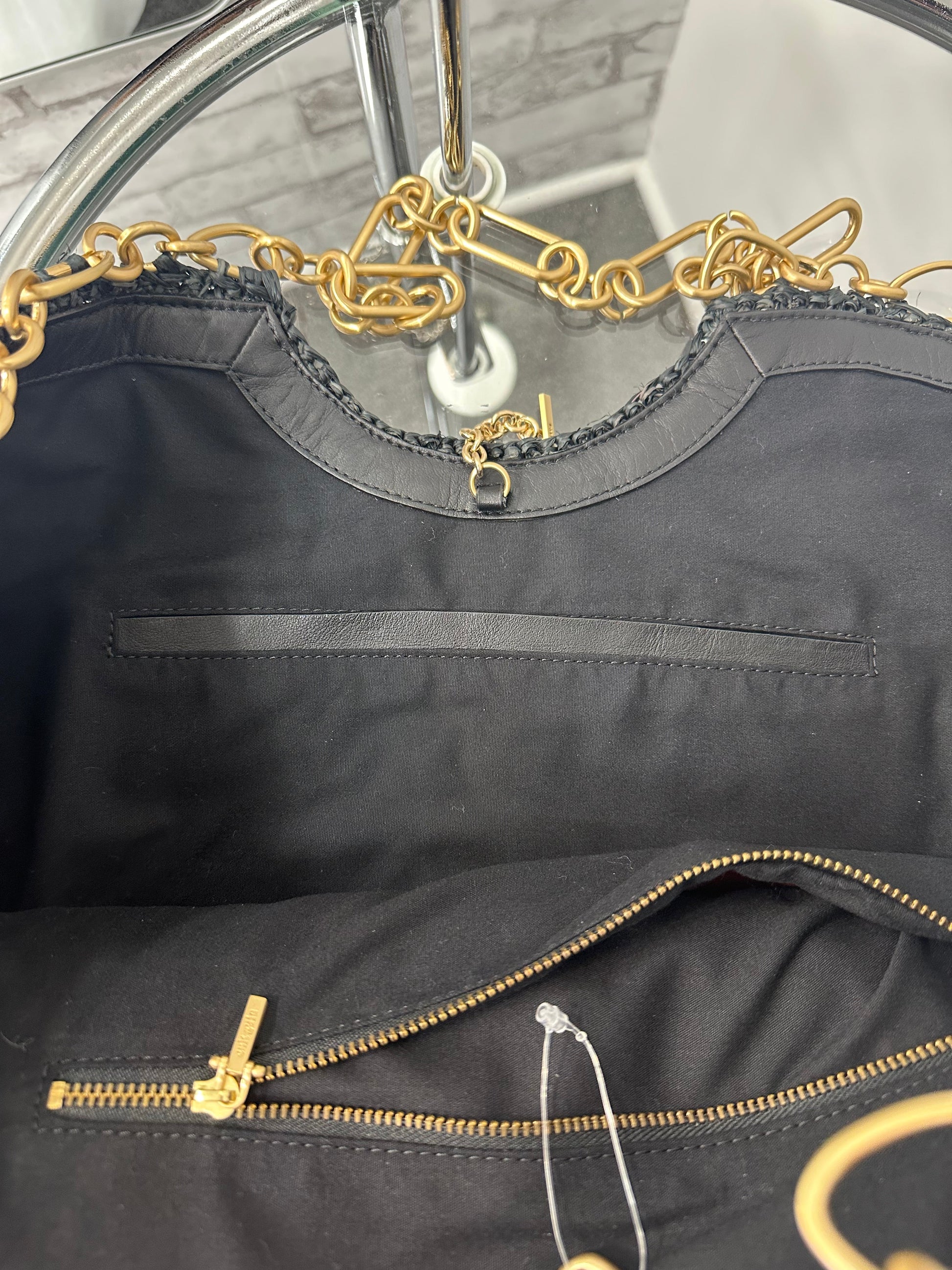 - Black straw, gold-tone chain, and protective feet at base, pull through chain closure at top, single interior zip pocket, one open pocket