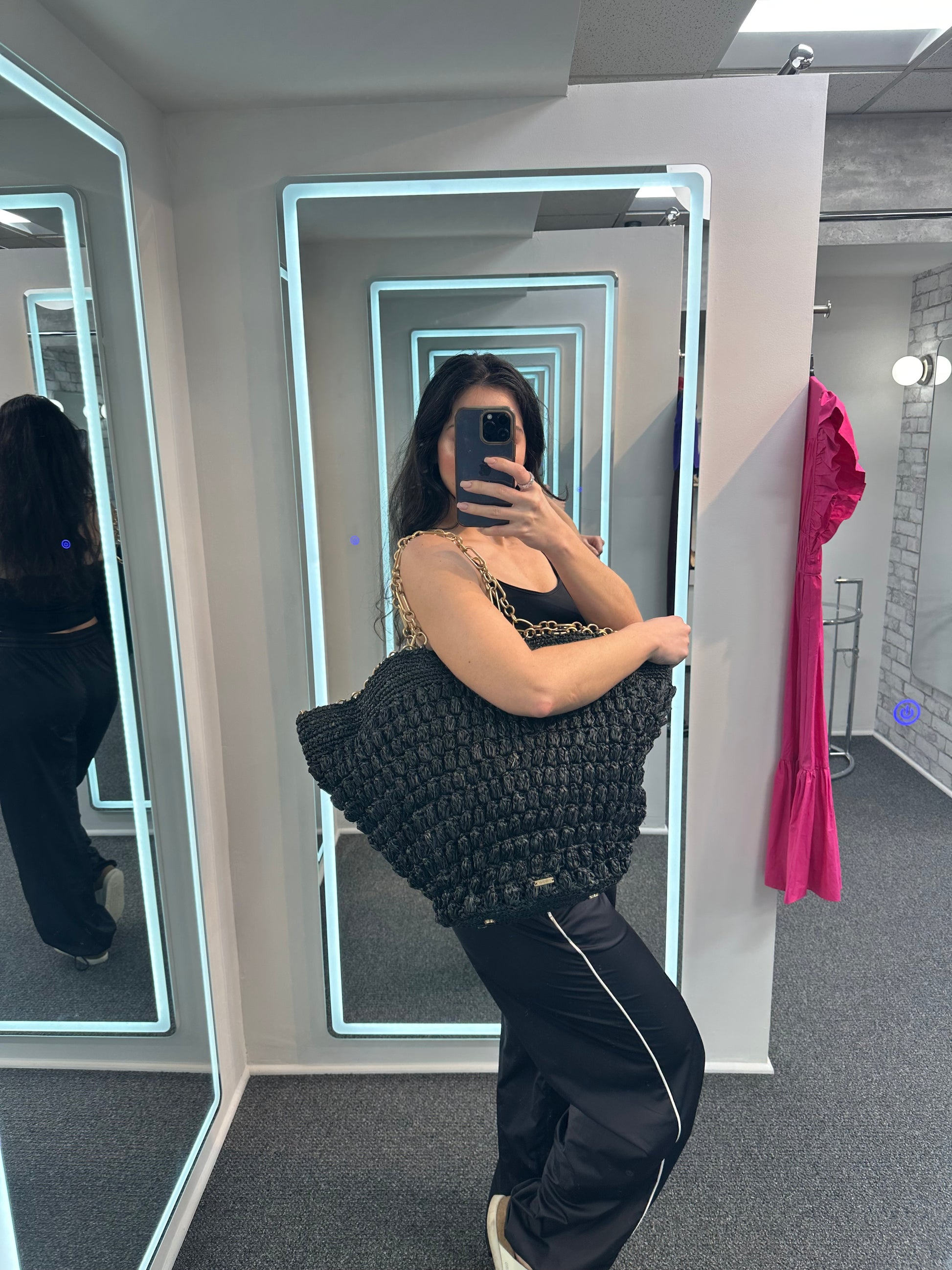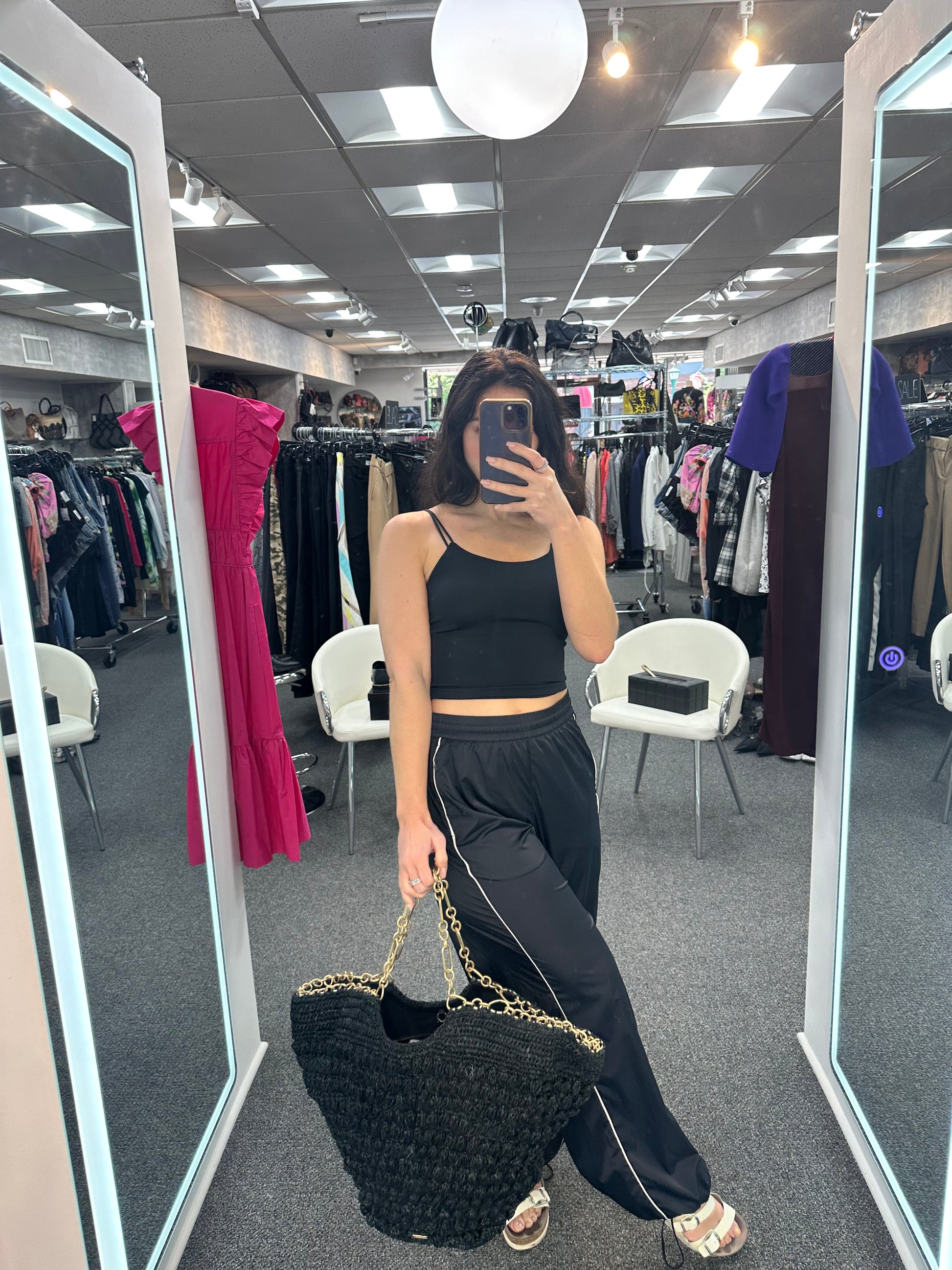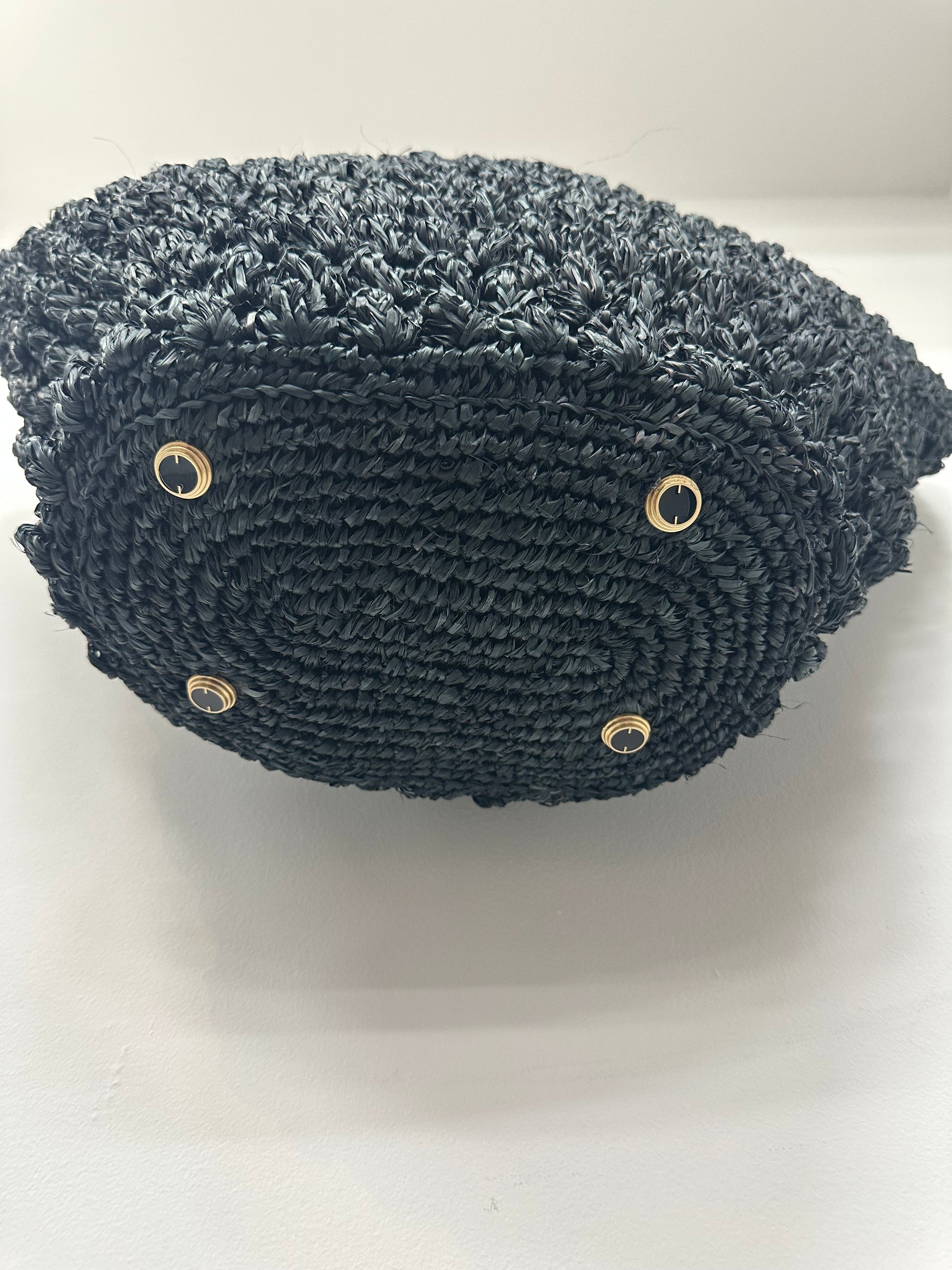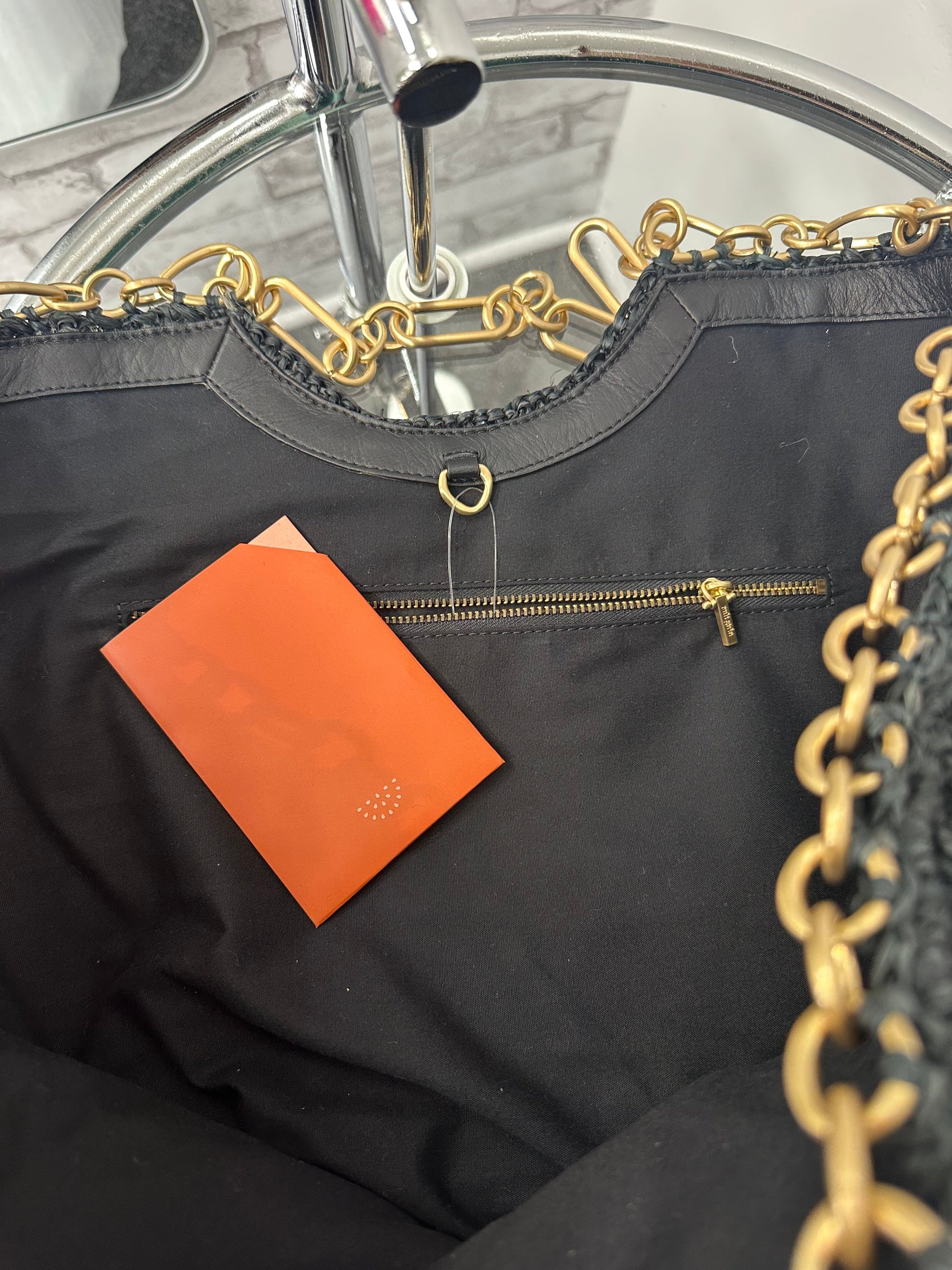 - Black straw, gold-tone chain, and protective feet at base, pull through chain closure at top, single interior zip pocket, one open pocket