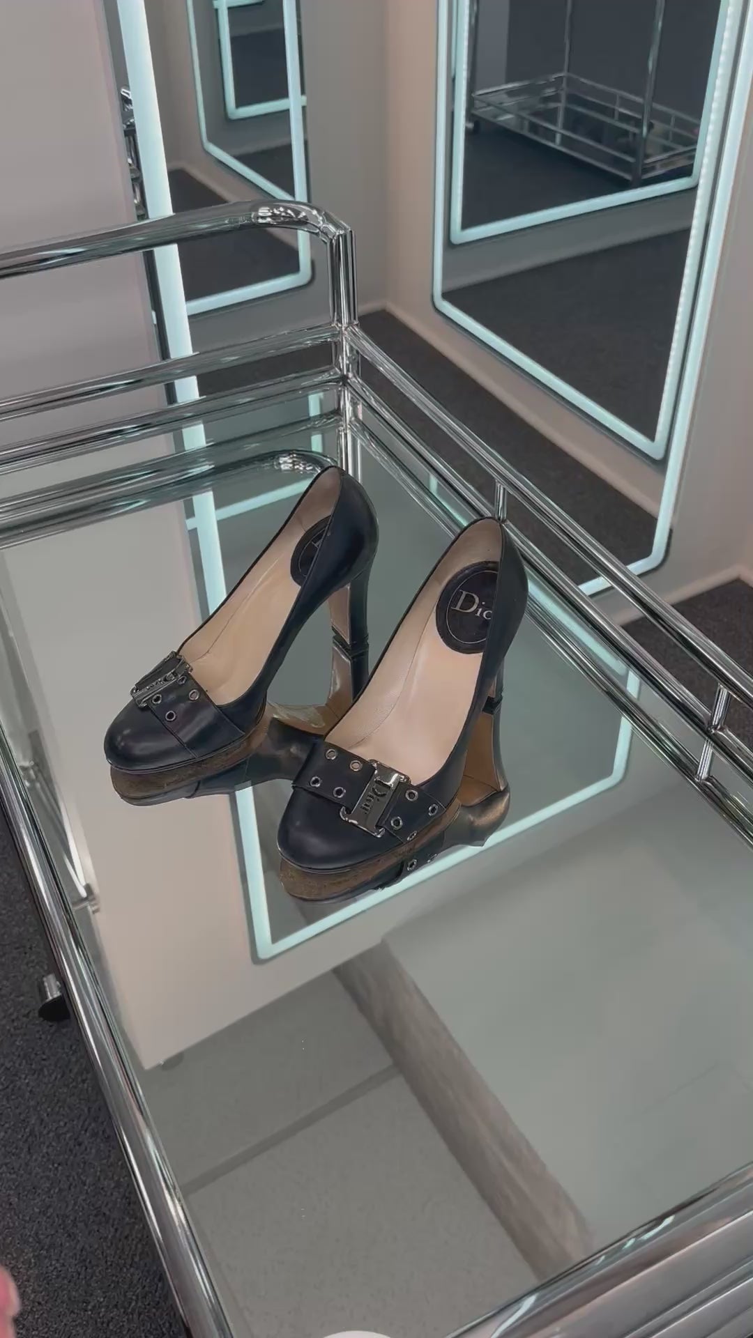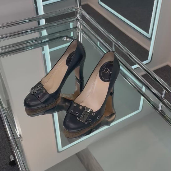 - Black leather, round toe, stacked heel, silver-tone hardware, DIOR logo at front