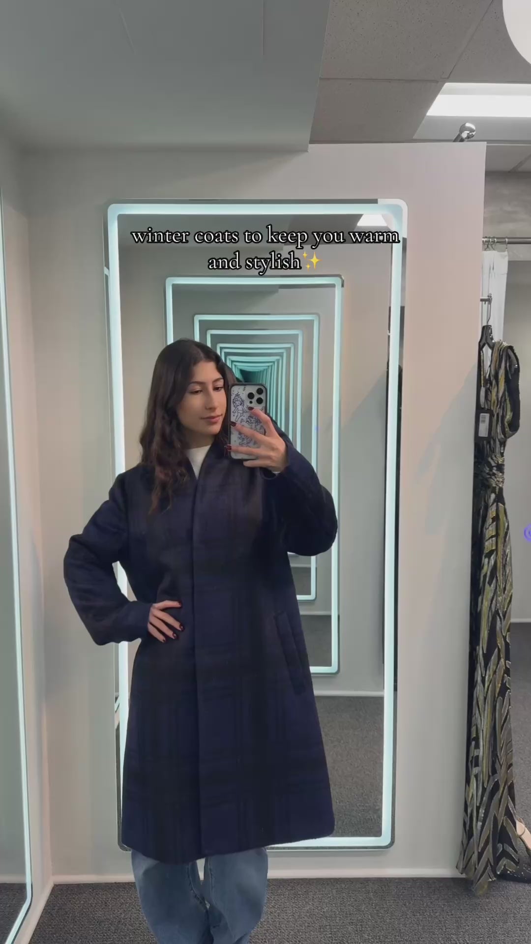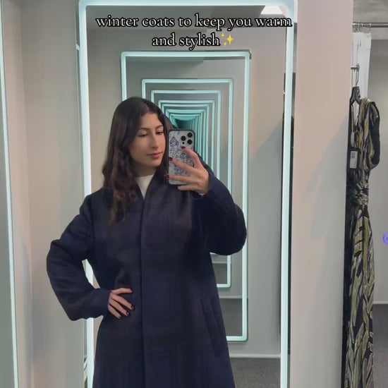 - Alpaca wool, navy with a black plaid pattern, long, button snap closure, pockets, collar-less