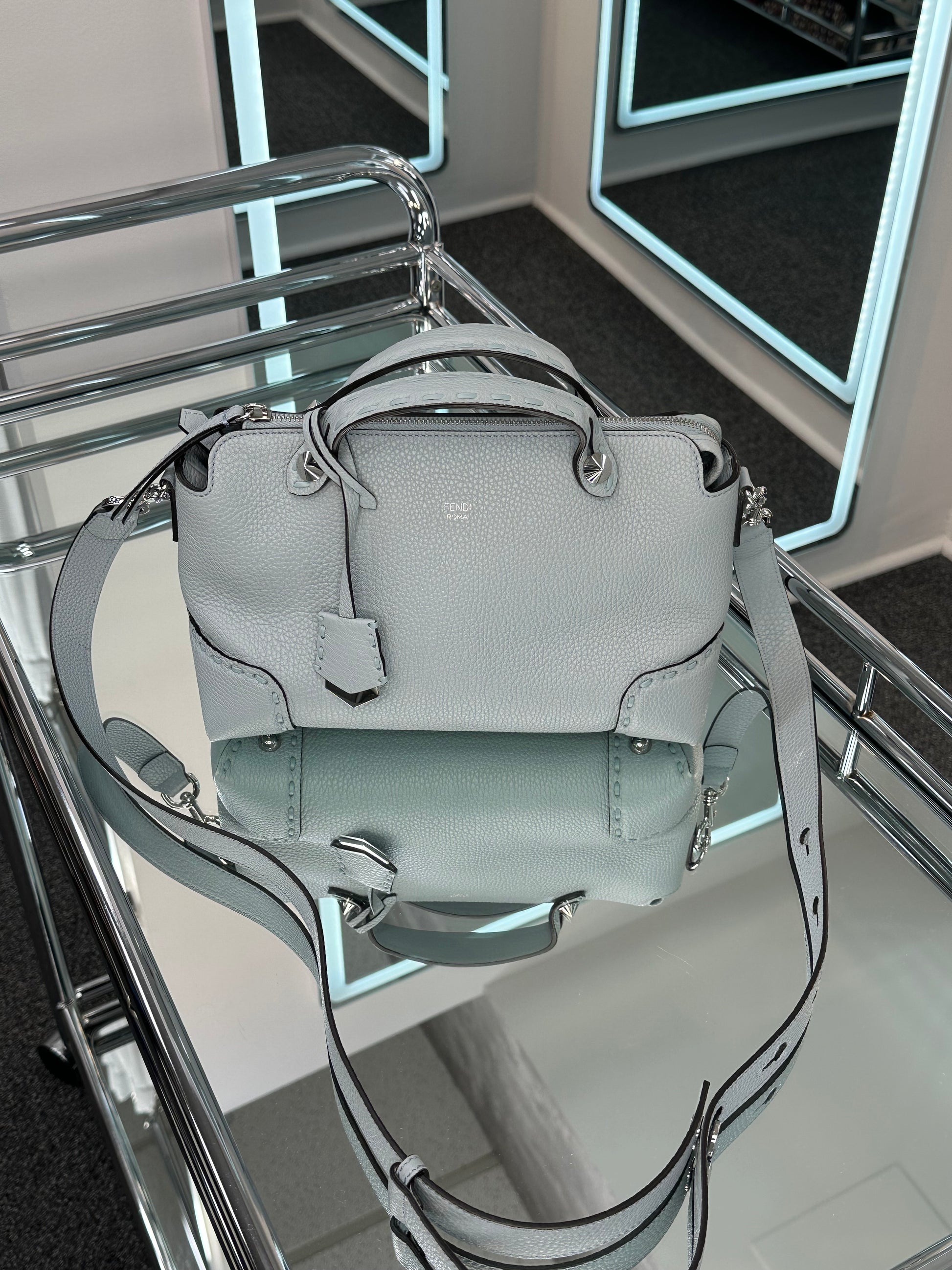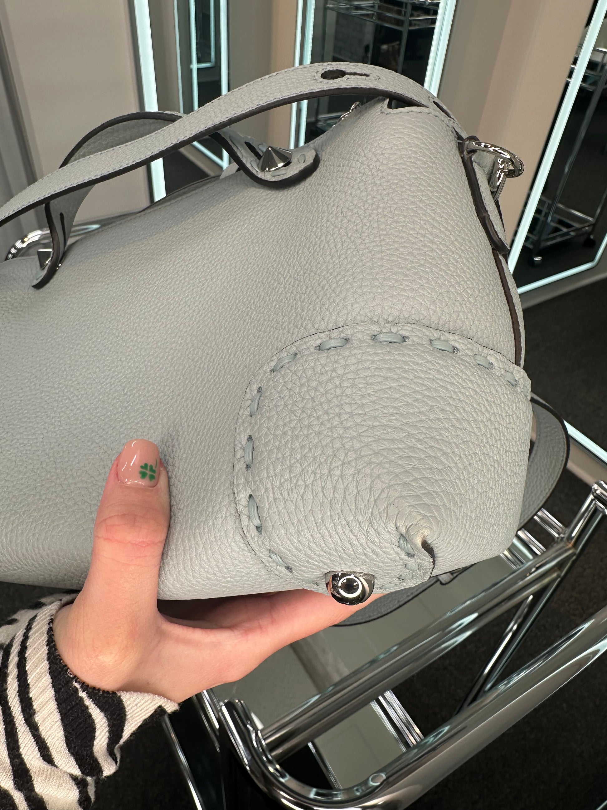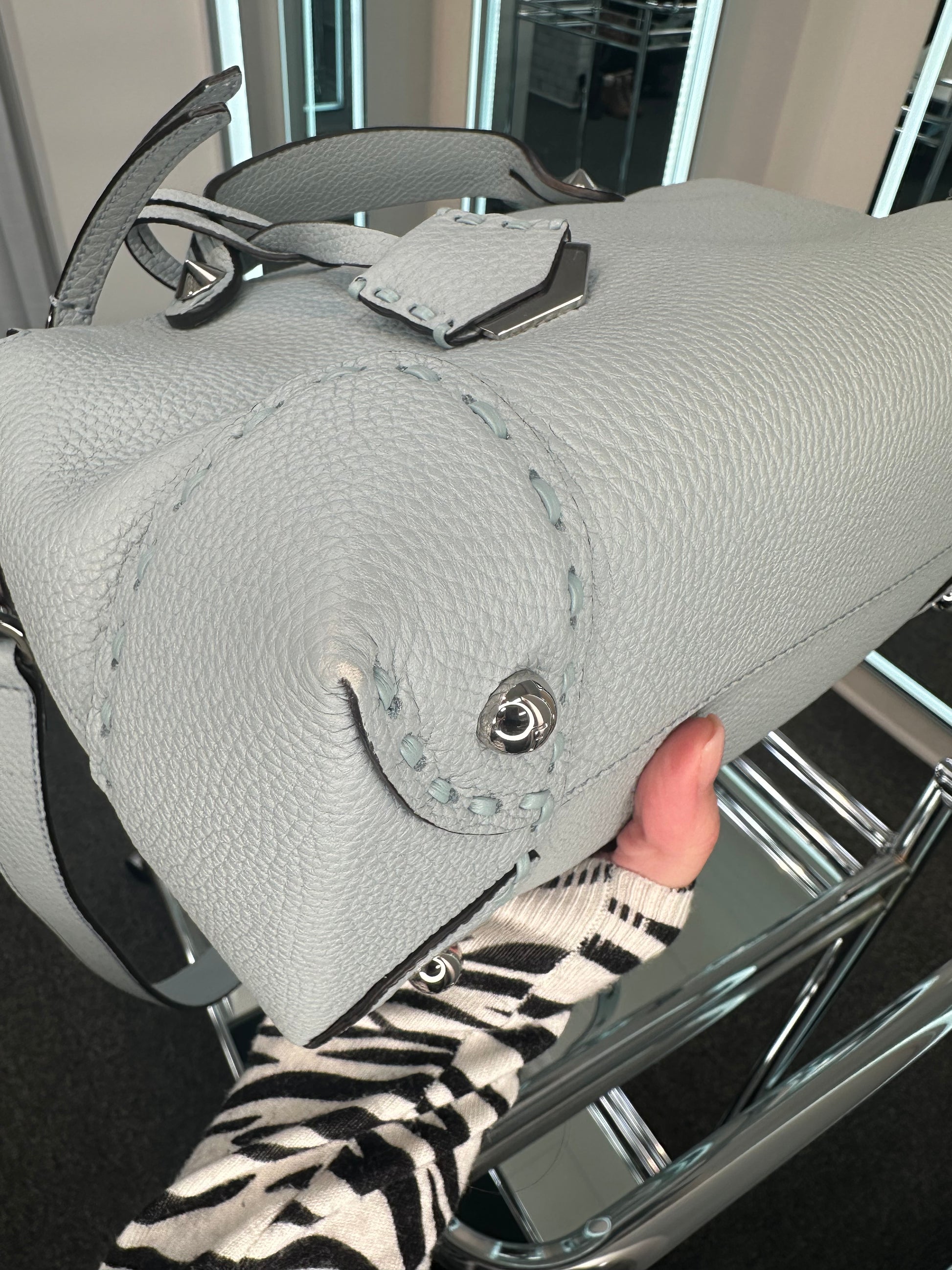 - Light blue grained leather, silver-tone hardware, tonal leather stitching detail, detachable adjustable crossbody strap, dual flat top handles, top zipper, canvas lining, single interior zipped compartment, dual interior open pockets