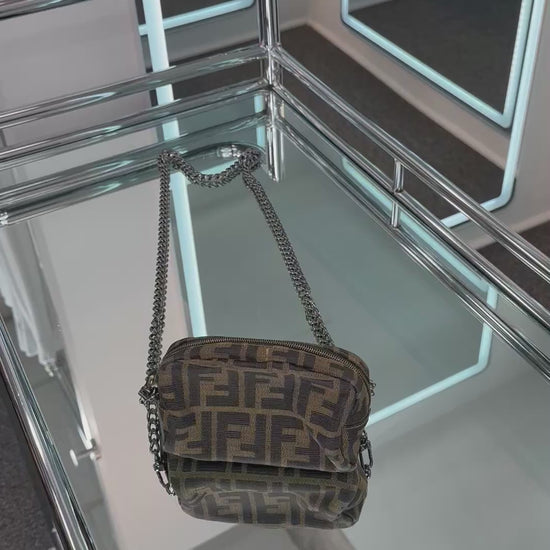- Brown canvas, Fendi Zucca pattern, top zipper, leather toggle with metal Fend logo, leather interior, detachable gun-metal chain added by owner