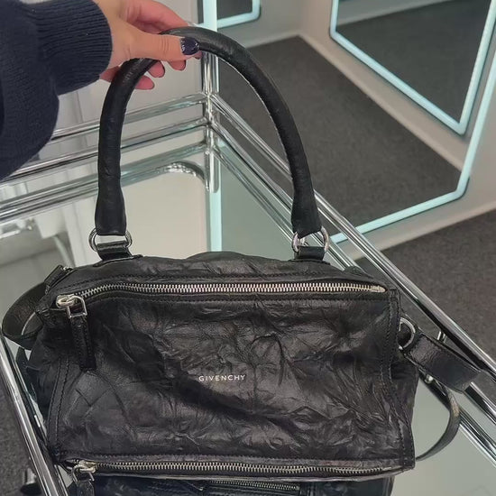 - Wrinkled black sheepskin, silver-hardware, detachable shoulder strap, dual rolled top handles, single exterior pocket, single top zipper, canvas lining, single interior zip pocket, dual open pockets