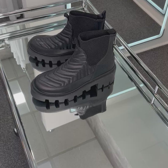 - Black leather, chevron stitching, pull on, lug sole, round toe, double G logo stitched on exterior side heel, stretch knit panel