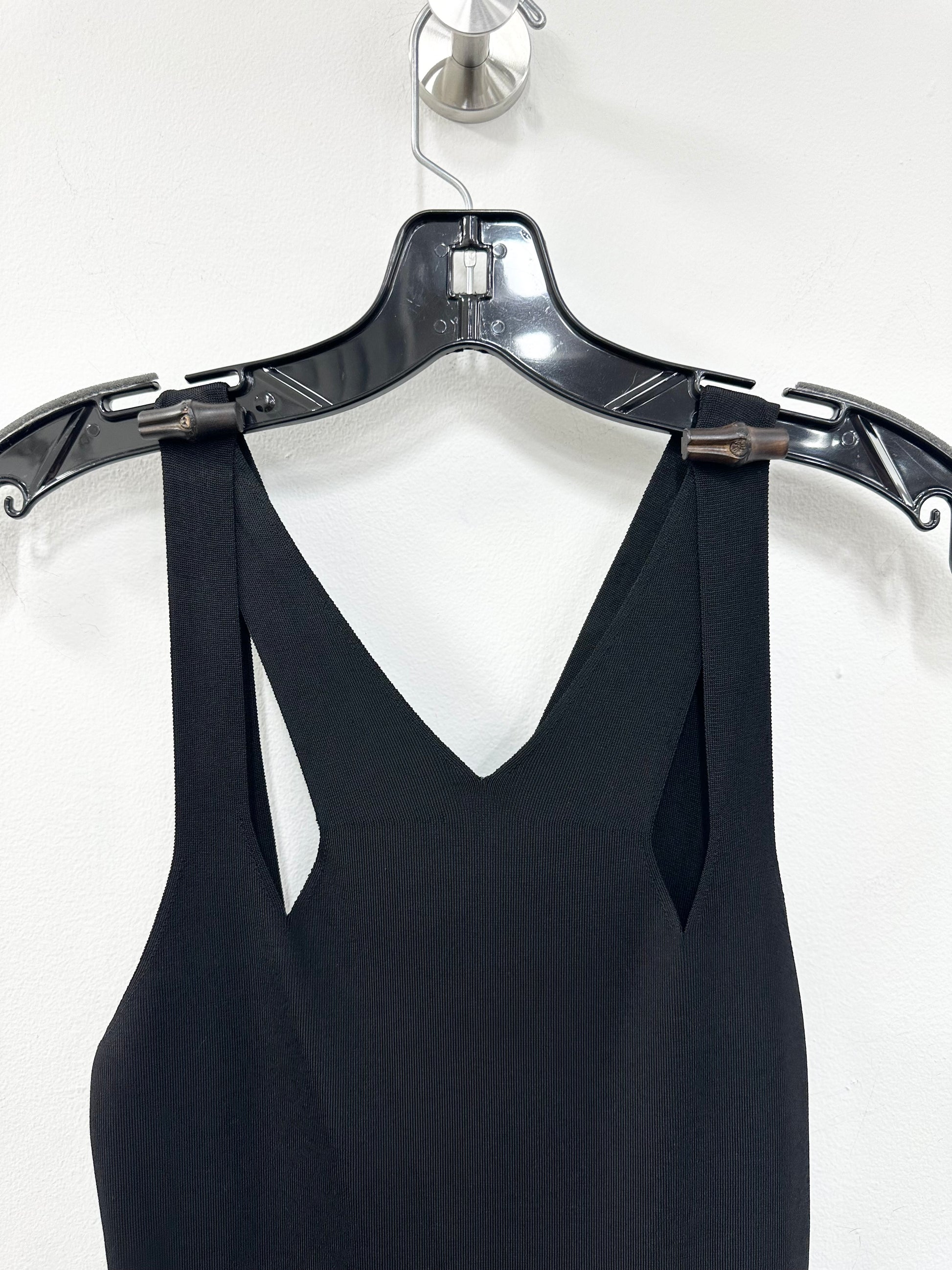 - Black stretch knit, cut out detailing in front and back, sleeveless, v-neck, blackened bamboo attachment on straps