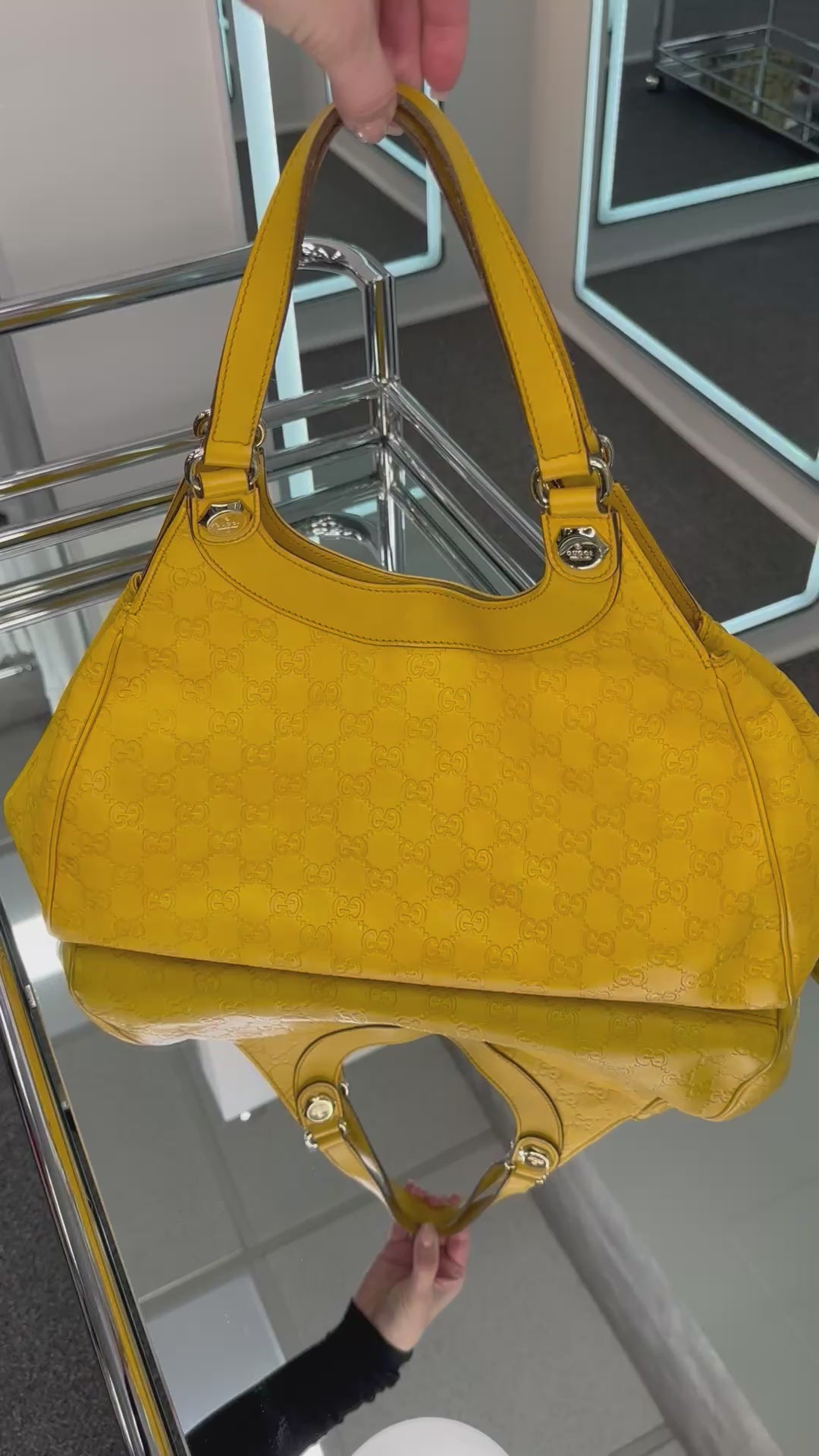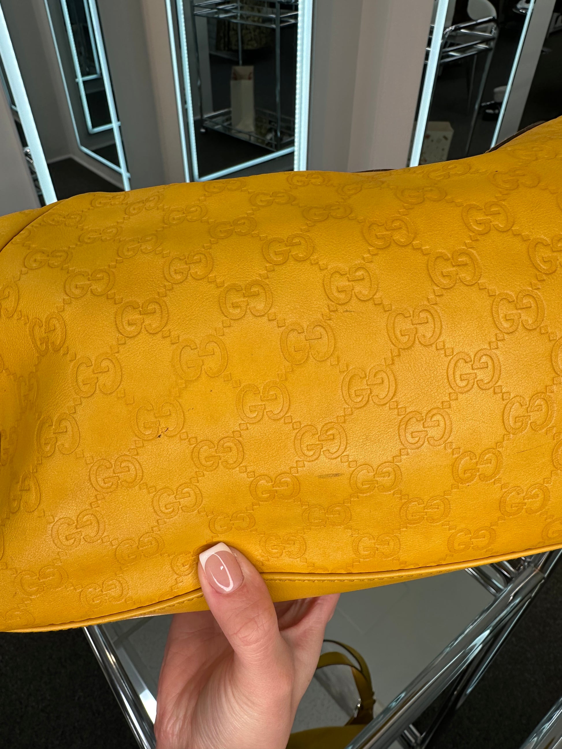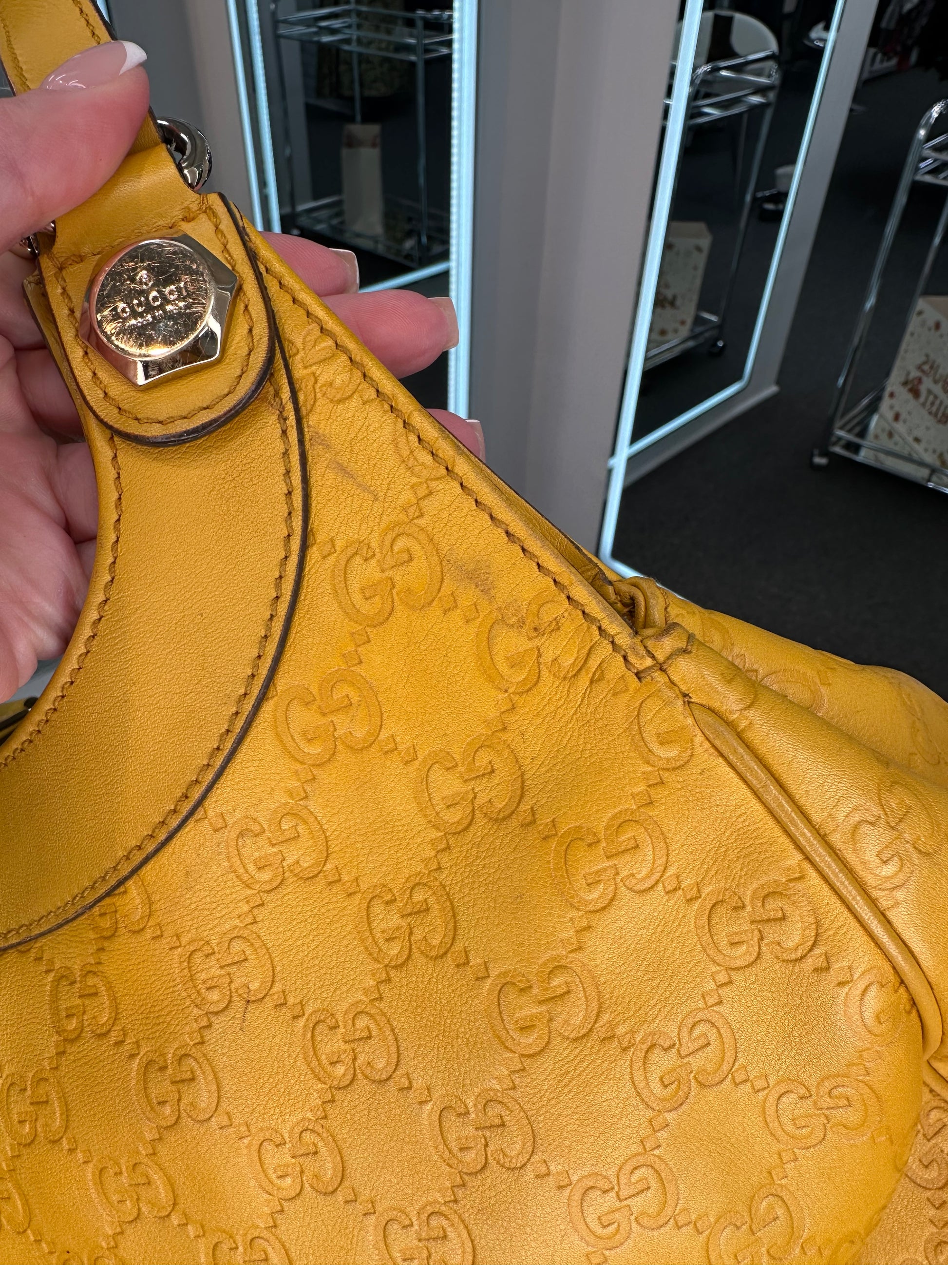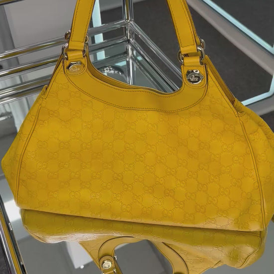 - Yellow leather with Guccisima embossed pattern, gold-tone hardware, dual flat shoulder handles, leather trim, snap closure, brown canvas interior, single interior zipper