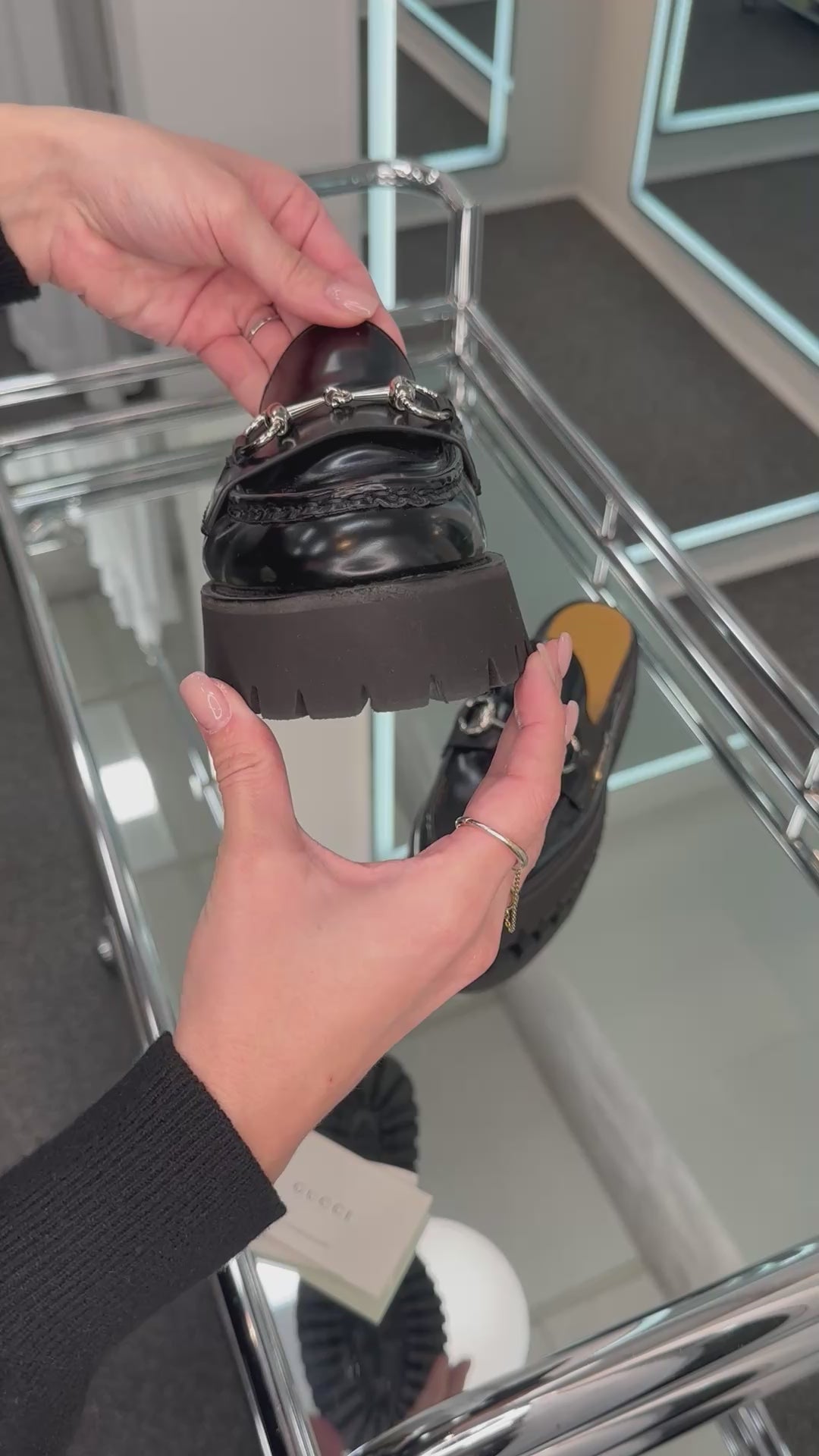 - Black glazed leather, silver-tone hardware horse-bit, slide on, lug sole
