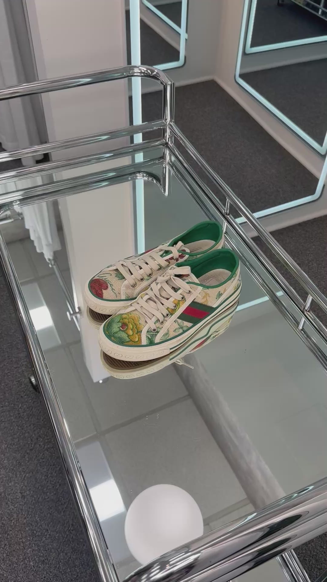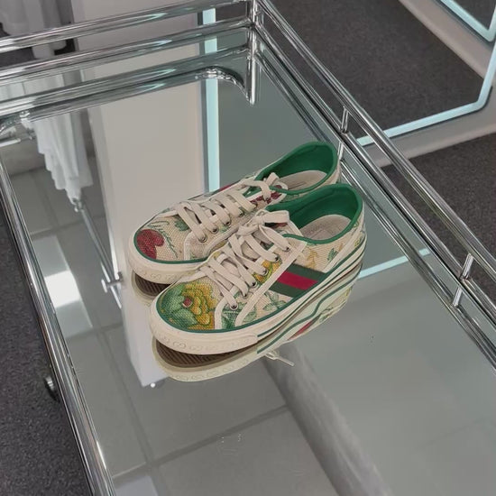 - Cloth material, floral pattern, green and cream are the main colors, Gucci logo around front toe rubber, lace-up