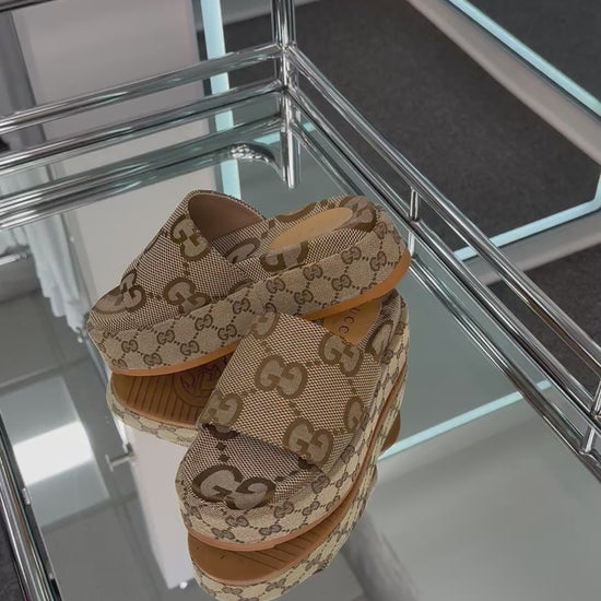 - Camel and ebony canvas, Jumbo GG pattern, platform, mule