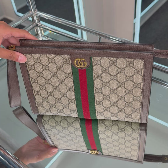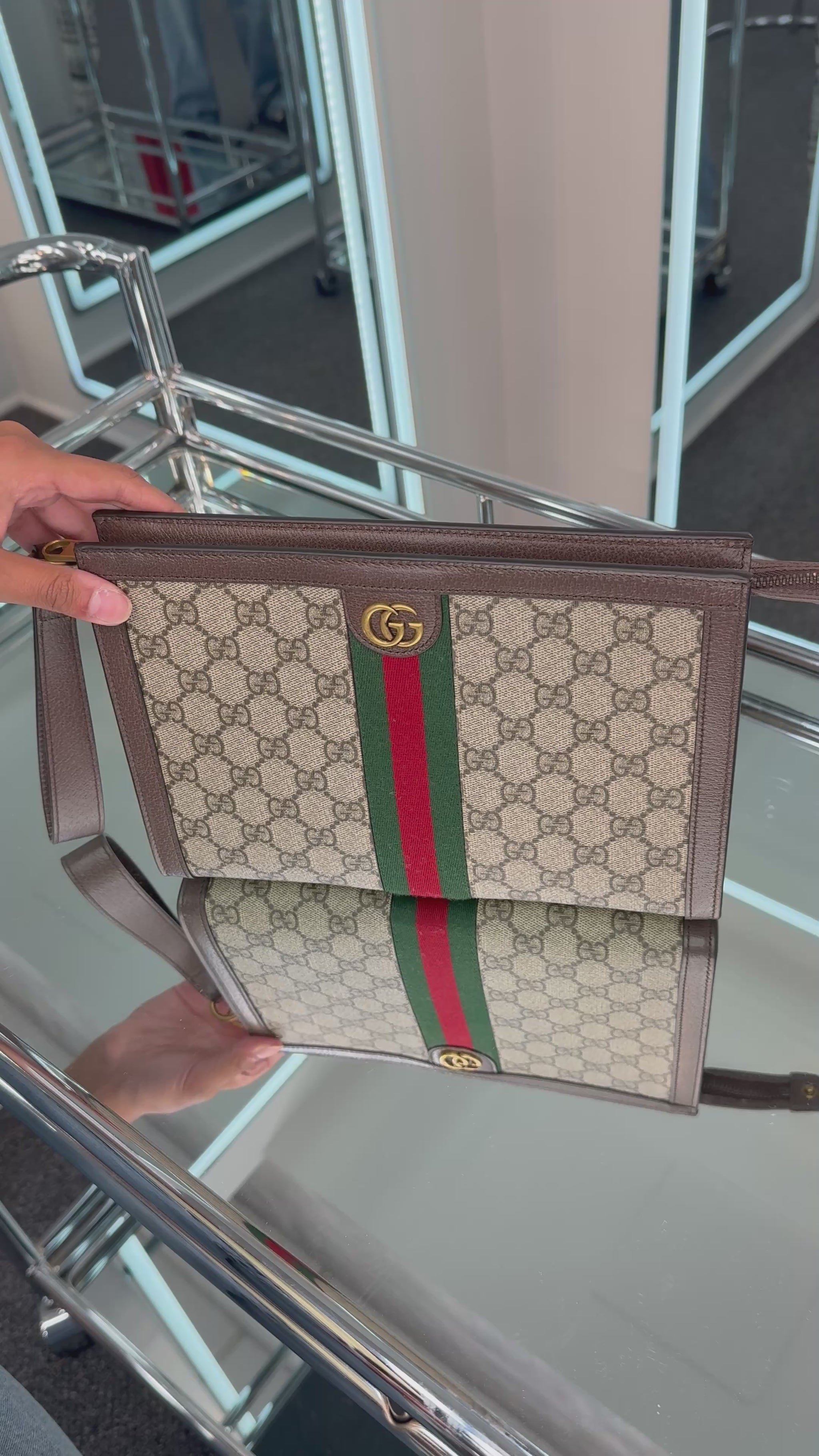 - Beige and ebony GG supreme canvas, gold-tone center logo and hardware, green and red center Web detail, top zip, detachable wristlet strap, cotton interior lining, 6 attached side credit card pockets