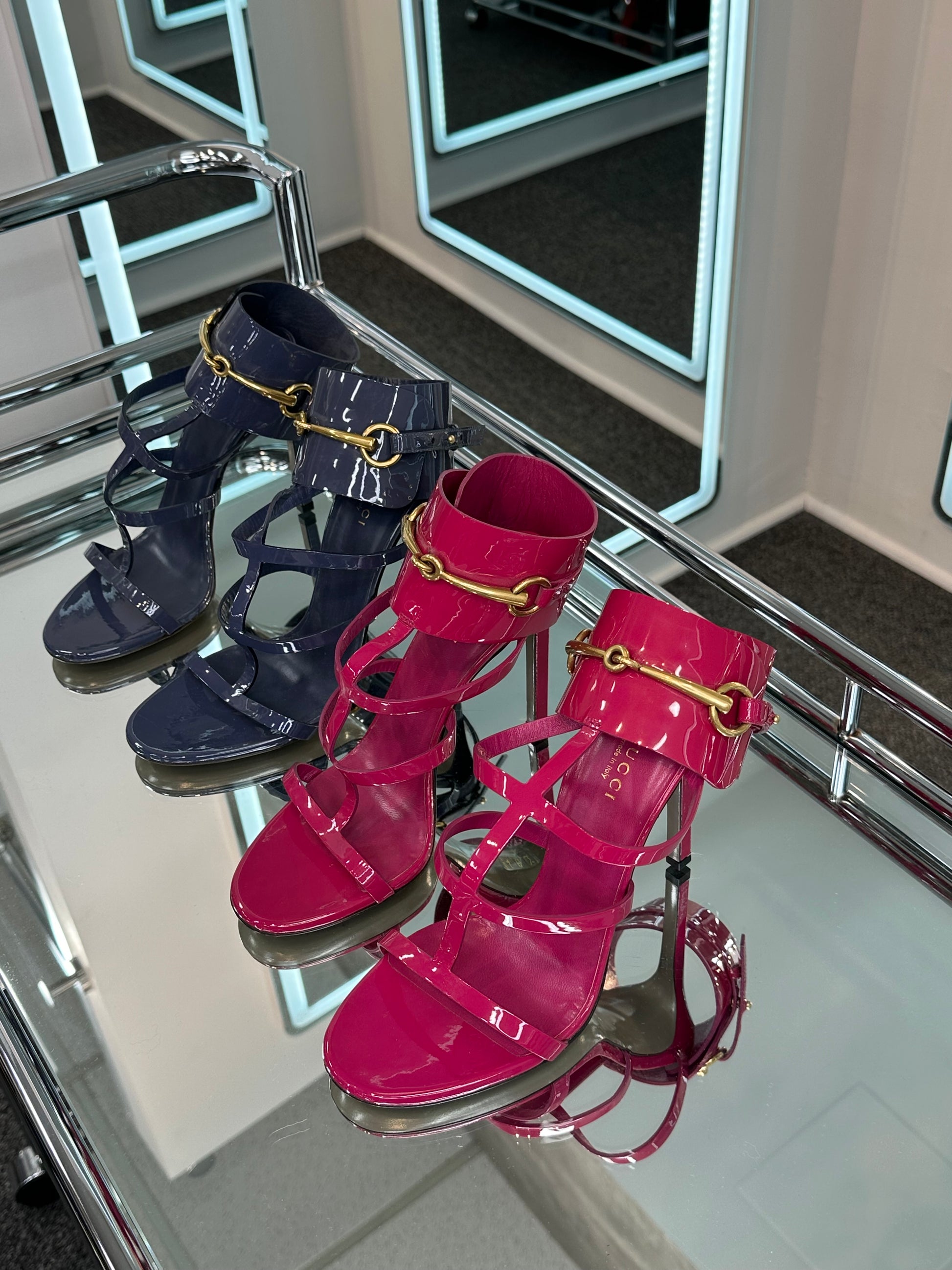 - Blue patent leather, stiletto heel, brass horse-bit, gladiator style detail, ankle strap closure