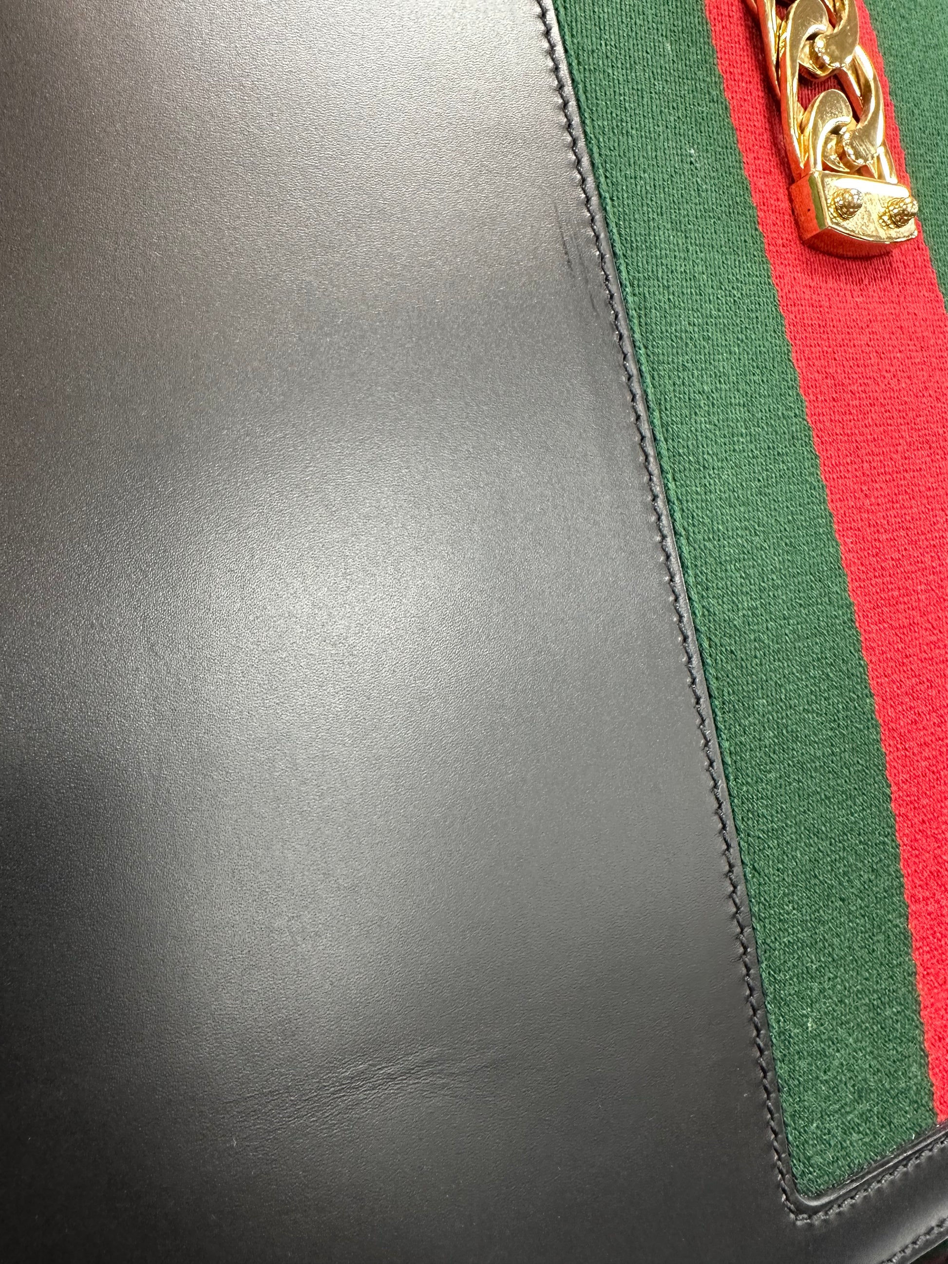- Top handle, detachable Web shoulder strap, detachable adjustable matching black leather shoulder strap, silver-tone hardware, large center Web design, turn lock closure at front, suede lining, single interior zip pocket, dual open flat pockets