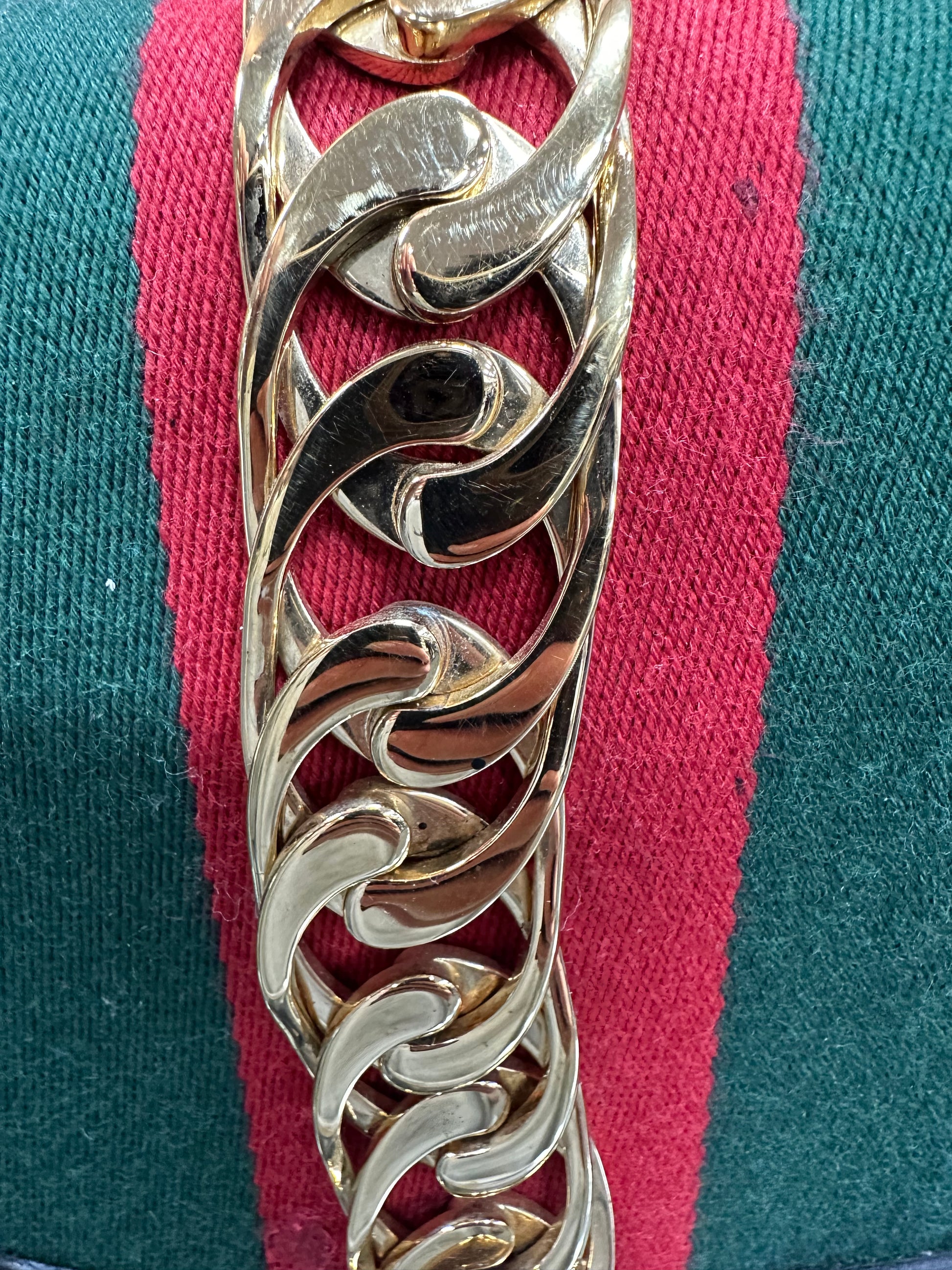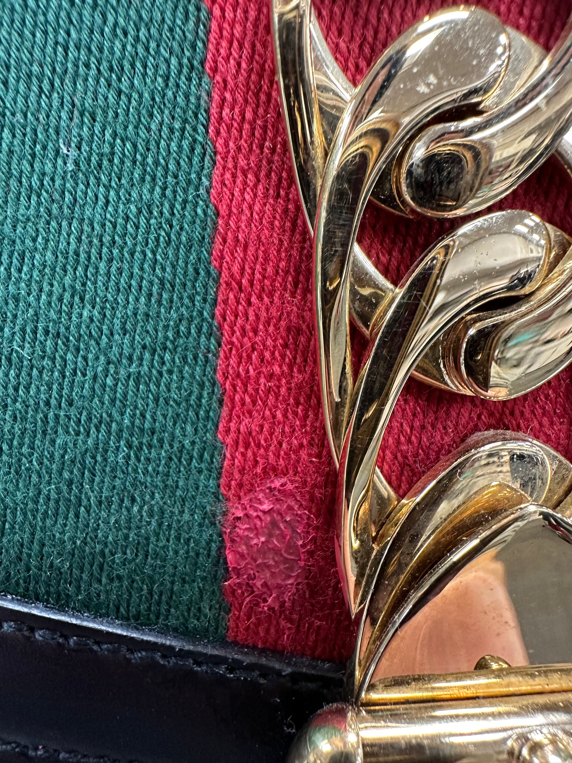 - Good Condition, has a scratch on the top left, light wear overall to the canvas Web ribbon, metal scratching and color loss on the turn lock closure, indentation on the front right, light staining on the front, stain on the web canvas ribbon
