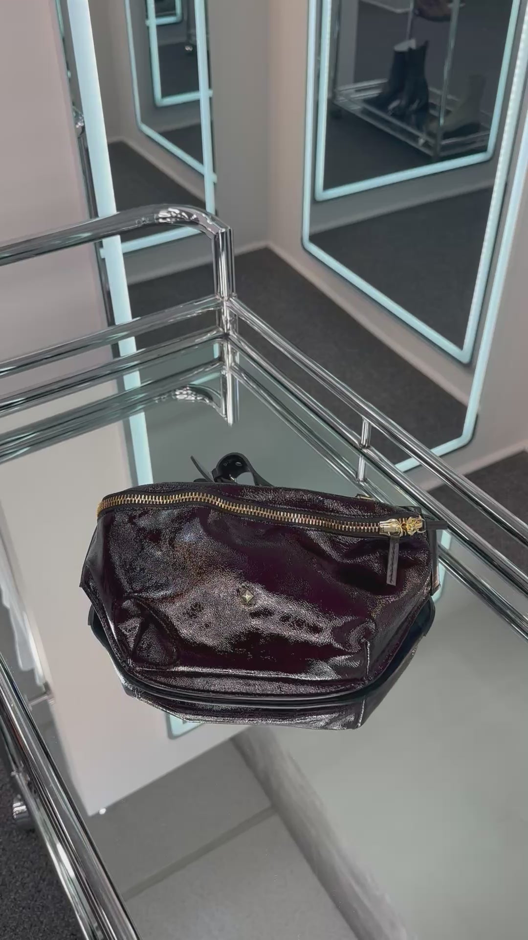 - Oxblood patent with black leather trims, gold-tone hardware, dual exterior zippers, adjustable strap