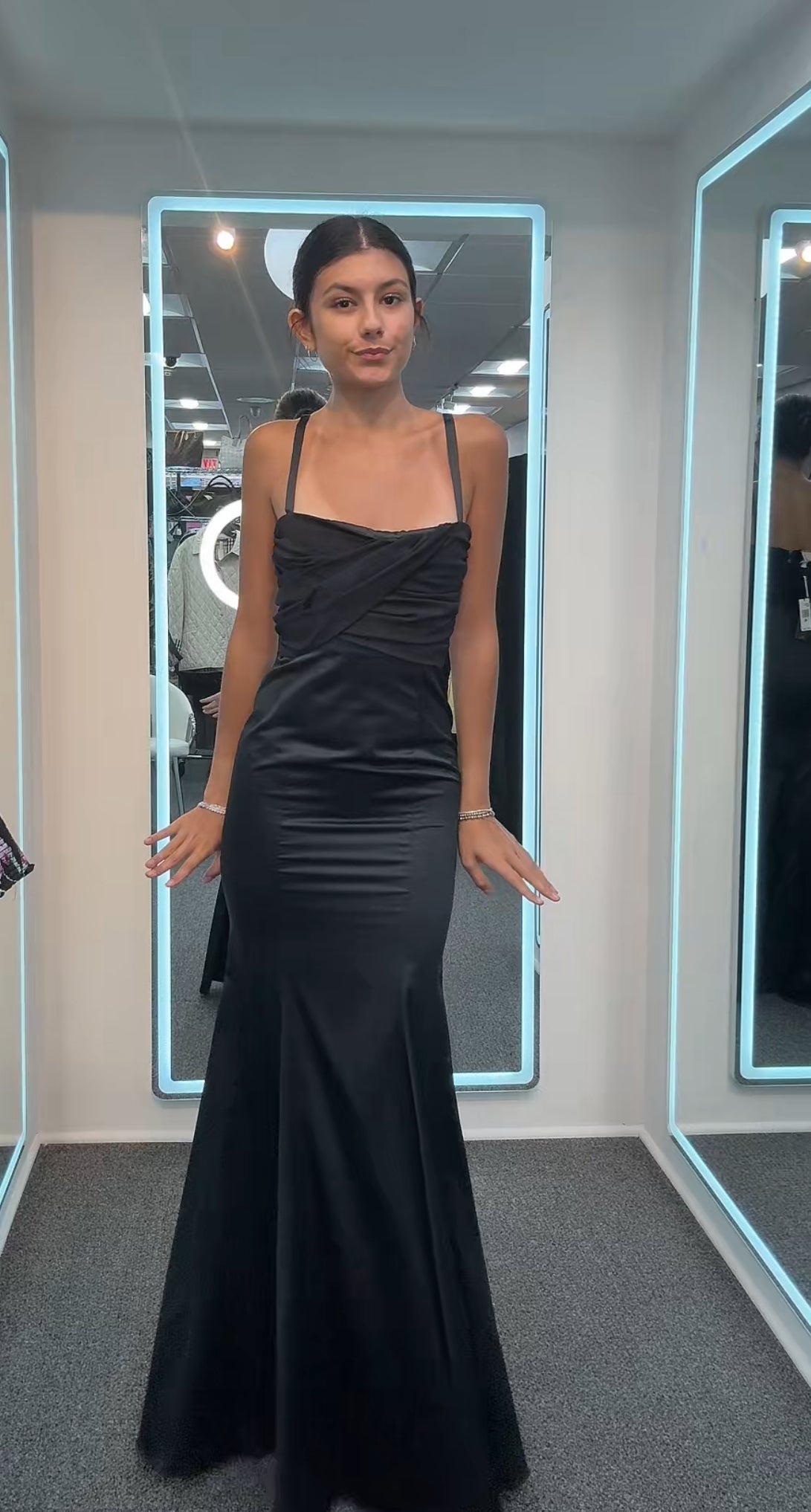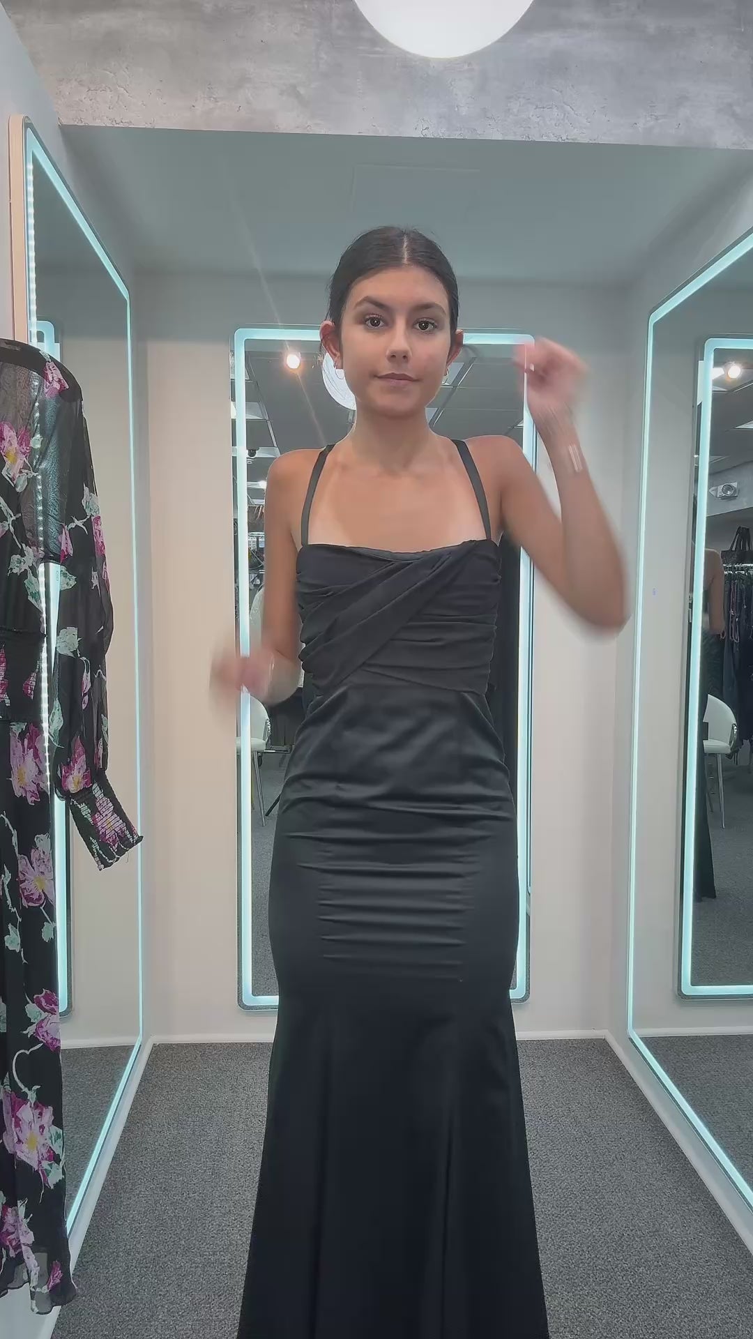 - Thin strap, draped top, silk column, maxi length, hidden zipper along center of back
