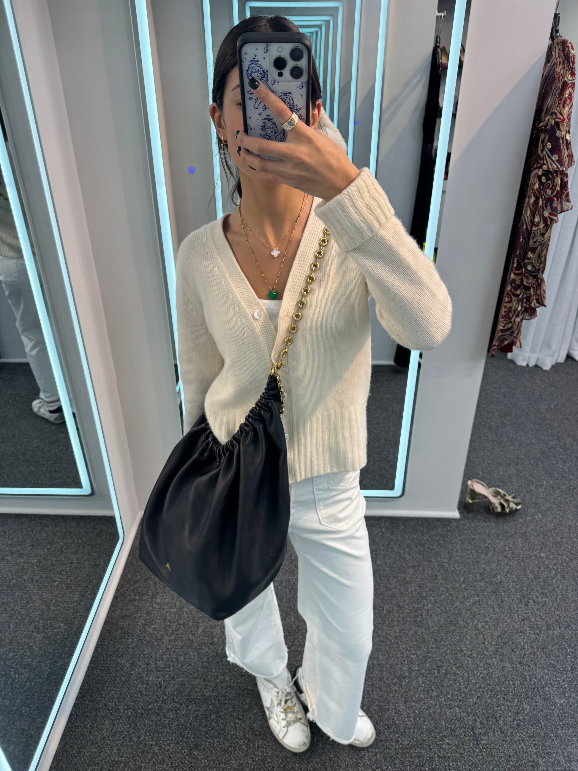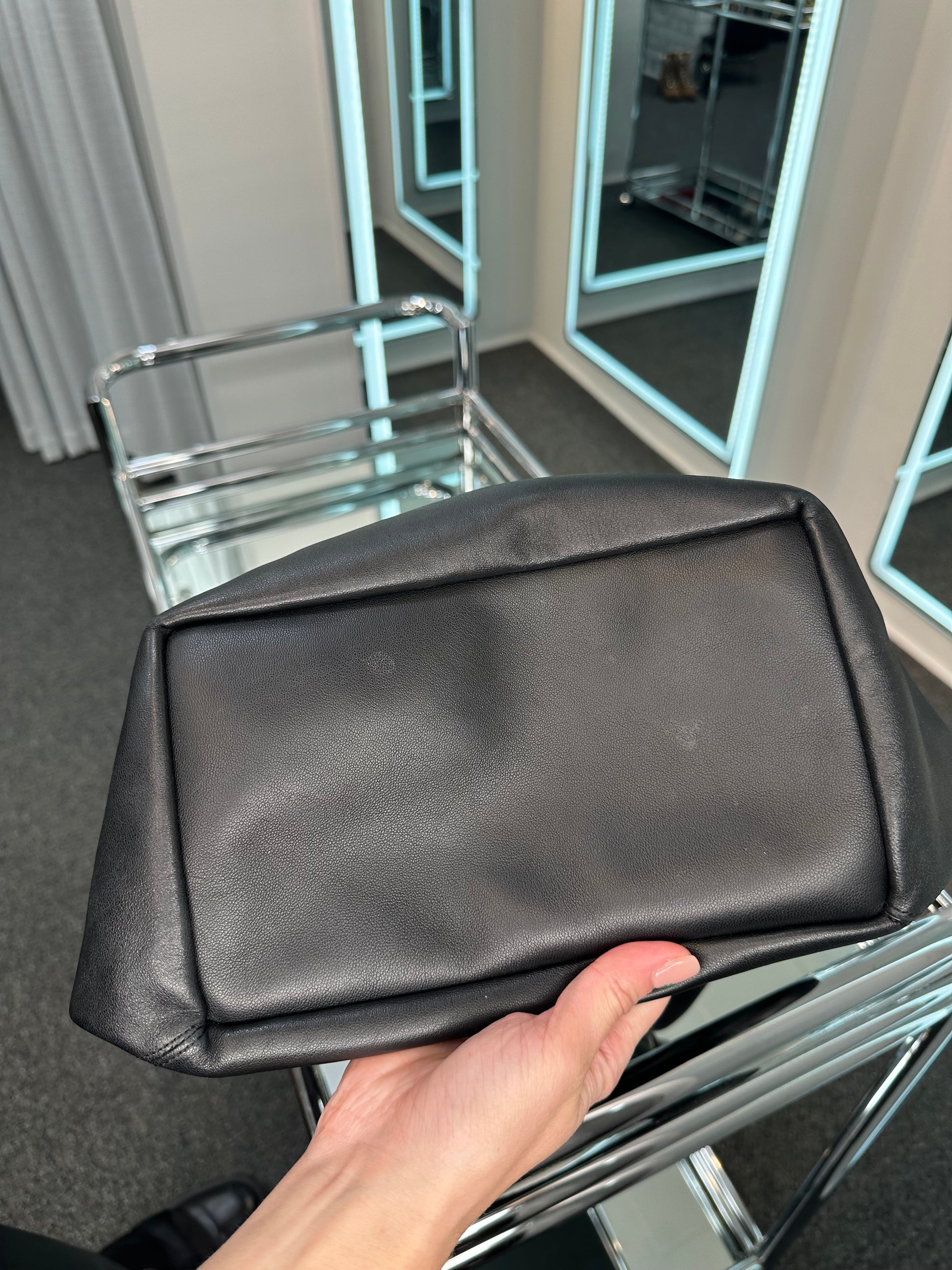 - Black leather, gold-tone hardware, single adjustable shoulder strap, suede lining, single interior zip pocket, open top with single magnetic location