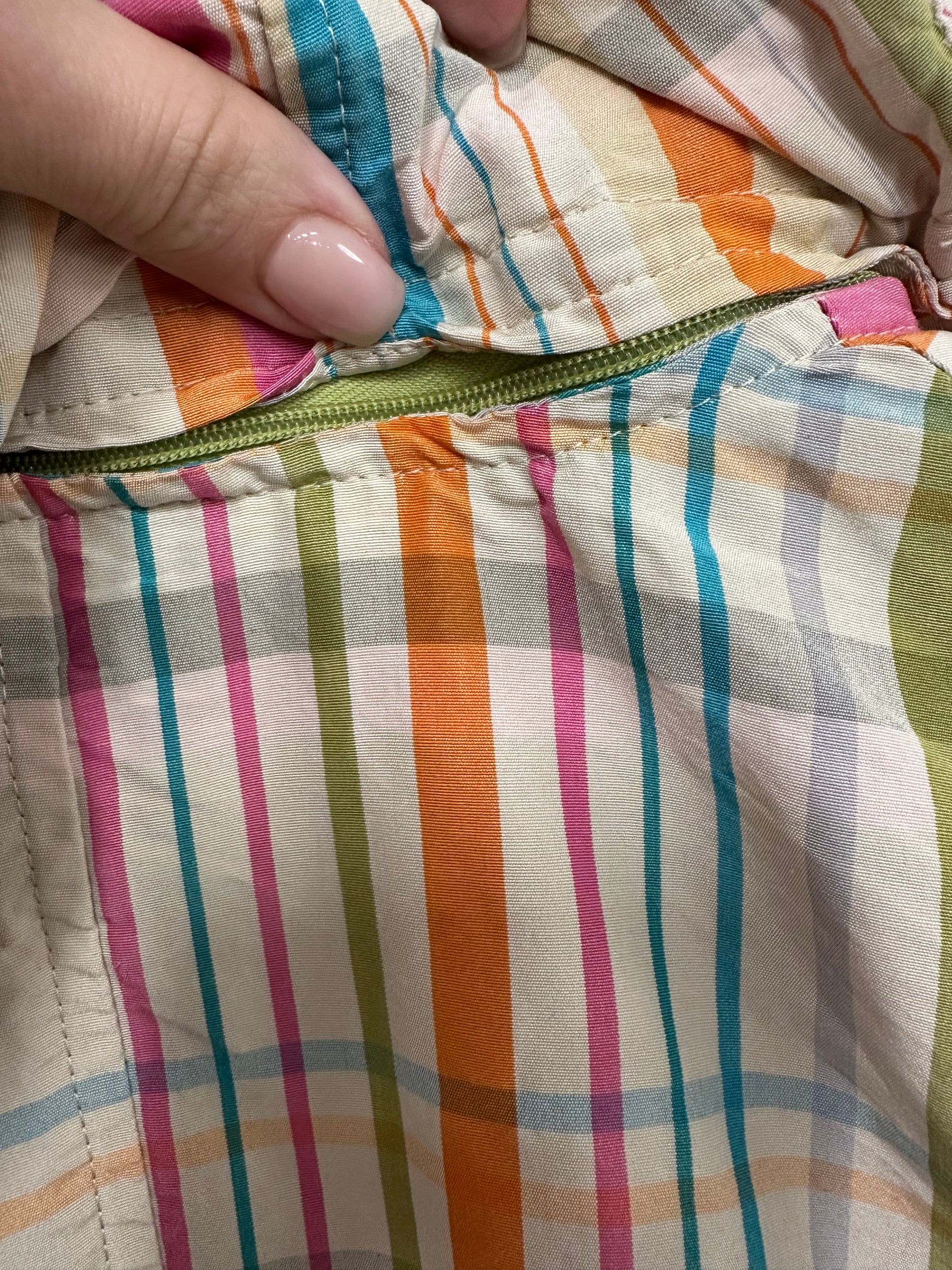 - Beige with a multi color plaid pattern, button closure, detachable hood, open pockets