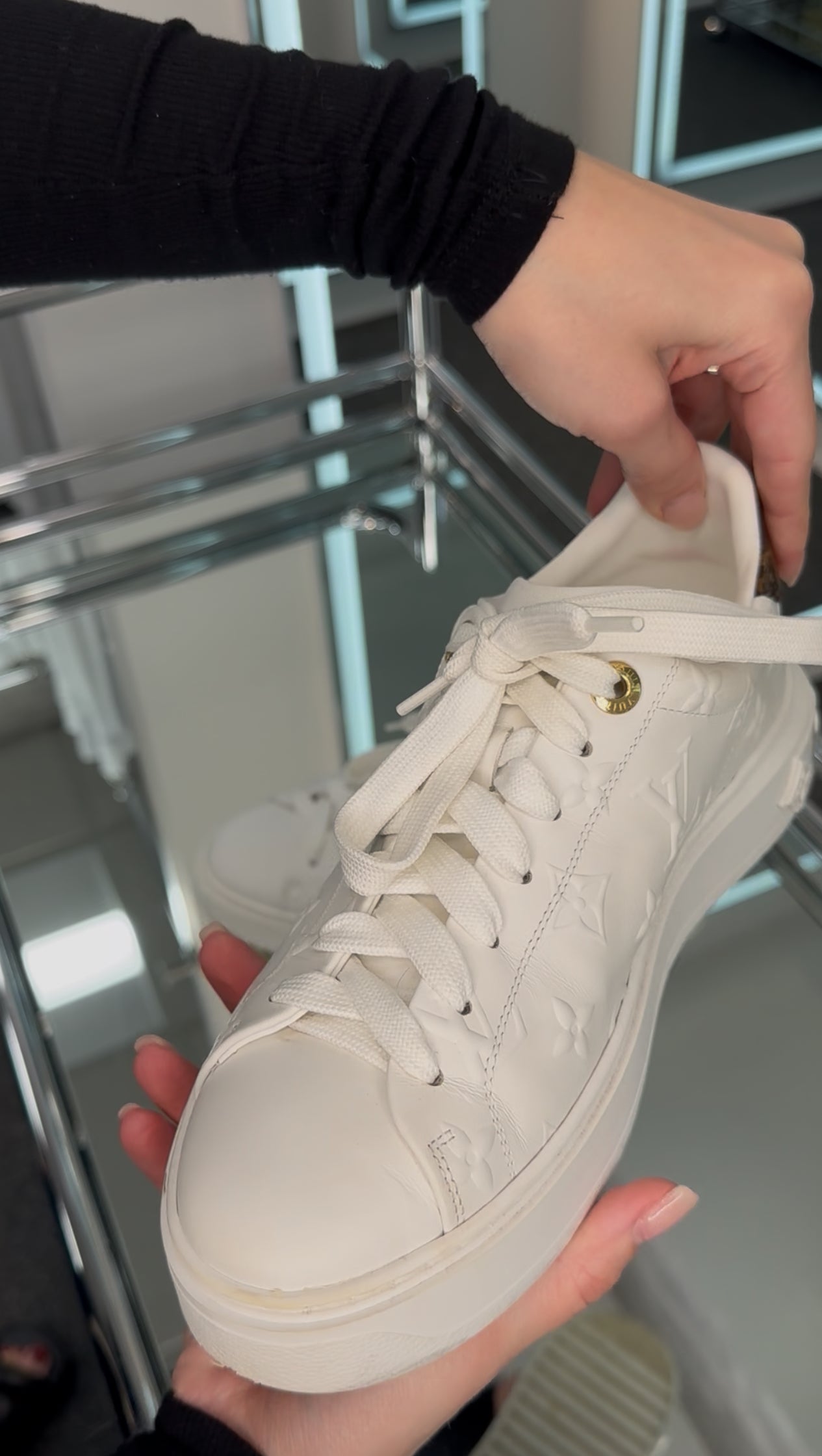 - White leather embossed with the Louis Vuitton logo, low top, signature Louis Vuitton canvas detailing on the exterior heel, engraved gold-tone Louis Vuitton grommets on top, round toe, platform, lace-up, 3D flowers on heel platform