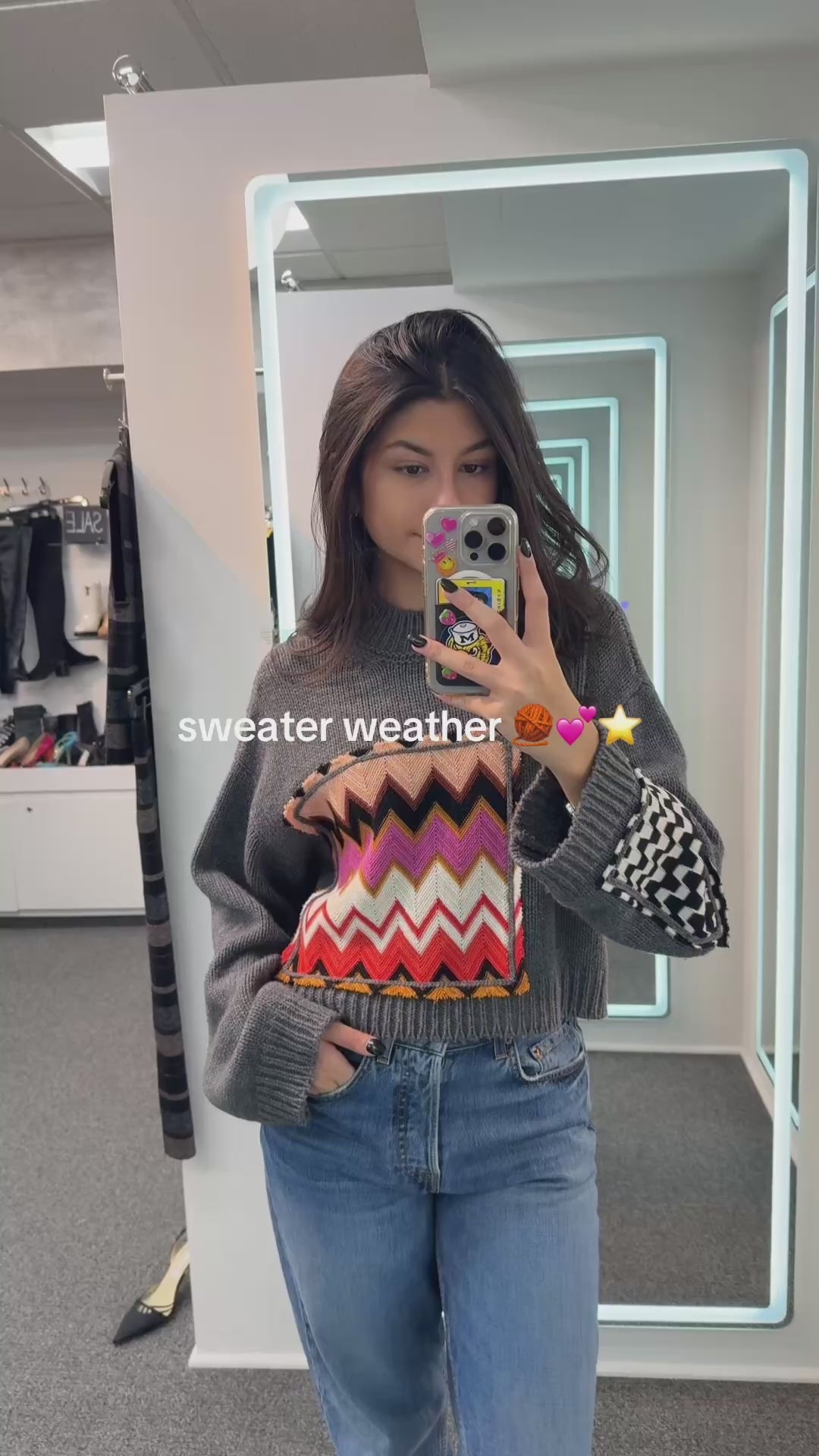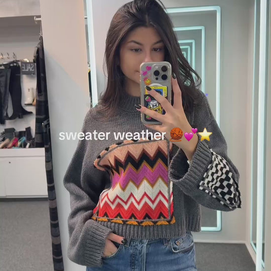 - Gray knit, Missoni signature chevron pattern patches, cropped, 50% acrylic 50% wool