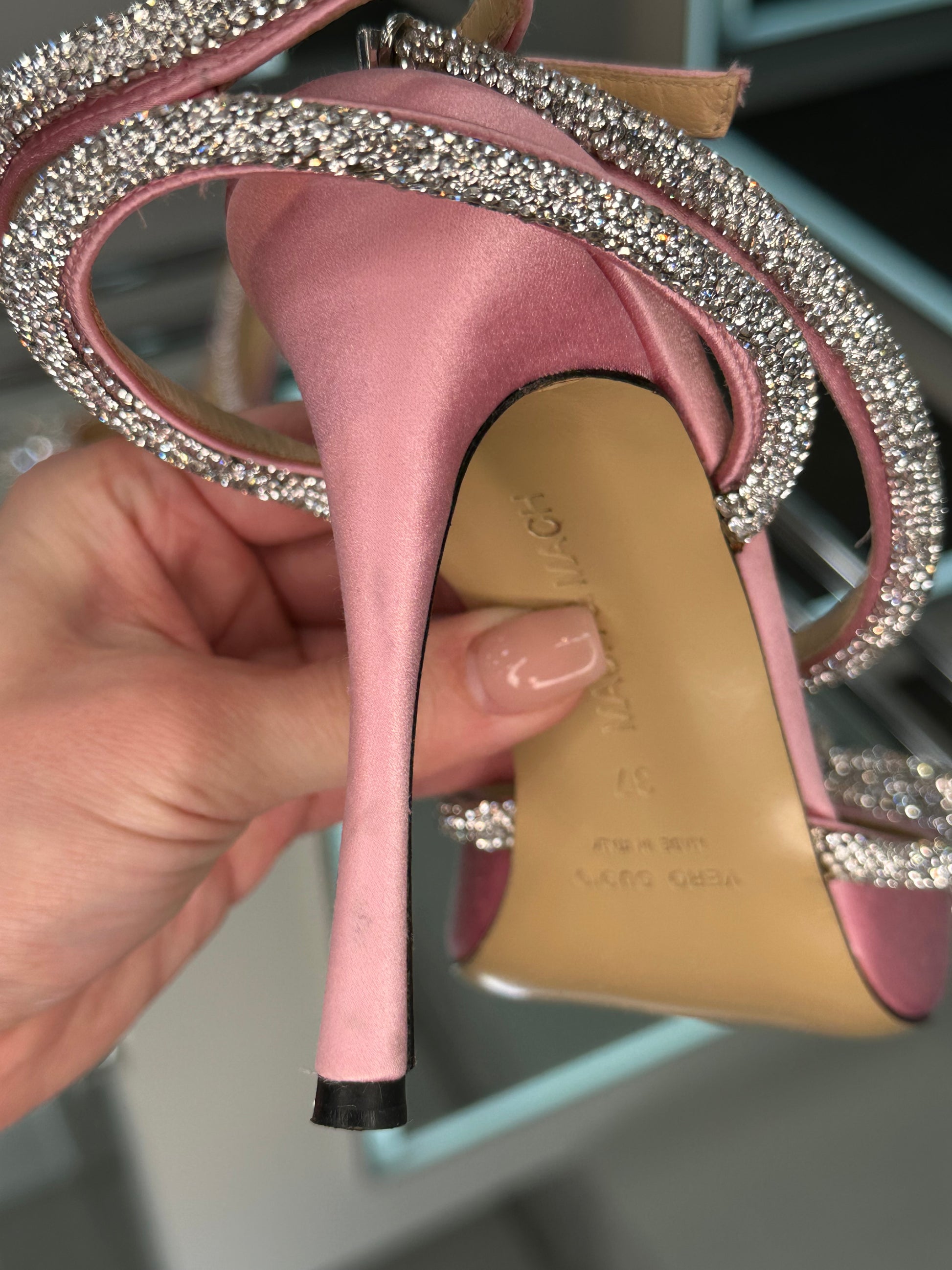 - Good Condition, light knick on the toe tip of the right heel, very light staining on back heels, some glue exposure on both heels, some glue staining on crystals