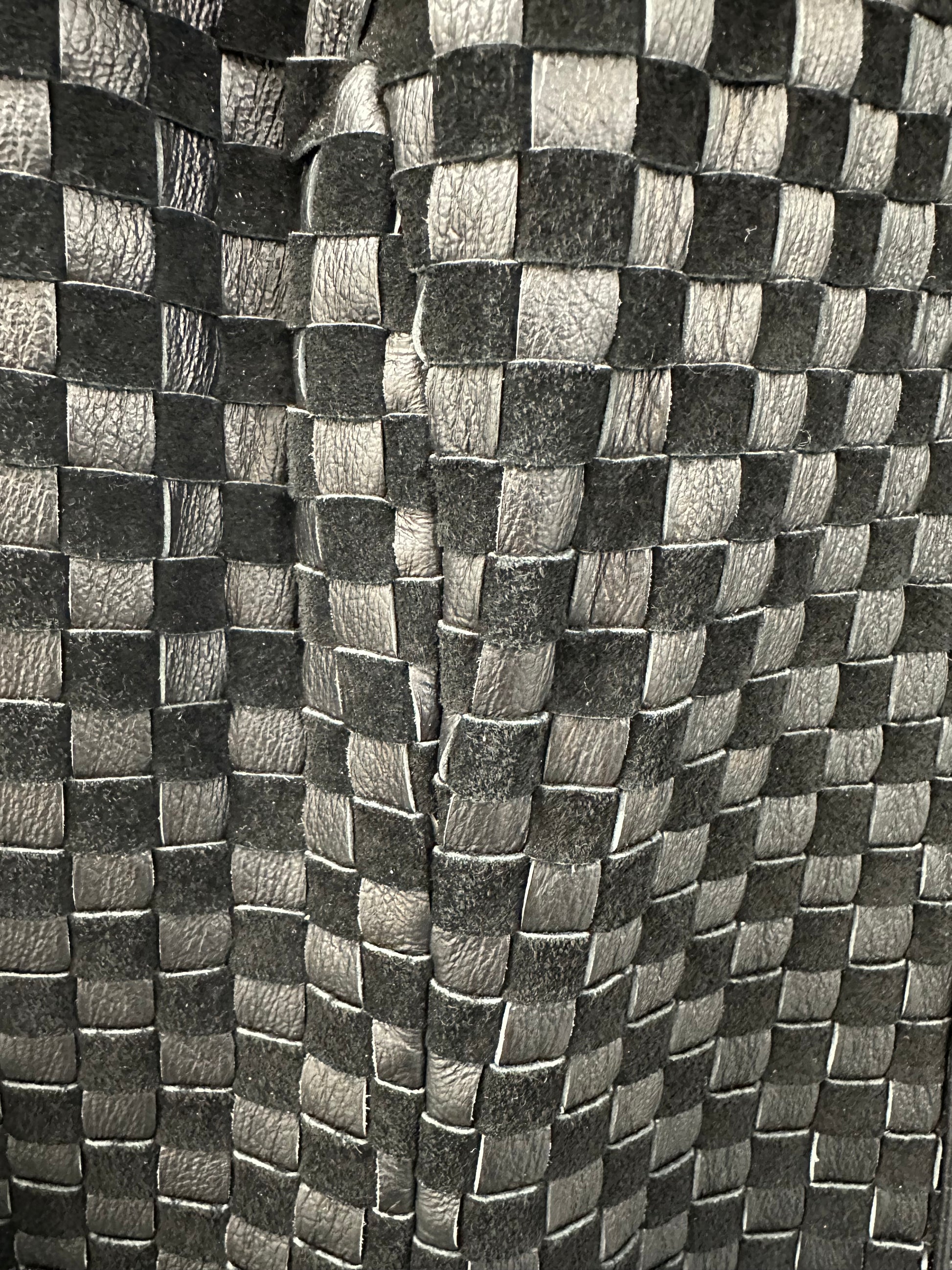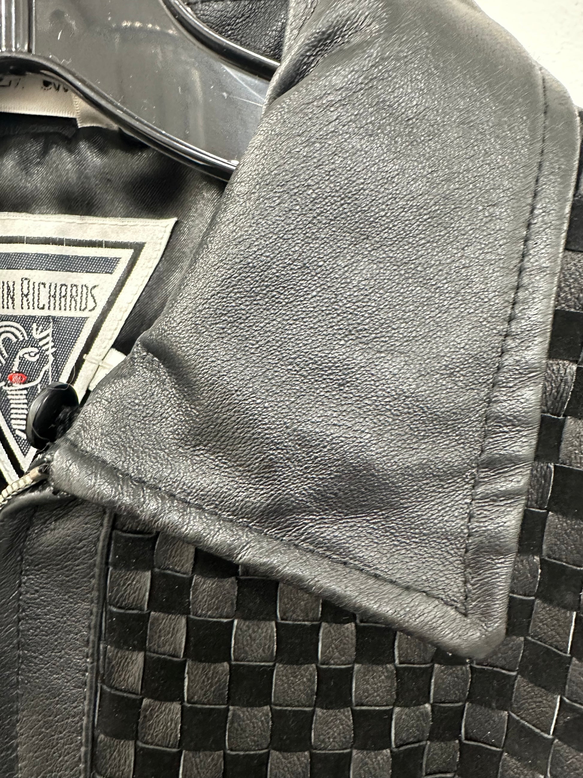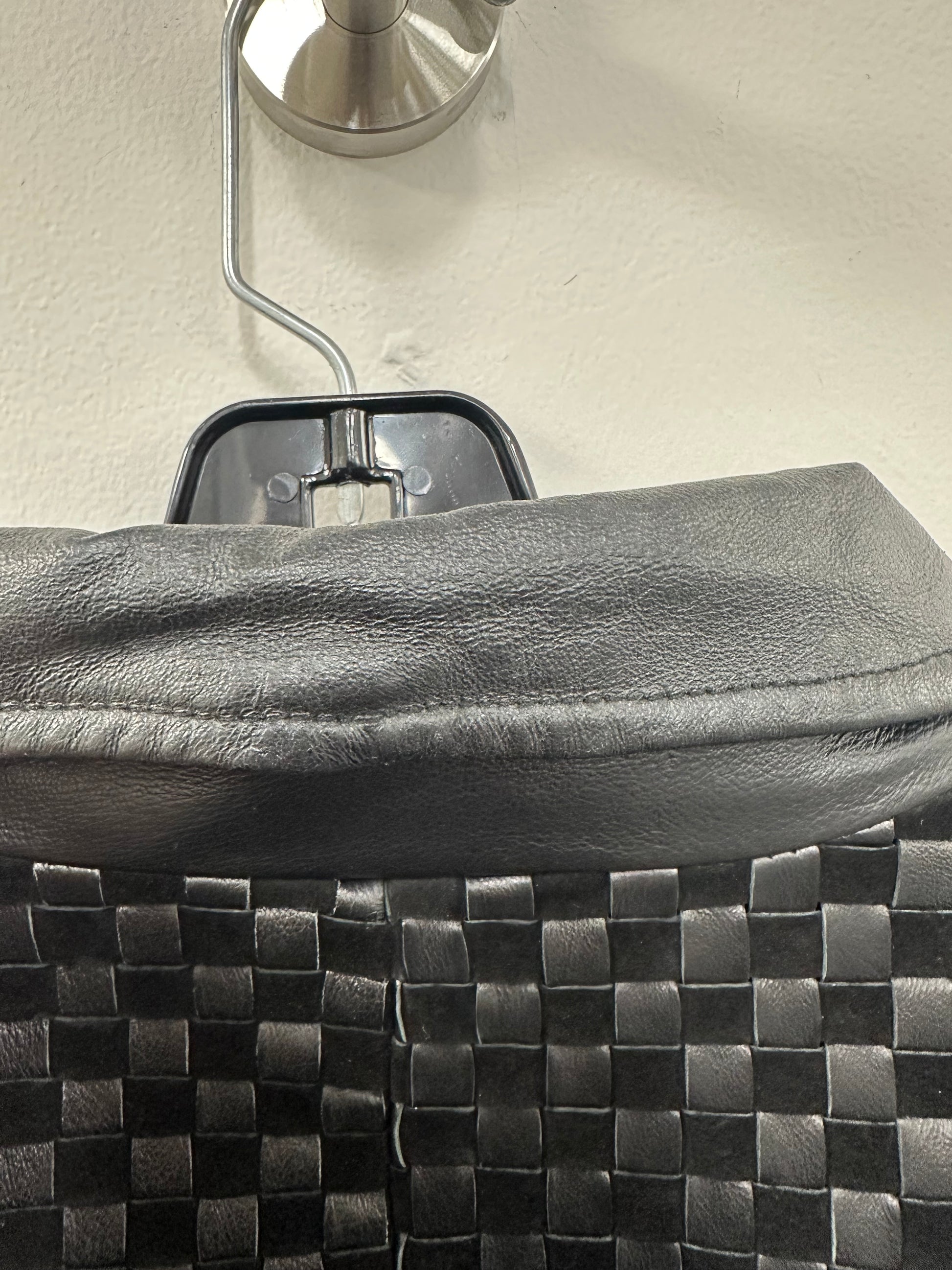 - Black leather unlined and woven, zipper closure, collar, NO POCKETS, buttons to attach a fur collar