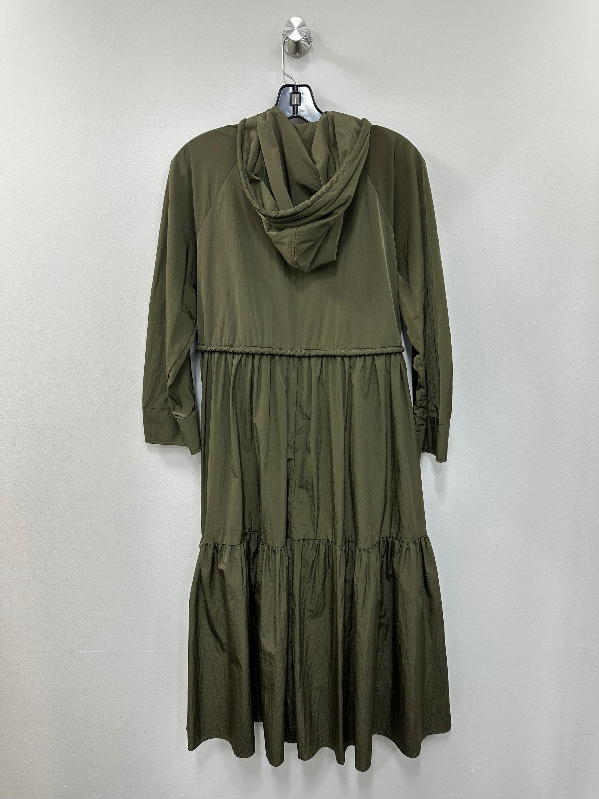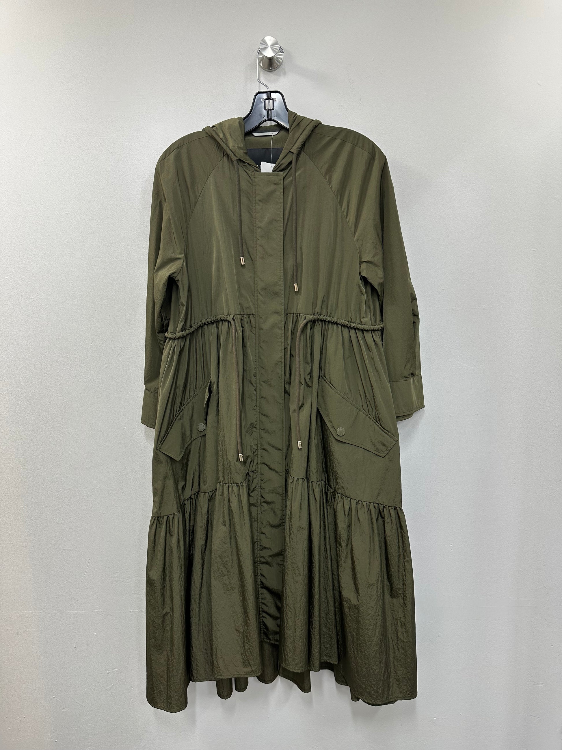 - Long, thin material, tiered, hooded, drawstring detailing, snap and zip closure, pockets