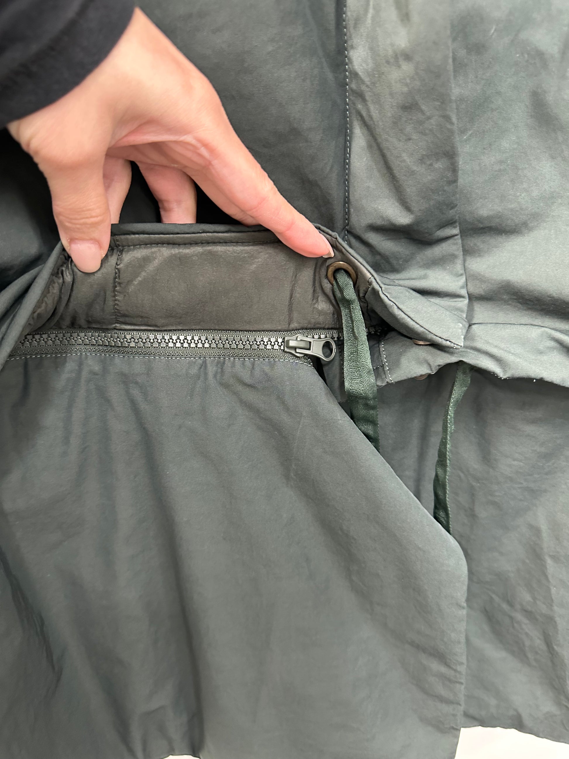 - Has some puff too it, zip and snap closure, pockets, interior zip pockets too, low waist draw string, low waist zips off