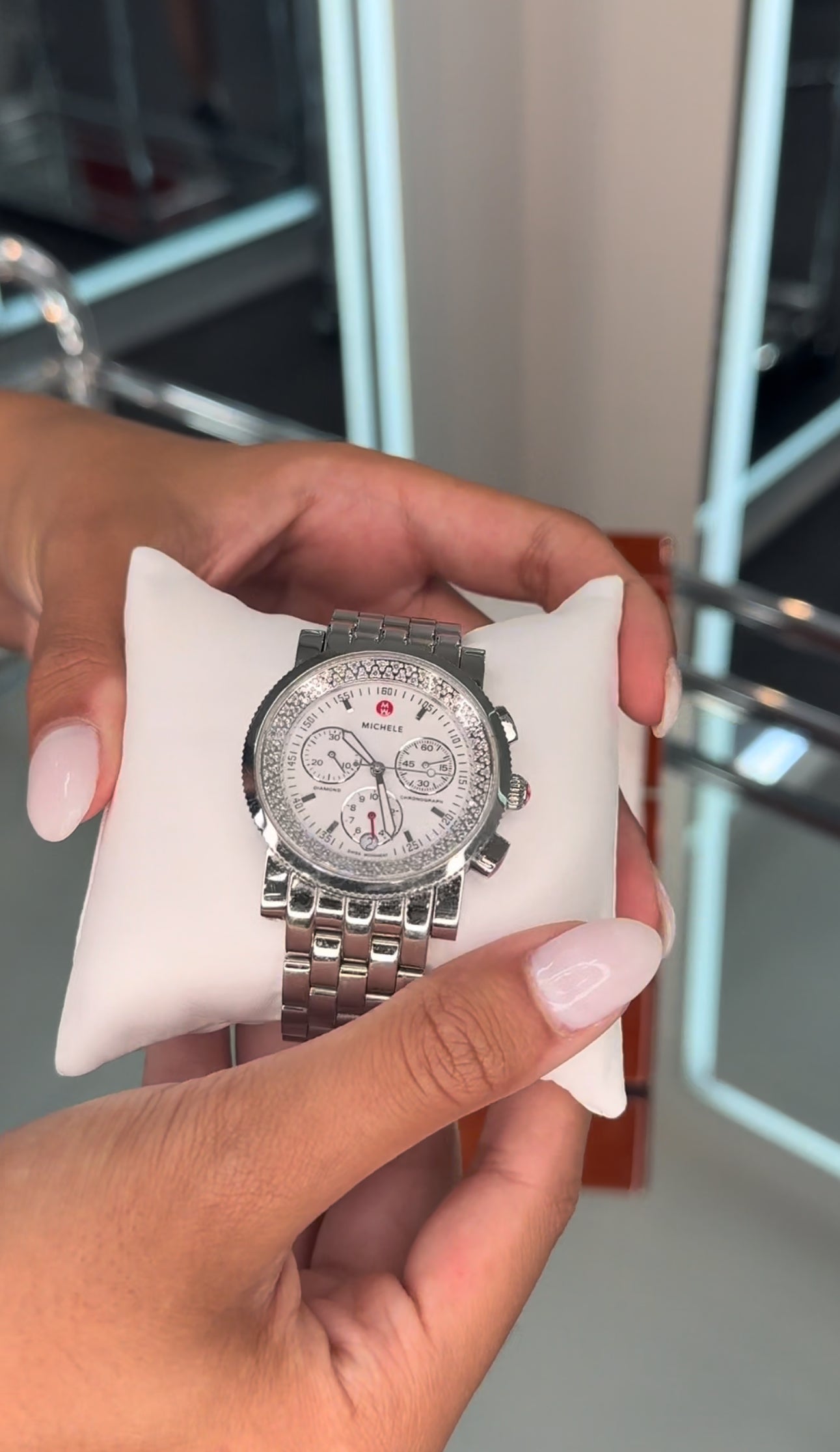 - Stainless steel, quartz movement with chronograph date, smooth and coin edge bezel, butterfly clasp, double row of diamond detailing