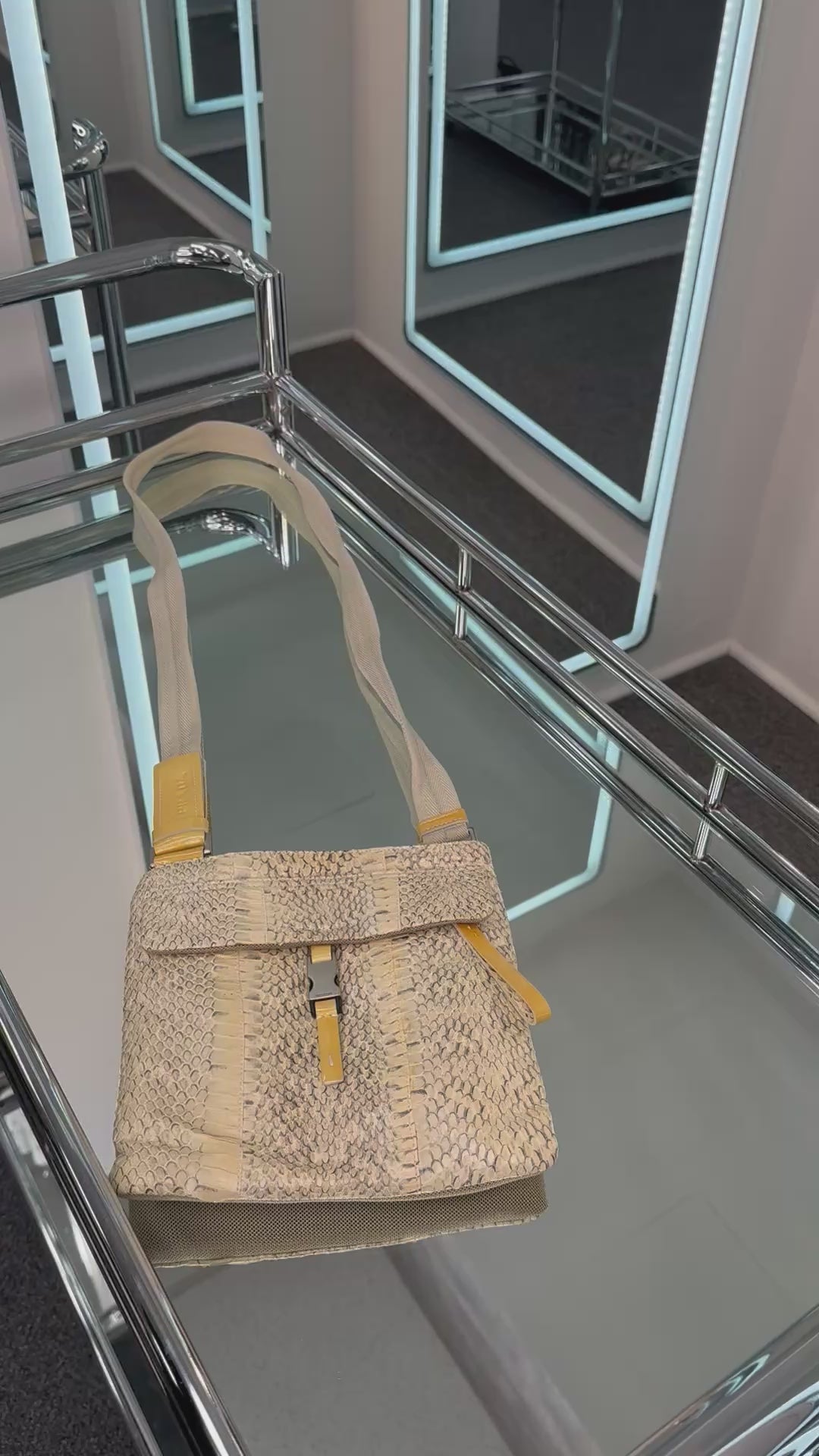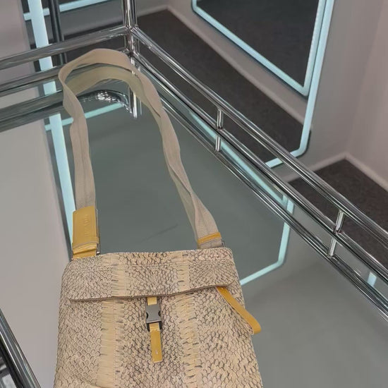 - Beige python, yellow patent leather details, silver-tone hardware, beige mesh nylon, canvas strap, exterior back pocket with velcro closure, front buckle and zip closure pocket, top magnetic snap closure, single interior zip pocket