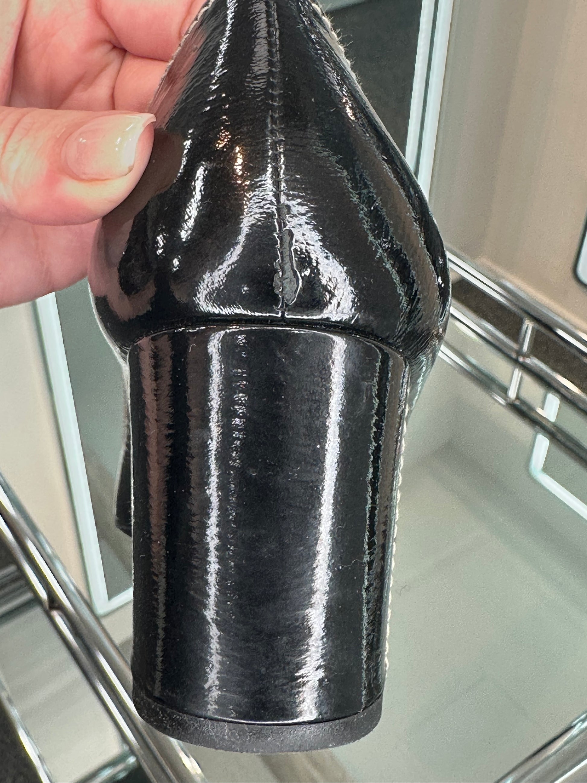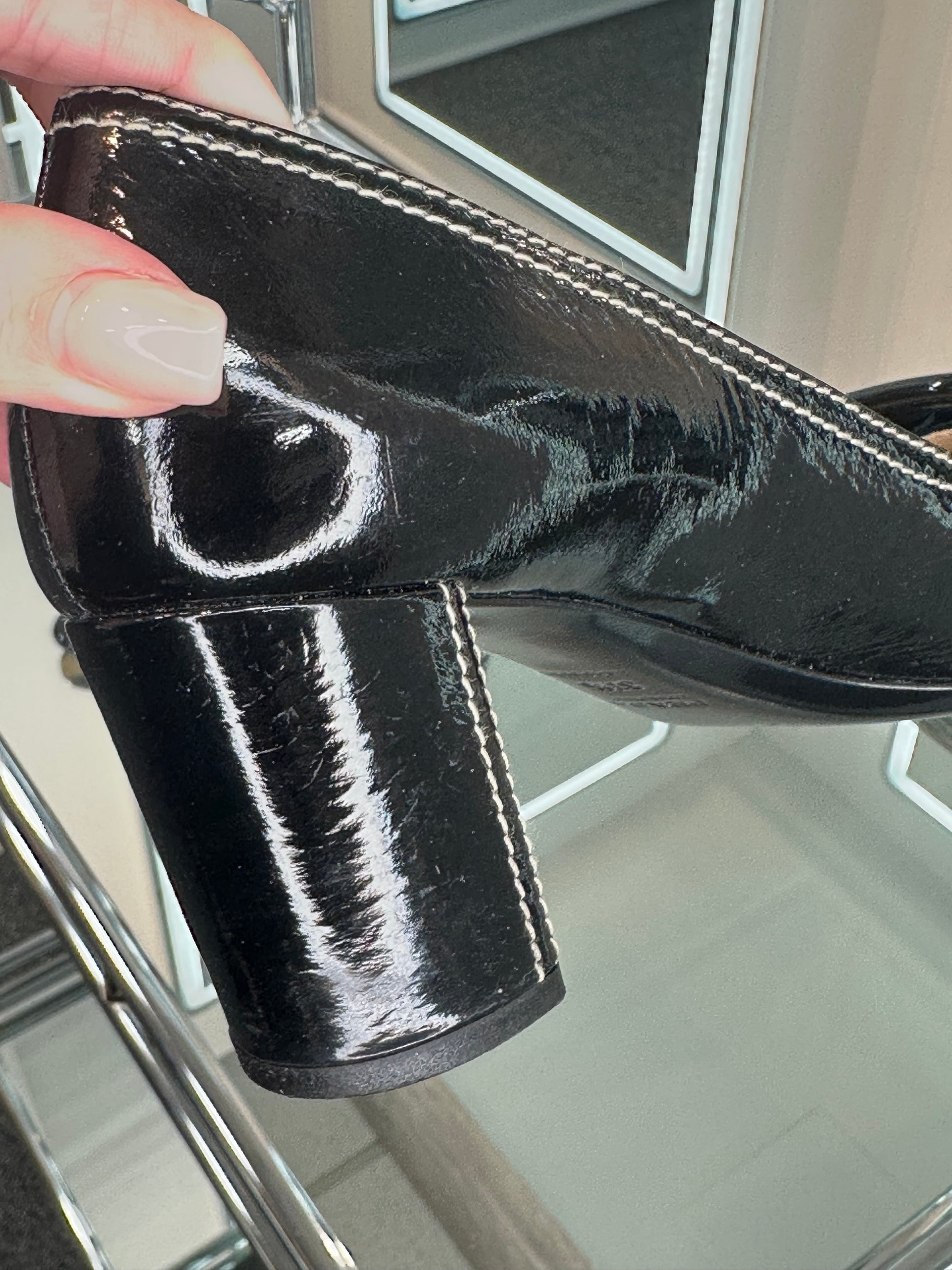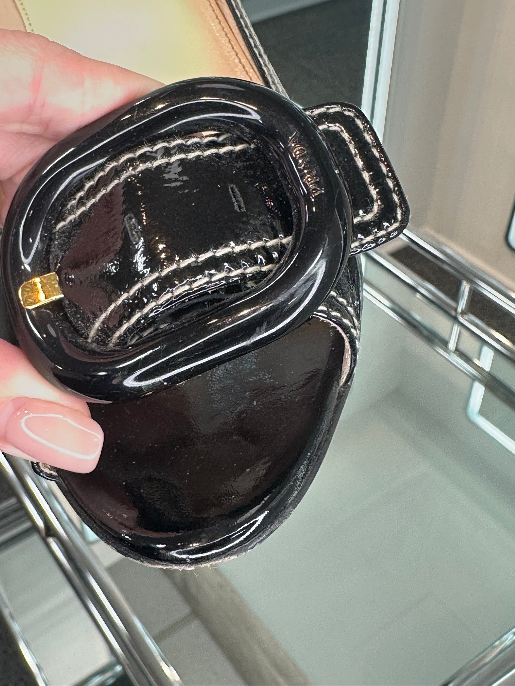 - Black patent, stacked heel, oversized black plastic buckle, cream contrast stitching, gold-tone hardware