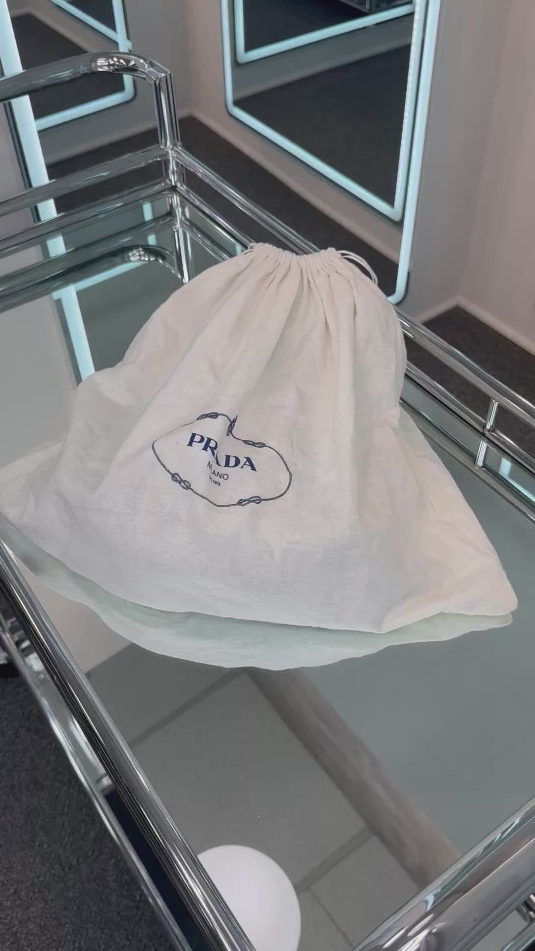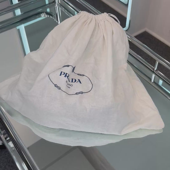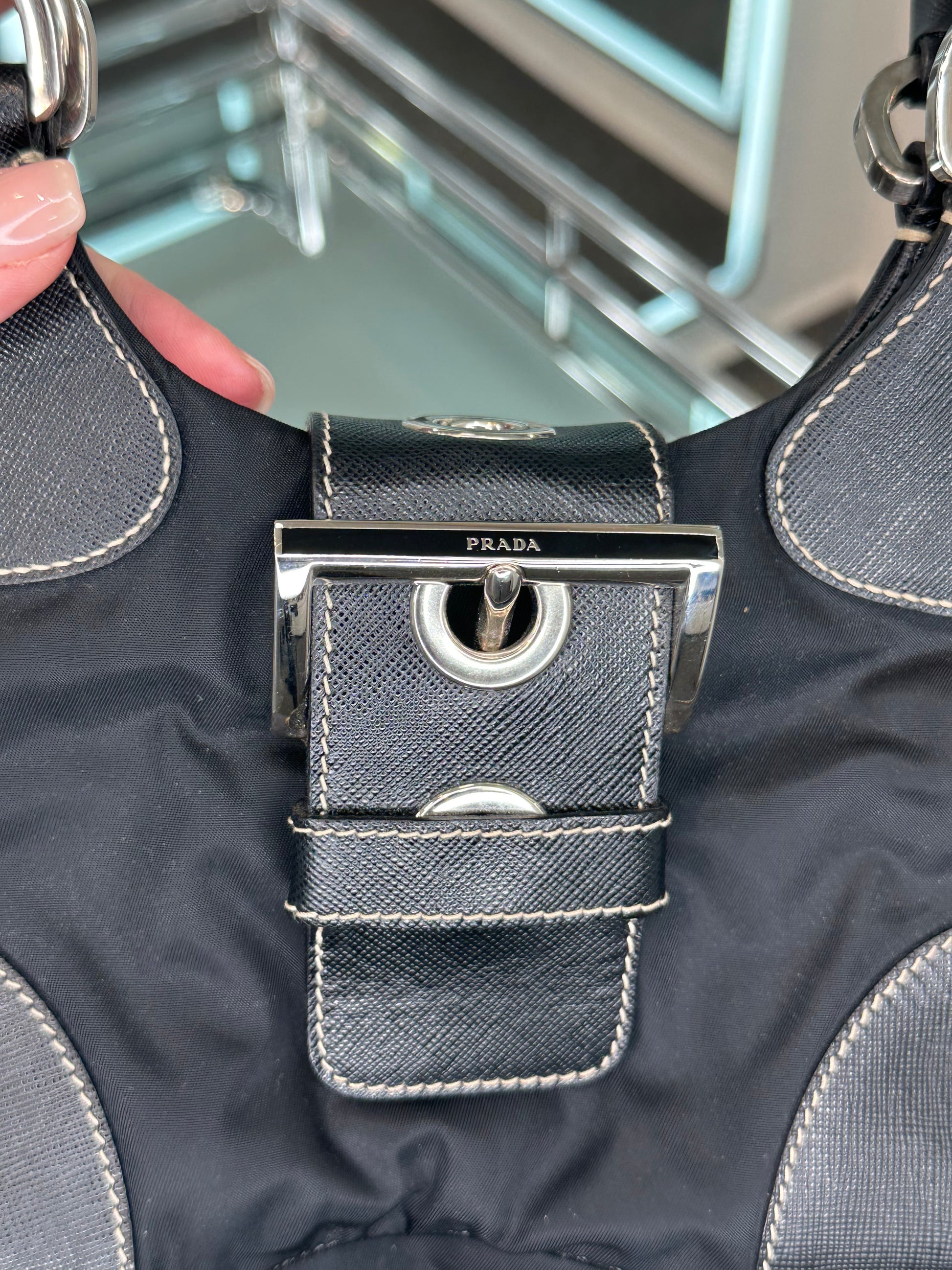 - Black tessuto nylon with saffiano leather trim and details, silver hardware, contrast stitching, snap closure, buckle detail, Prada logo jacquard lining, single interior zip pocket, Prada triangle logo on the side