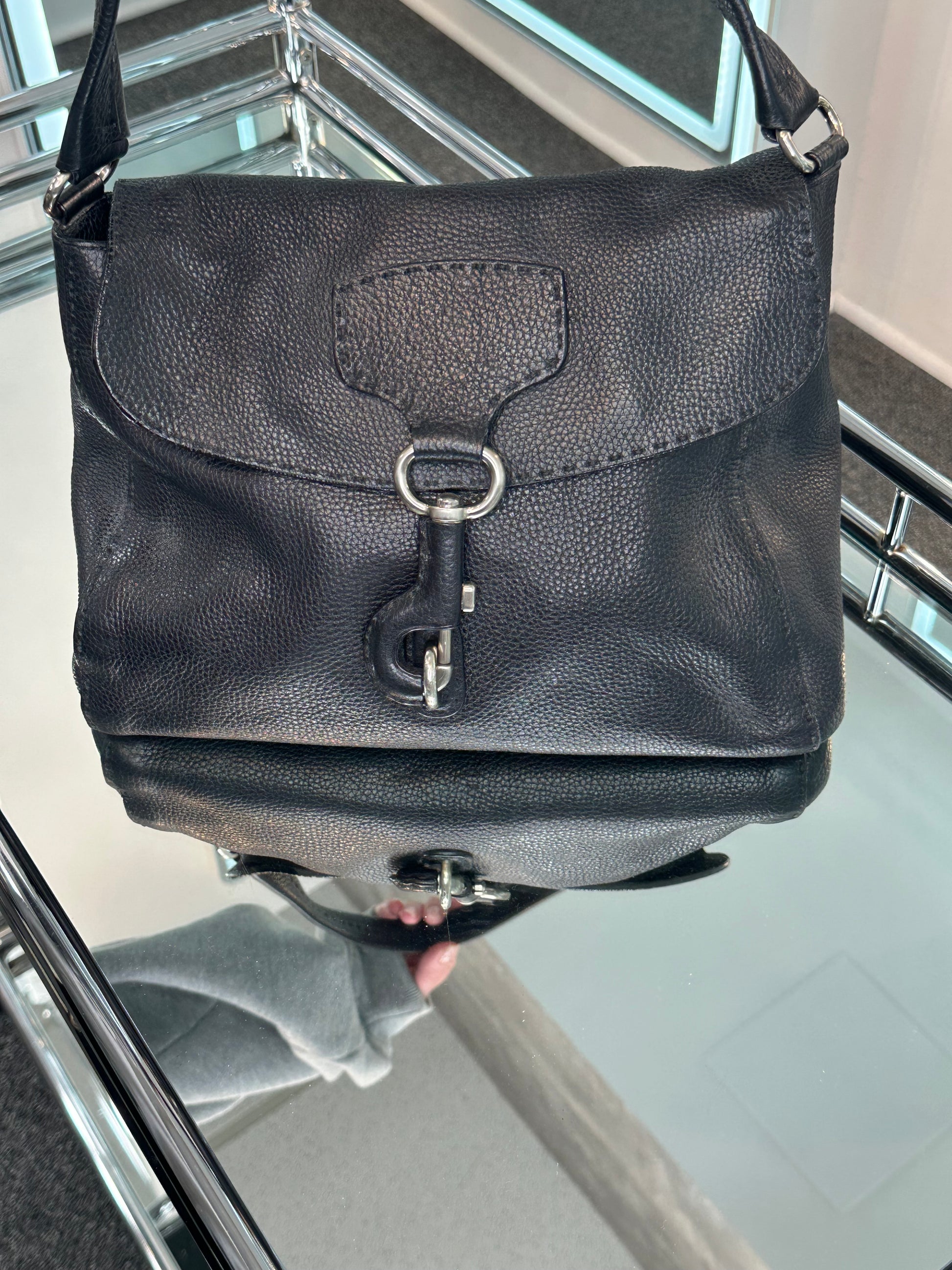 - Black Vitello Daino leather, silver-tone hardware, tonal stitching, single flat strap, clasp front closure, logo jacquard lining, single interior zip pocket