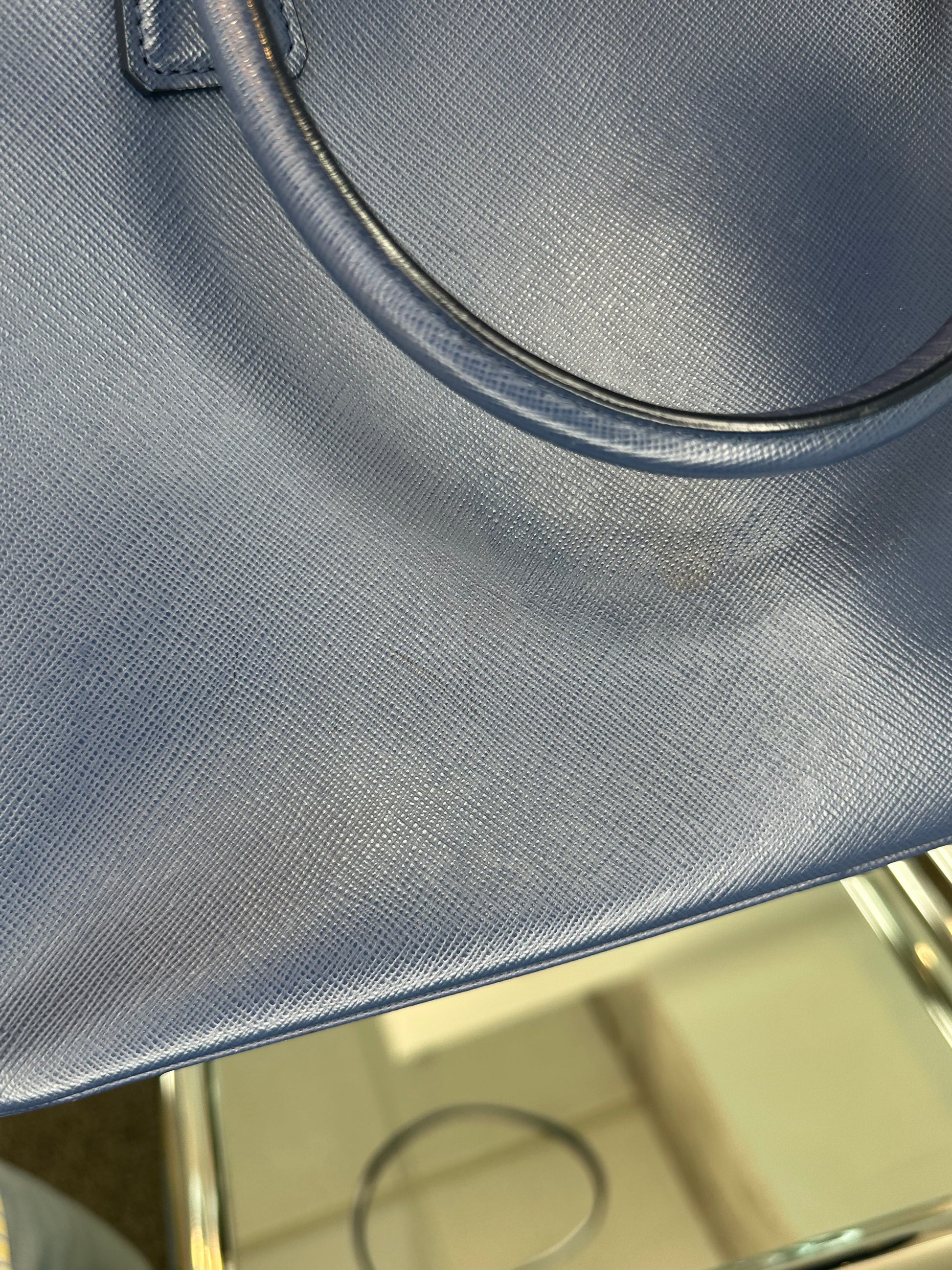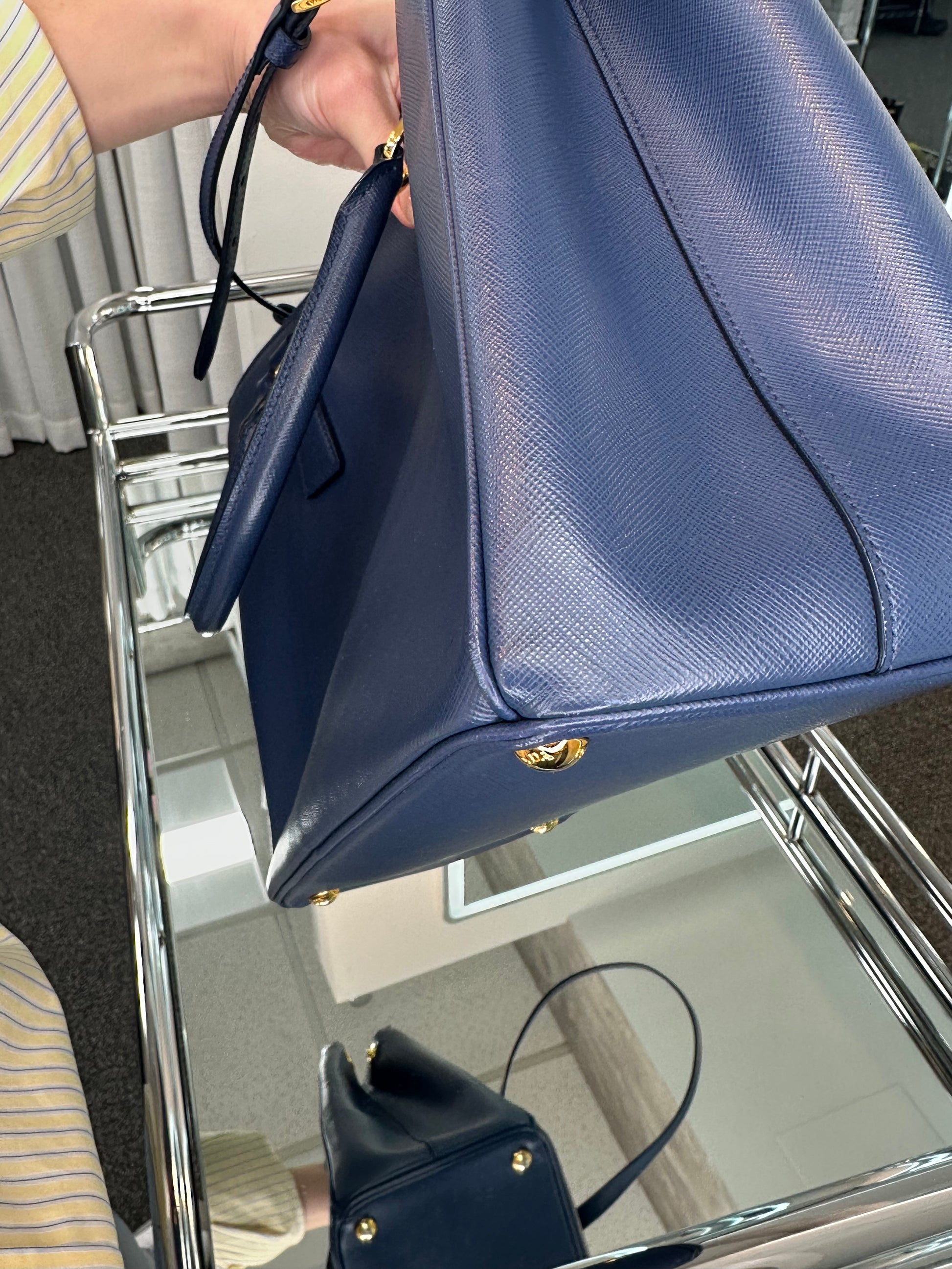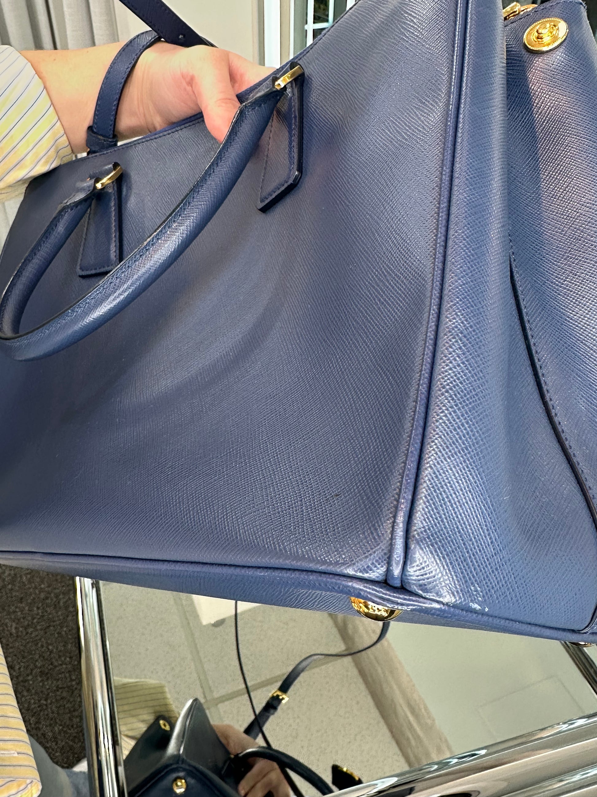 - Blue saffiano leather, gold-tone hardware, dual rolled handles, single adjustable flat shoulder strap, dual zipped pockets, single interior zip pocket, one open pocket, dual open pockets on the opposite side, Prada jacquard lining, open top, protective feet at base