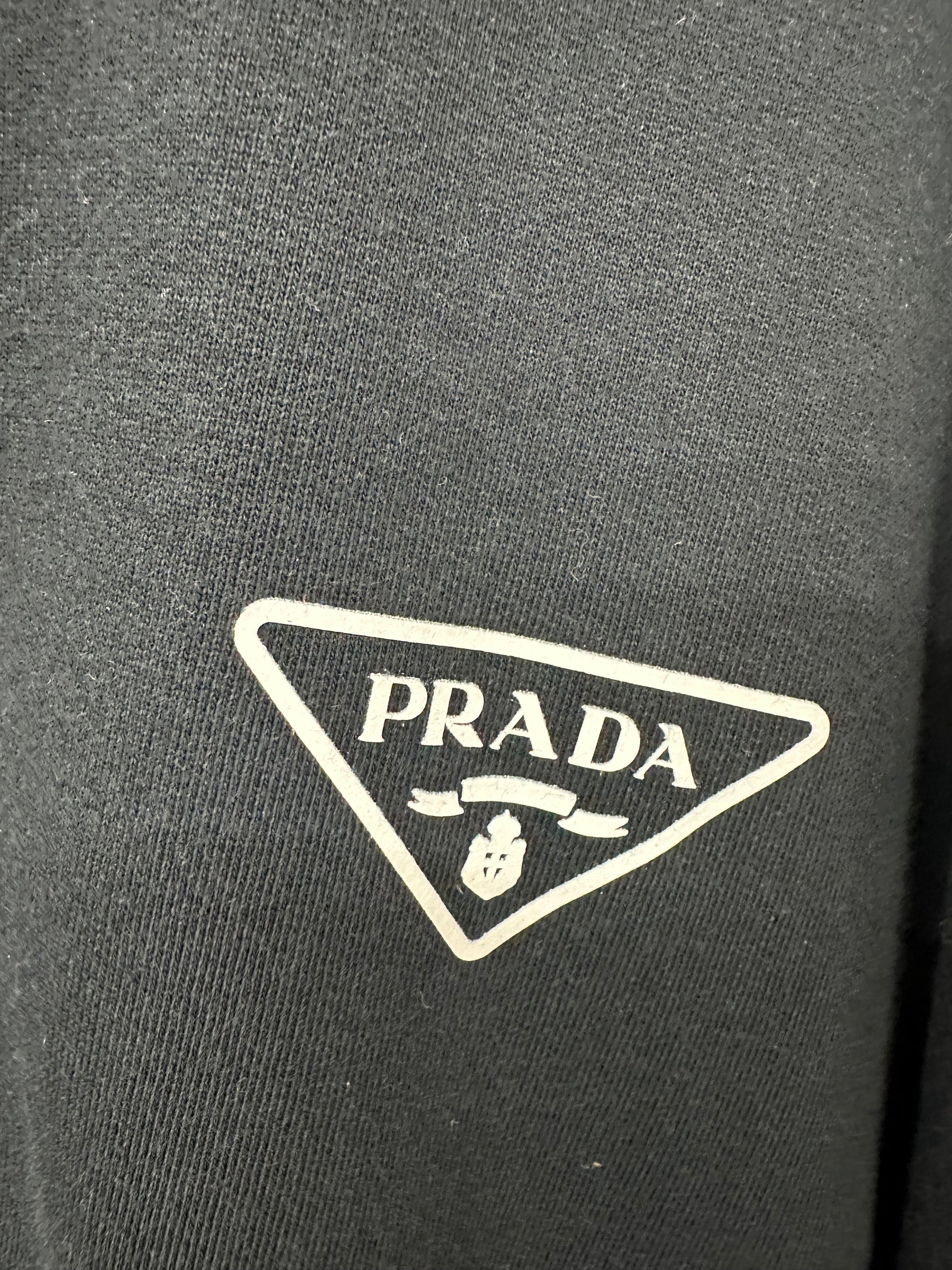 - Black with screen-printed Prada logo, zip up, hoodie, Prada nylon on the hood and shoulders